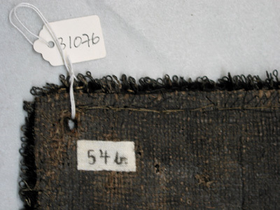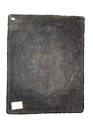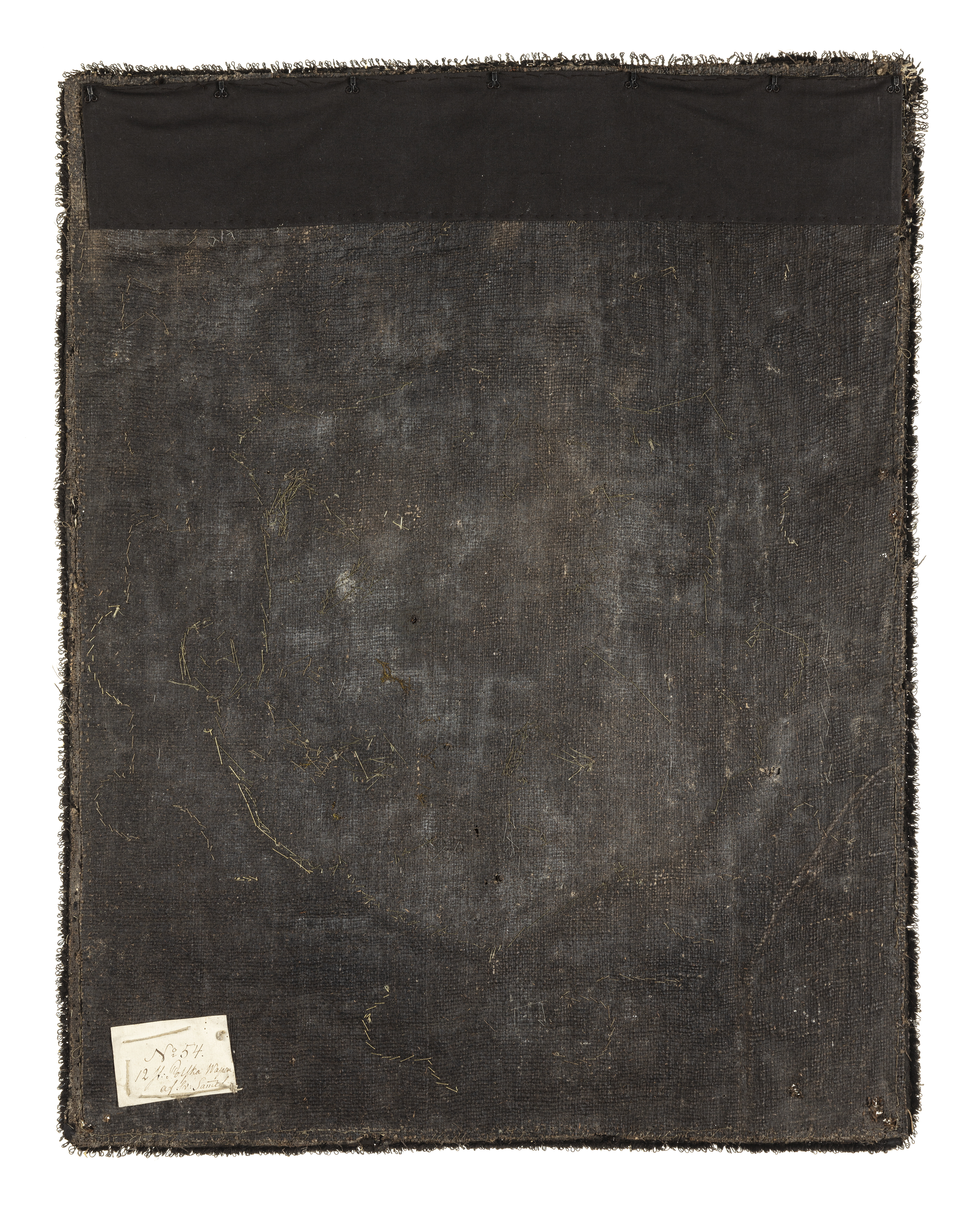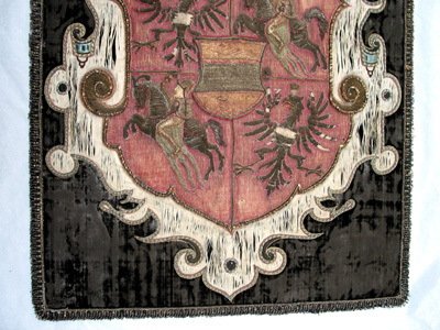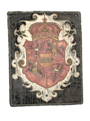 Stående rektangulärt platta av svart, mycket sliten sammet, floret nästan helt borta. Därpå applicerat en symmetrisk rullverkskartusch av vitt siden med kanter och detaljer broderad med guldtråd, kantiljer och ljusblått silke. På kartuschen fäst en förhöjd vapensköld med samma kantning, bottentyget i fälten av grövre tuskafts-siden (?). Kvarderad vapensköld krönt med kunglig krona, alla fälten röda. Fält 1 och 4 Polen, en krönt örn av silver. F'öt 2 och 3 Litauen, en ryttare med lyft svärd, sköld på v arm, ett dubbelt korsat kors. Runt alla kanter en smal frans av guldtråd. Baksidan helt täckt med dubbel, grov, svart vaxduk med synliga stygn från applikationen. I nedre h hörnet fastsytt en pappersetikett med bläckpåskrift: "N:o 54 // 12 st: Polska Wapen // af Swart Sammet".