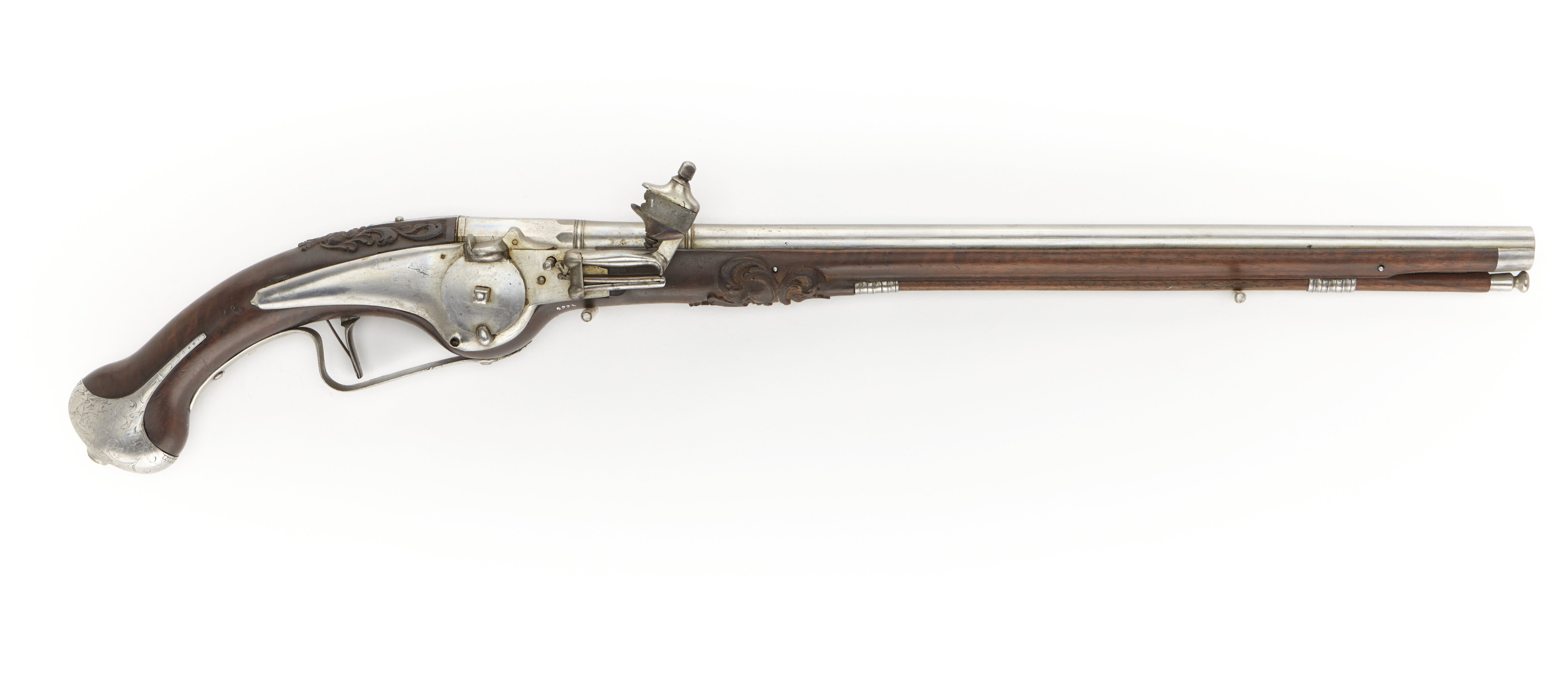 Enligt 1710 års inventarium p. 36, rum II, tillsammans med inv.nr 5992: "5-10-1 Par D:o (pijstoler) långa walnötestockar något utskurna Jern Cappor och Hättor på låås skrufwarne under Garneringen Jan Knoop Utrecht". Rund, över kammaren åttkantig, slätborrad pipa av stål med ett smalt, sextonkantigt parti. På kammarens undersida är signerat: "CI" (?). Två häften. Hjullås med välvt låsbleck, utsvängt för hjulet. Hjulet är fäst med krampa kl. 6. Låg, rak krutskärm. Rak tryckknapp. Hane med lös underkäke. Nedanför hjulet, till vänster, finns ett hål för att se om hjulet är spänt. Tre låsskruvar. Brun helstock av valnöt. Kolven är utsvängd för hjulet. Oval kolv med kolvkappa av stål med långa, smala flikar. En något förhöjd centrumplatta med etsade blad runt om. På kolvkappans sidor finns etsade gestalter och akantusrankor. Det finns snidade akantusrankor även kring svansskruvbladet liksom vid laddstockrännans slut. Genombrutet sidbleck av stål med etsade putti, akantusslingor och ett språkband, varpå är graverat: "JAN KNOOP UTRECHT" (se Stöckel I, p. 155, Jan Knoop, cirka 1650-1670). Två profilerade rörkor och ett slätt näsband av stål. Plan varbygel av stål, vinklad med en bakåt utdragen skena. Avtryckare med egen fjäder. Tillbehör: Laddstock av valnöt med doppsko med en kulformad ände av stål. Blymantel. Märkt: 10 (ursprungligen 11) bakom låsblecket, stanstyp 5376. 13 ristat på kolvens vänstra sida.