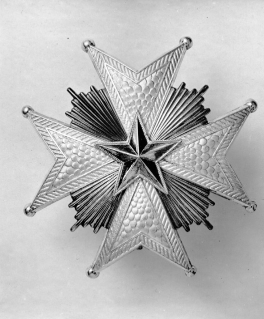 Malteserkors av silver, armarna med fjälldekor, därutanför kantbård med repstavsdekor, kulor på spetsarna. Mellan armarna nio släta, rundade strålar av olika längd. Mittpå en femuddig fasetterad stjärna med repstavskant, fastskruvad från baksidan. Baksidan slät med runda muttrar för fästning av stjärnan och strålarna mellan korsarmarna. Vertikalt placerad säkerhetsnål, på nålfästet stämplar: CFC, tre kronor, S, S:t Erik, S 7 (C F Carlman, Stockholm 1920).