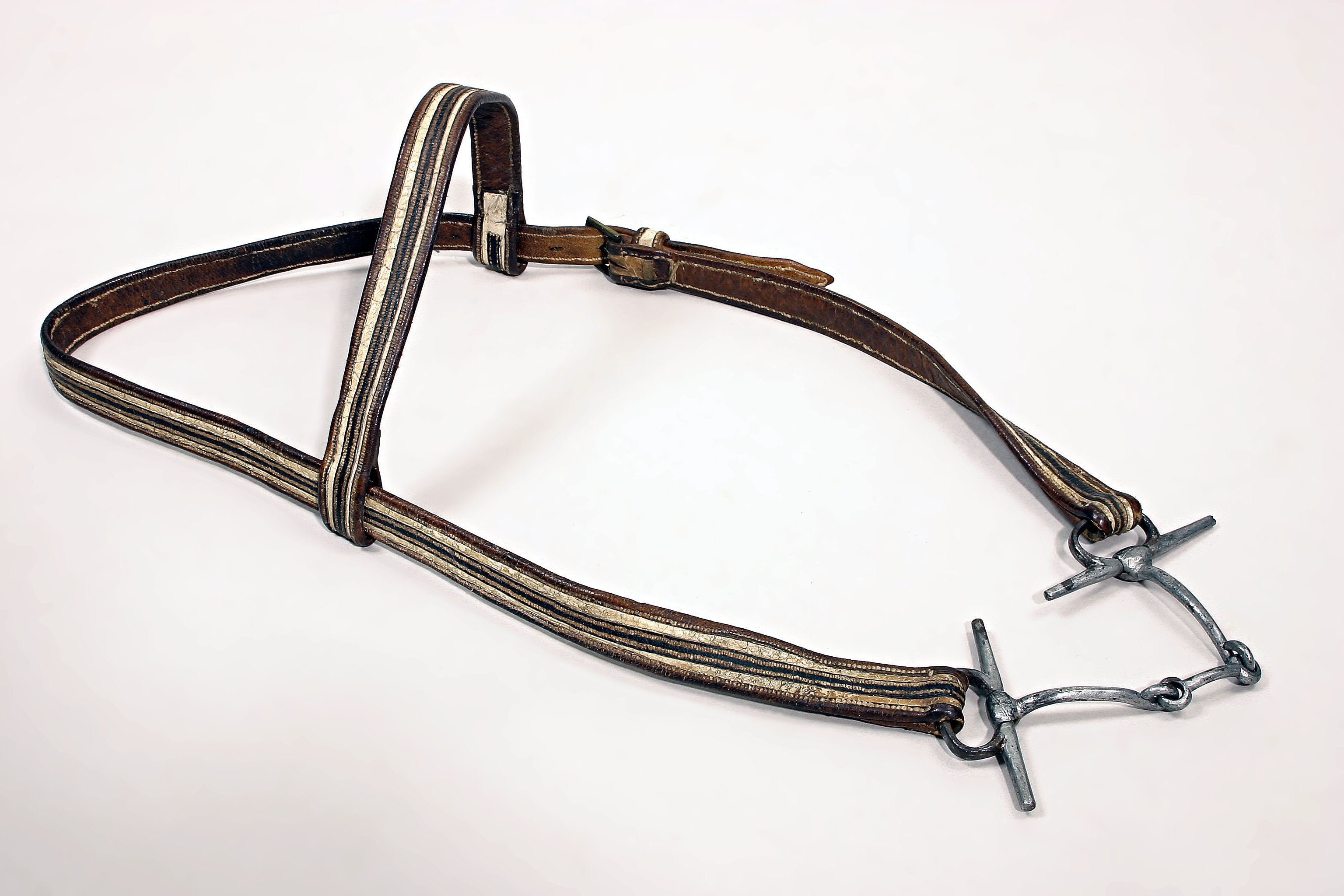 Tredelat, ledat munbett av stål, tygelringar med stänger, förtent. Sidostycken övergående i nackrem, med påträtt pannband, allt av 22 mm br. läderrem med dekorsömmar och längsgående svarta och vita målade ränder. På ena sidostycket en rektangulär förgylld mässingssölja.