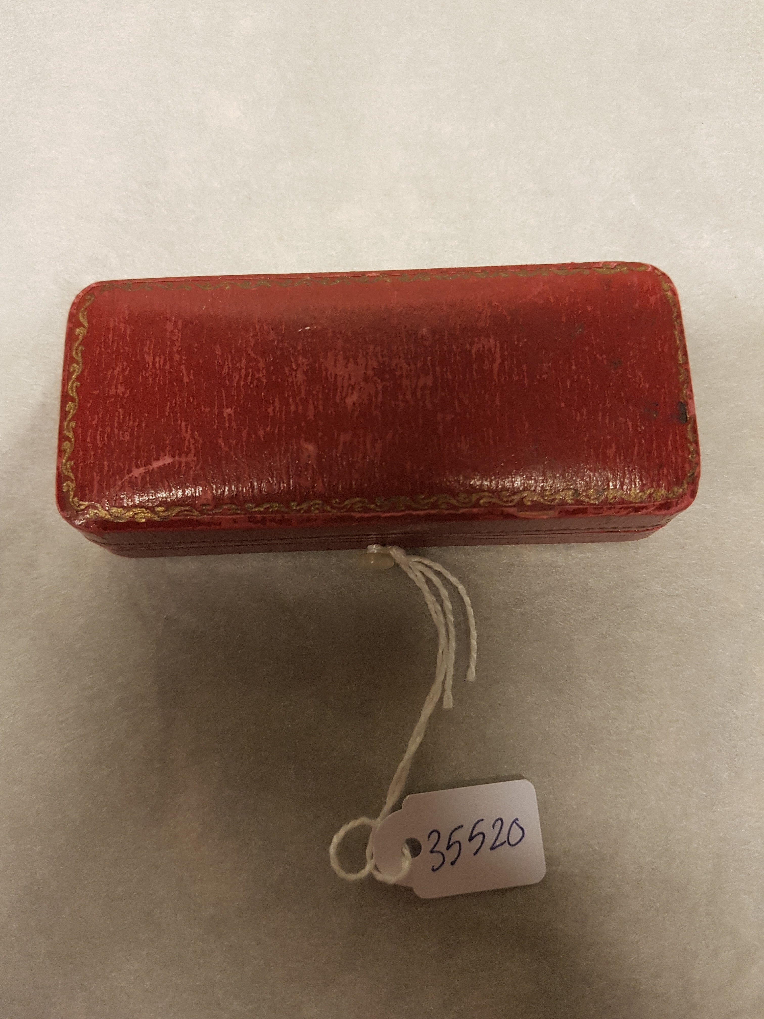 Rektangulärt etui, utvändigt klätt med röd marokäng samt med guldpressad dekor längs med lockets kanter. Invändigt klätt med orangegul textil, underdelen med urtag. Pärlemorskimrande knapp för låset på långsidan mitt fram. Hör till kråsnål (35519), men troligen ej ursprungligt.