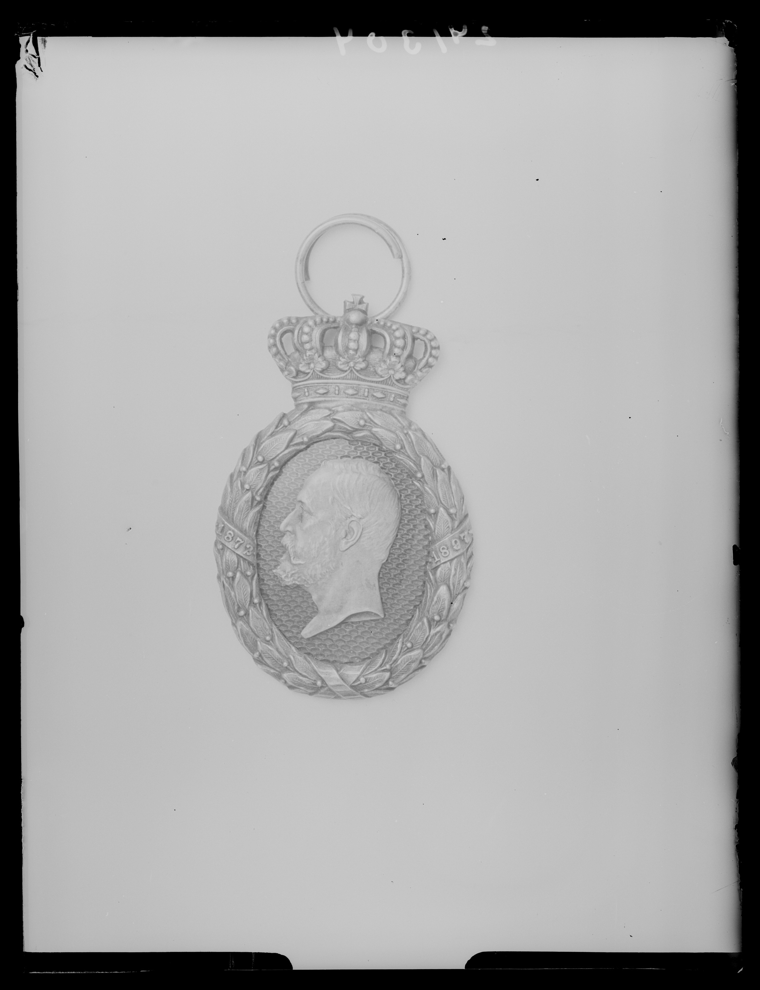 Oval täckt av mörkblå, genomsynlig emalj, därpå reliefporträtt av silver av Oskar II, halsbild, profil vänster. Runt ovalen lagerkrans av silver, omlindad med band med årtalen 1872 och 1897. Krönt av kunglig krona av silver, bakom kronan bygel, däri fäst spiralformig ring av silver. Baksidan av tecknet slät.