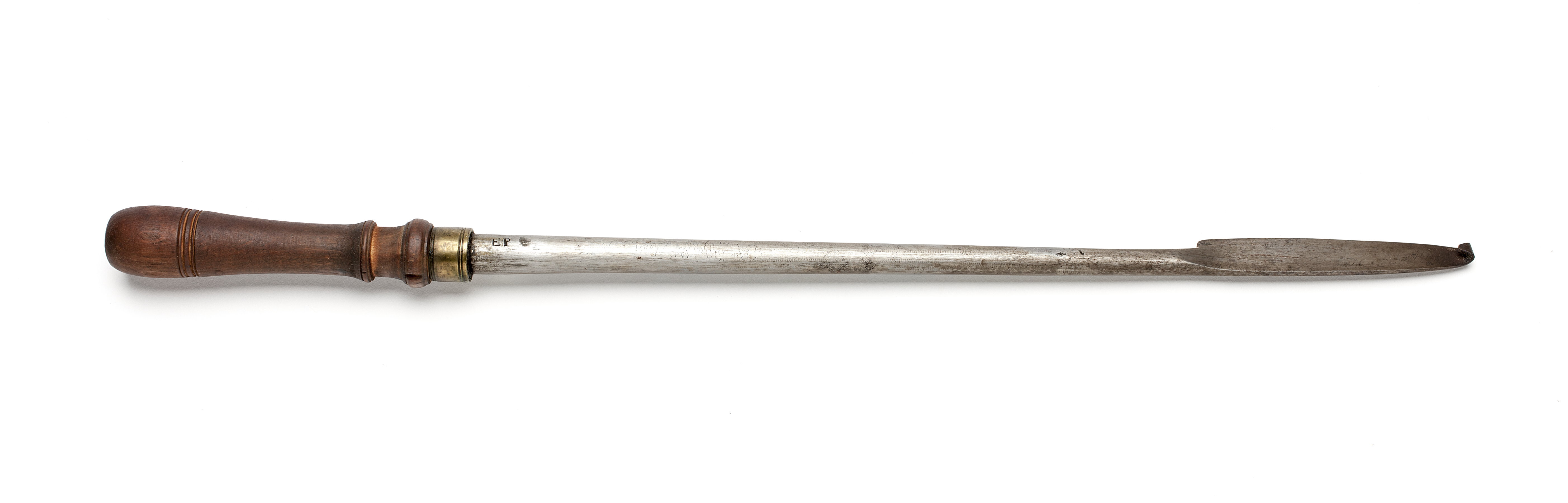 Rund klinga med tillplattad och böjd ände. Stämplat på klingan: "EP". Svarvat skaft av päronträ, med två vulster nedtill (rydboholmstyp). Mässingsring. 1930 kallat insnidarejärn.