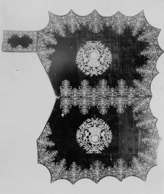 Fragment: Delar av guldbroderi.1998-07-28.ack Bottentyg av svart sammet i kypert. Söm längs mitten. Ca 500 mm breda våder över bredden. Sidorna och bakre kanten avslutade i spetsiga uddar, mellan spetsarna 250 till 300 mm, urtagen ca 50 mm djupar. Broderi av guldtråd i läggsöm och plattsöm. En bård med symmetriskt stiliserat akantusmönster, varannan akantus 300 mm hög, varannan 130 mm, utgående från ytterkanterna och mittsömmen, diagonalt från hörnen. Bogstyckets akantus 110 respektive 70 mm höga och de diagonala 150 mm. På vardera halvans mitt drottning Kristinas monogram i applikation. I en lagerkrans ca 450 mm i diameter ett 150 mm högt C fyllt med bottenbroderi av silke i olika blå nyanser och guldtråd, krönt med 150 mm hög kungakrona av guldtråd och ljusblått silke, ett 150 mm högt upprest lejon på var sida. Varje udd har avslutats med en tofs. Längs främre kanten rester av svart tyg som klätt kanten. Foder av linne i tuskaft. Fem lädertampar med mässingsringar längs fodrets högra sida, en under varje udd. Ett gult linneband 25 mm brett, ca 500 mm långt fäst på mitten vid framkanten. På framkantens högra sida två ca 80 mm långa hankar av gult linneband. På bogstyckets fria kortsida två stycken ca 40 mm långa hakar.