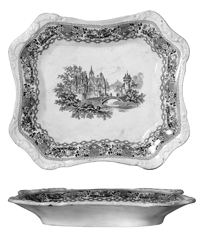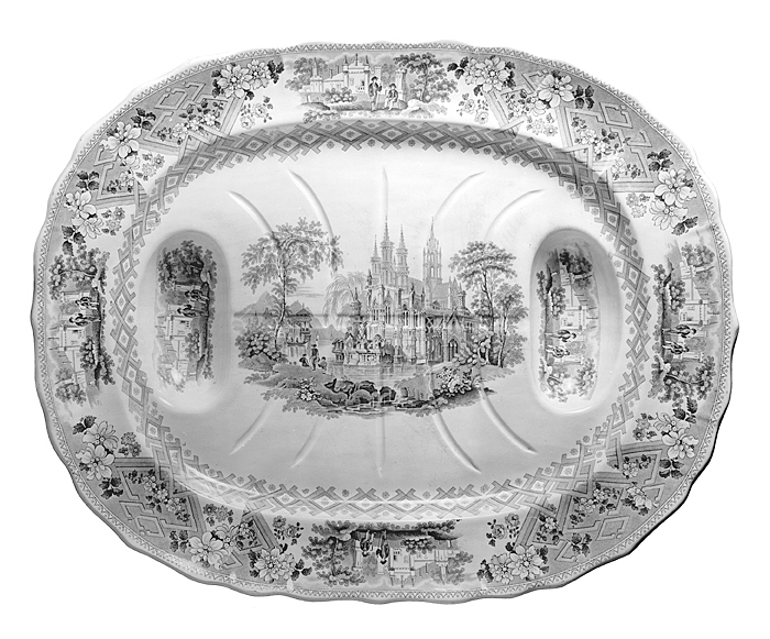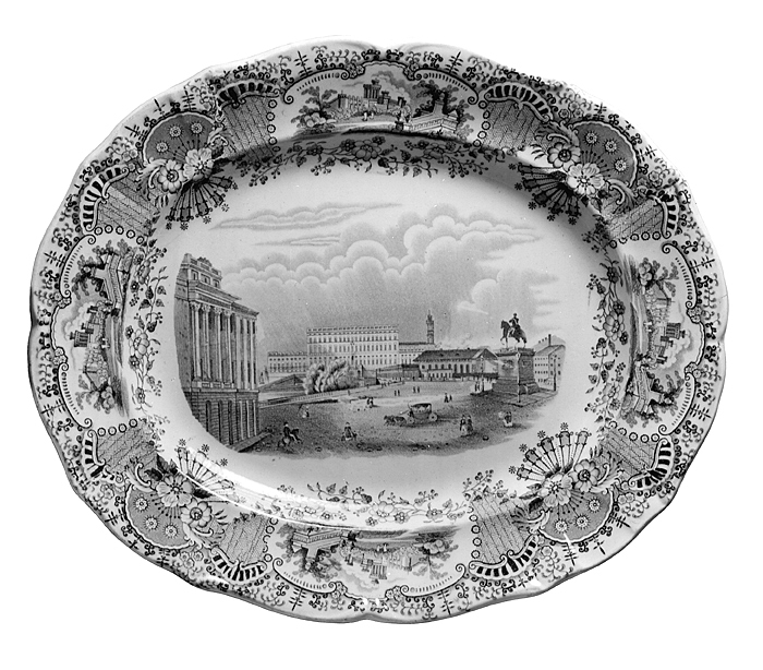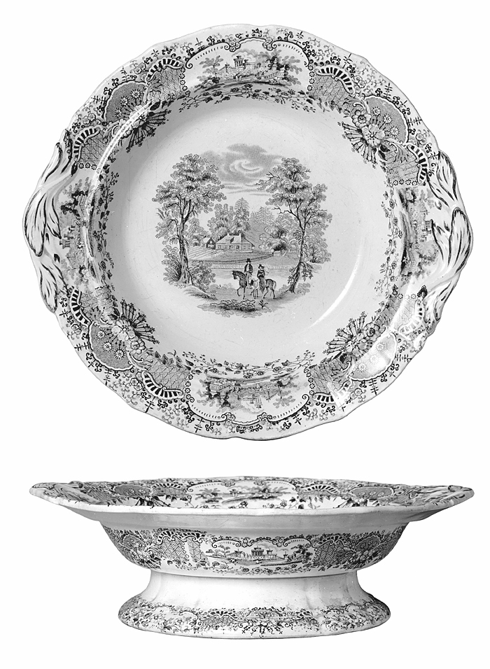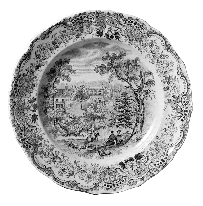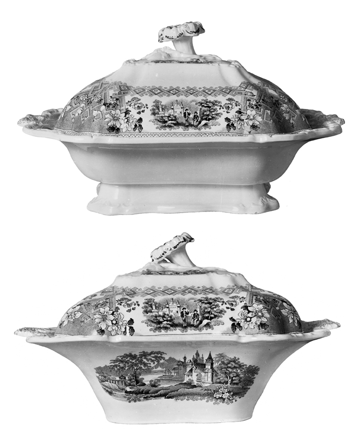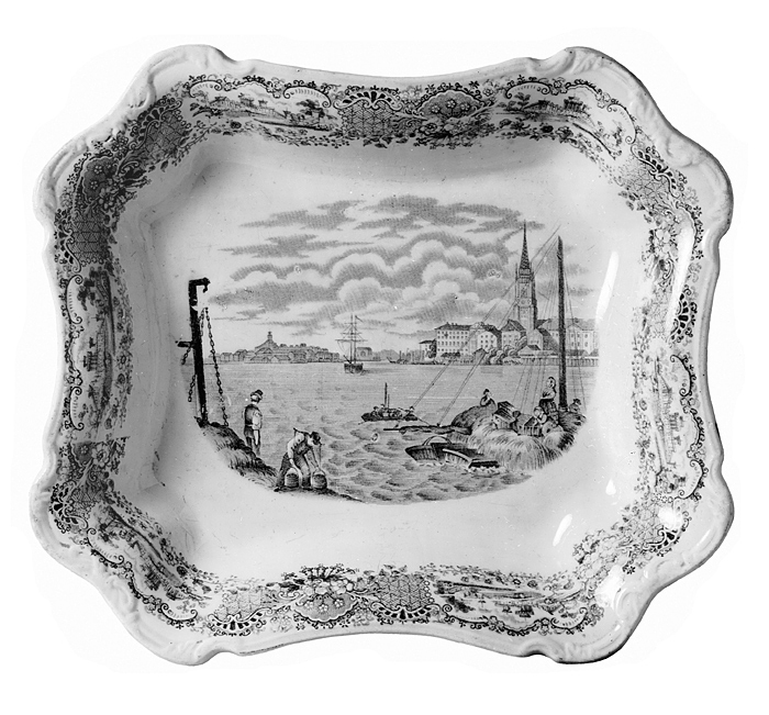 - Af s. k. fin fajans (hvitt lergods, öfverdraget med blyglasyr). Bestående af en rund och en konturerad fyrsidig soppterrin, den senare med fat, båda med lock, två större karotter med lock, två mindre karotter med lock, nio låga karotter utan lock, två skålar, två större stekfat med fördjupningar för sås, två större rundadt fyrsidiga stekfat, ett mellanstort dylikt, fem mindre dylika, tre större ovala stekfat, två mindre dylika, åtta större grönsaksfat, tre mindre dylika, tre saladiärer, etthundratrettiotvå flata tallrikar, trettioåtta djupa tallrikar, sex desserttallrikar samt tio assietter. Å samtliga föremål inpressadt fabriksmärke af någondera typen: dessutom inpressadt formnummer o. d. Dekor: Tryckt i grönt under glasyren, dessutom å soppterriner, karotter, skålar och saladiärer reliefmönster. Gemensam dekor: Å samtliga pjäser ett mönster af en landskapsbild inom en bård; detta mönster i två typer. Typ i bestående af motiv från Stockholm eller dess omgifningar; de från Djurgården ur: »Stockholms pittoreska omgifningar tecknade efter naturen, lithographierade samt Hans Kongl. Höghet Kron-Prinsen af Sverige och Norrige Joseph Frans Oskar i djupaste underdånighet tillegnade af C. J. Billmark», Paris 1834 (Carl Johan Billmark, f. 1804, d. 1870, sedan 1833 bosatt i Paris); öfriga motiv efter litografier af Gustaf Söderberg (1799—1875), Wilhelm Heinemann (verksam i Stockholm omkring 1830) samt Lars Teodor Billing (1817 —1892). Motiven förekomma i samband med en bård med väfliknande partier af tätt ställda vinkelböjda ränder, dessa partier omväxlande med blombuketter och upptill begränsade af bågböjda musselliknande ornament; dessutom i bården utsparda bildfält, hvari fantasilandskap med tornbyggnader med platta tak. Typ 2 bestående af en gotisk kyrkobyggnad invid ett vatten, hvaröfver en bro; motivet förekommer i samband med en bård af blommor, mellan hvilka utsparda bildfält, i dessa ett fantasilandskap med trappgafveln af ett hus synlig; bården å utsidan begränsad af en rad utåtvända små spetsiga uddar, mellan hvilka små ringar; utmed insidan en rad sammanhängande rombiska rutornament med rosetter. Soppterrin, rund, med lock: Klockformig, på utsvängd fot; handtag två, motsatta, med flackstafvigt tvärsnitt samt uppåtsvängda. Dekor af typ 1: Å bräddens insida samt nedtill å foten bården, å det senare stället dock utan bildfält; å handtagens utsida ett mönster, liknande delar af bården. Å utsidan två motsatta bilder af Gustaf Adolfs torg: till vänster gamla Operans fasad, till höger Gustaf II Adolfs staty, därbortom Hofstallet, i bakgrunden Kungl. Slottet. Motivet efter litografi, kallad »Kungliga Slottet i Stockholm», af Wilhelm Heinemann samt ingående i en serie som n:r VI. Å bottnens insida ett Djurgårdsmotiv: i förgrunden Saltsjön med två båtar, den hitre seglande mot åskådaren samt med svensk-norsk unionsflagga, i bakgrunden en strand med villabyggnader (Listonhill, Alnäs). Motivet efter Billmark, å original-litografien text8. Listonhill, Alnäs. Lock (ej original): Lågt kupigt, med utstående kant, hvari en rundad urtagning för soppslefven; sarg något inåtfallande. Knopp i form af en frukt (färskt fikon) med löf. Å kantens utsida bården. Frukten (knoppen) jämte löf med kantmålning (s. k. kamning). Höjd: 25 cm.; utan lock, höjd: 16 cm.; diameter: 24.3 cm. Lock, höjd: 10.5 cm.; diameter: 25.5 cm. Anm. Knoppen afslagen och fastsatt. Soppterrin, konturerad, fyrsidig, med lock och fat: Något långsträckt, med vulstig öfverdel, vulstigt indragen nederdel och insvängda sidor samt på konturerad utsvängd fot, hörnpartierna tvåpassformiga; brädd utsvängd, konturerad, å insidan en fals för locket. Å hvardera kortsidan ett uppsvängdt handtag med bladformig öfverdel, Dekor af typ 2: Å bräddens insida och fotens öfverdel bården, å handtagens öfverdel kantmålning. Å hvardera långsidan samt å bottnens insida det gotiska kyrkomotivet, å det senare stället af något varierande typ. Lock: Med vulstig kantprofil och indragen rektangulär plan öfversida samt kontureradt efter terrinen; i ena kortsidan en rundad urtagning för soppslefven. Knopp i form af en uppstående blomma med nedåtvikna kronblad; blomman på stjälk i relief, å denna äfven en mindre blomma. Å kanten en bred bård af typ 2. Vid hvarje af öfverdelens kanter en långsträckt mindre landskapsbild med figurer. Blomman (knoppen) med kantmålning. Höjd: 26.5 cm.; utan lock, höjd: 18.5 cm.; längd, med handtag: 35 cm.; bredd: 24.5 cm. Lock, höjd: gc8 cm.; längd: 23 cm.; bredd: 18.8 cm. Anm. Ena handtaget afslaget samt fastsatt medels sinkor. Fat: Kontureradt fyrsidigt, något långsträckt samt med snedt uppåtsvängd kant; bottnens insida plan samt omgifven af en uppstående kant (för terrinens fot); på fotkant. Å hvardera kortsidan ett fyrsidigt handtag, snedt utåtriktadt och med reliefornerad öfversida. Å bottnen det gotiska kyrkomotivet, utmed kanten bården; å handtagens öfversida ett rutmönster med små ringar. Höjd: 3.9 cm.; längd, med handtag: 38.5 cm.; bredd: 27.5 cm. Karotter, större, två stycken, med lock: Något långsträckt fyrsidiga, med fasade hörn och kontureradt utstående brätte, utmed hvars innerkant en kälformig nedsänkning; på utsvängd fot; å brättet å hvardera kortsidan ett långsträckt utsprång som handtag. Dekor af typ 2: Å brättet och kantens insida bården, å bottnens insida det gotiska kyrkomotivet. Lock: Med vulstig kantprofil och indragen rektangulär plan öfversida med reliefornerad kant; kontureradt efter karotten. Knopp i form af en uppstående blomma med nedåt-vikna kronblad; blomman på stjälk i relief, å denna äfven en mindre blomma. Å kanten en bård af typ 2. Vid hvarje af öfversidans kanter en långsträckt mindre landskapsbild med figurer. Blomman (knoppen) med kantmålning. Höjd: 20.5 cm.; utan lock, hö