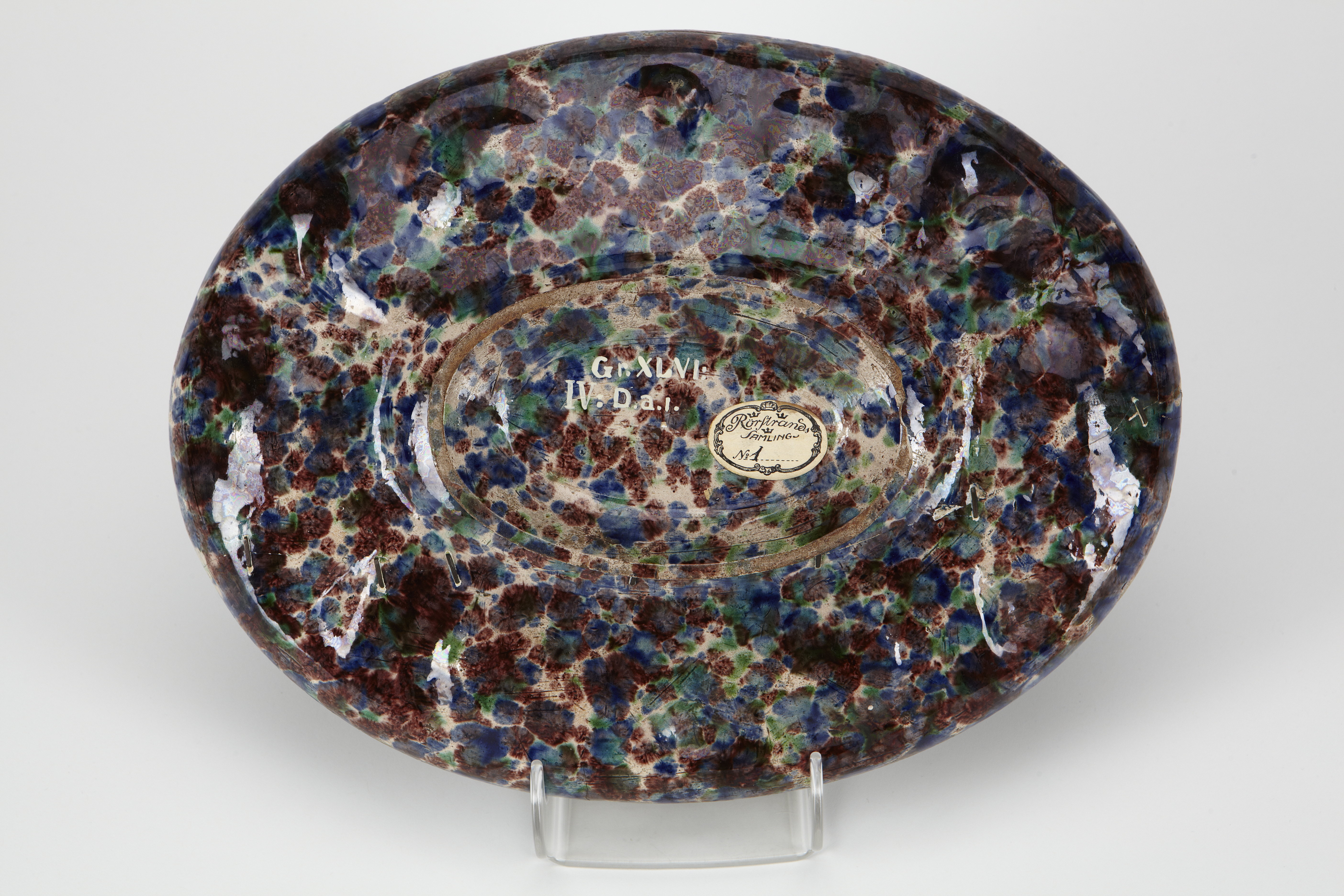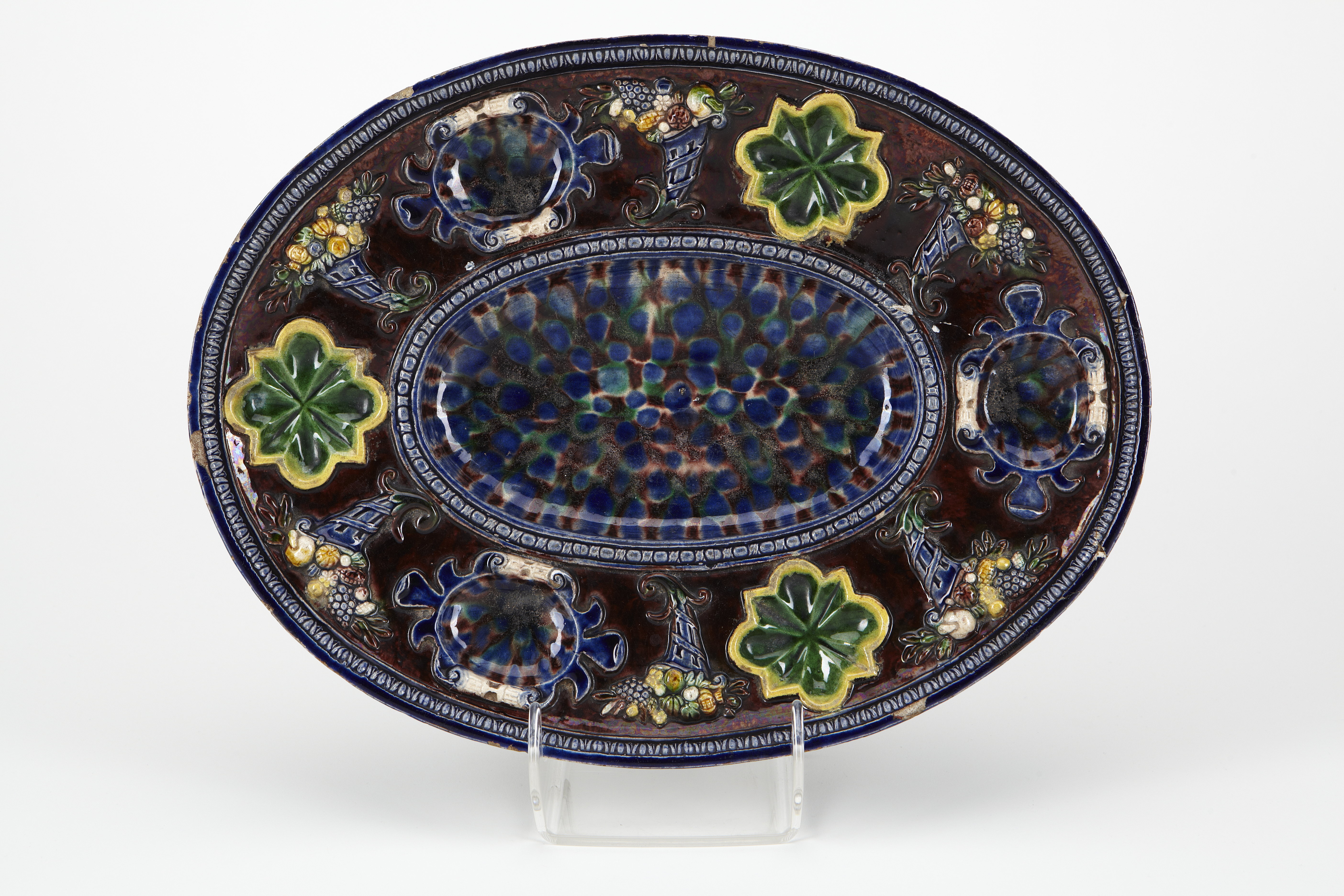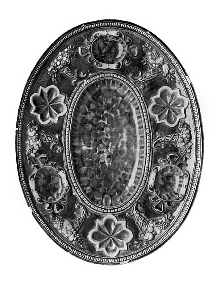 FAT Ovalt, med rundad nedsänkt botten och snett utstående, bred brätte med uppstående ytterkant samt på låg fot av samma form som fatet. Dekor i relief samt i färgade blyglasyrer. Godset gråvitt med någon anstrykning av gulrött. På brättet i relief dekor av tre ovala kartuscher, omväxlande med tre rosetter av fyrpassform med en rätvinklig udd mellan passen, i mellanrummen ett ymninghetshorn med frukter, däribland druvklasar, samt blommor och bladverk. På brättets ytterkant en äggstavliknande reliefbård i blått, vari dessutom smala bladornament. Runt botten i relief en korslindad pärlstav i blått. Bottnen med fläckar i blått, grönt och brungredelint samt i godsets färg. Baksidan är marmorerad "skyad" med oregelbundna fläckar i färger som på insidans botten. Den har en påklistrad vit papperslapp med tryck i svart "Rörstrands samling No 1". Höjd 5,5 cm, längd 33,9 cm, bredd 26 cm. S.k. Plat Épices. Senrenässans. Sannolikt tillverkat slutet av 1500 -talet eller början 1600-talet. Stilmässigt kan det hänföras till Atelier de Fontainebleau, dit d´Avon eller Normandie. Denna typ av fat kopierades av keramikern Pull under andra senare delen av 1800-talet.(ILJA2010)