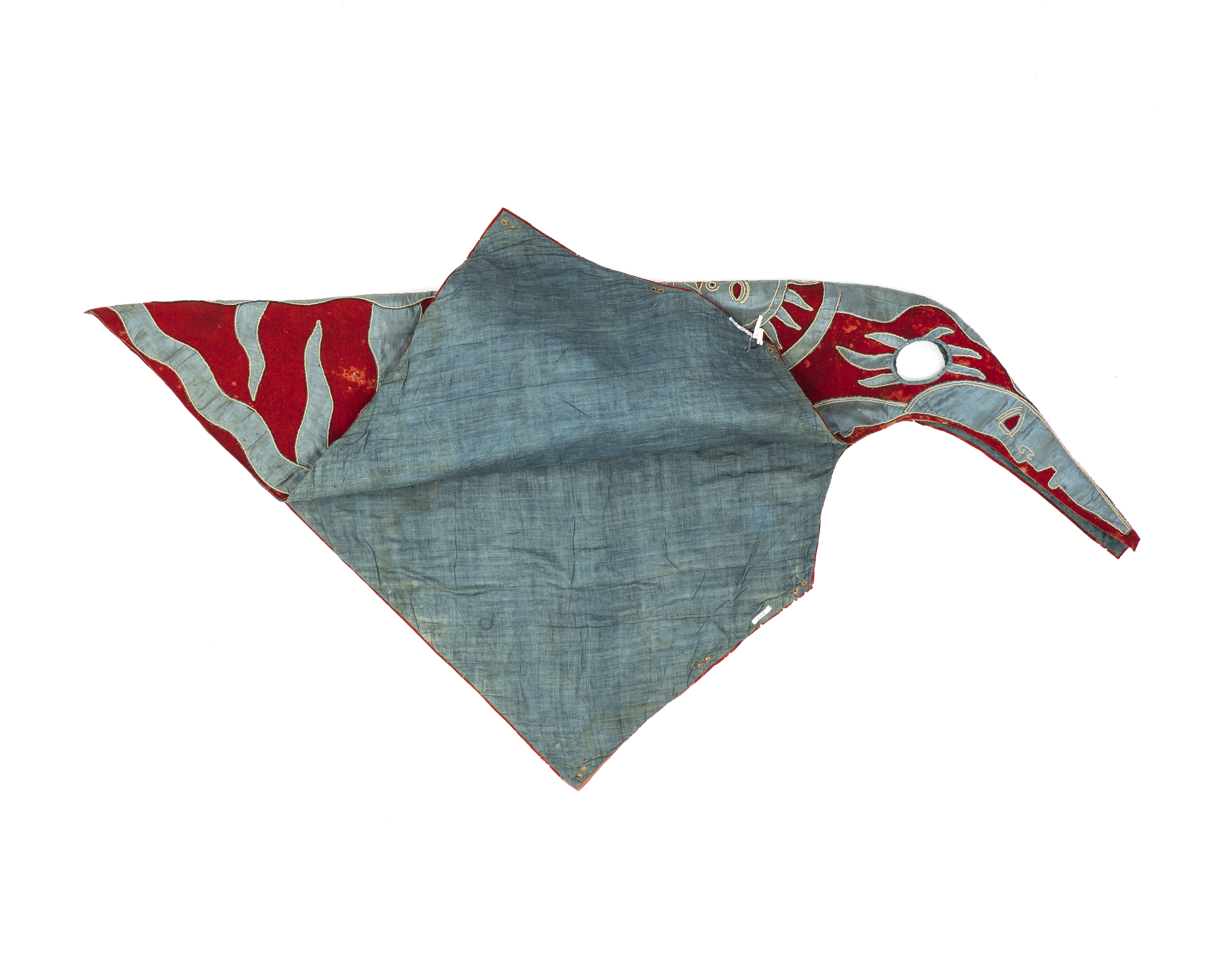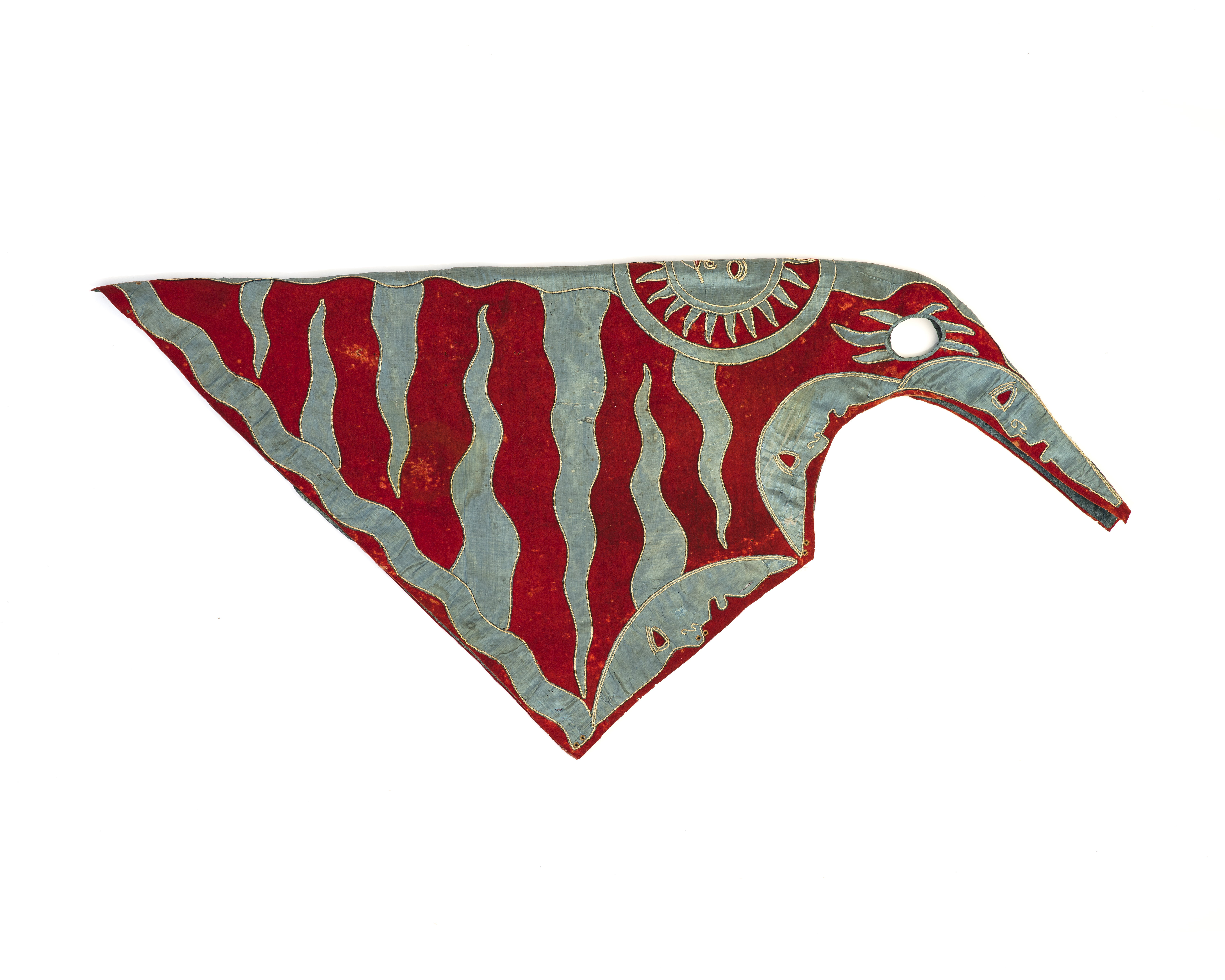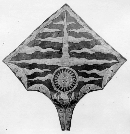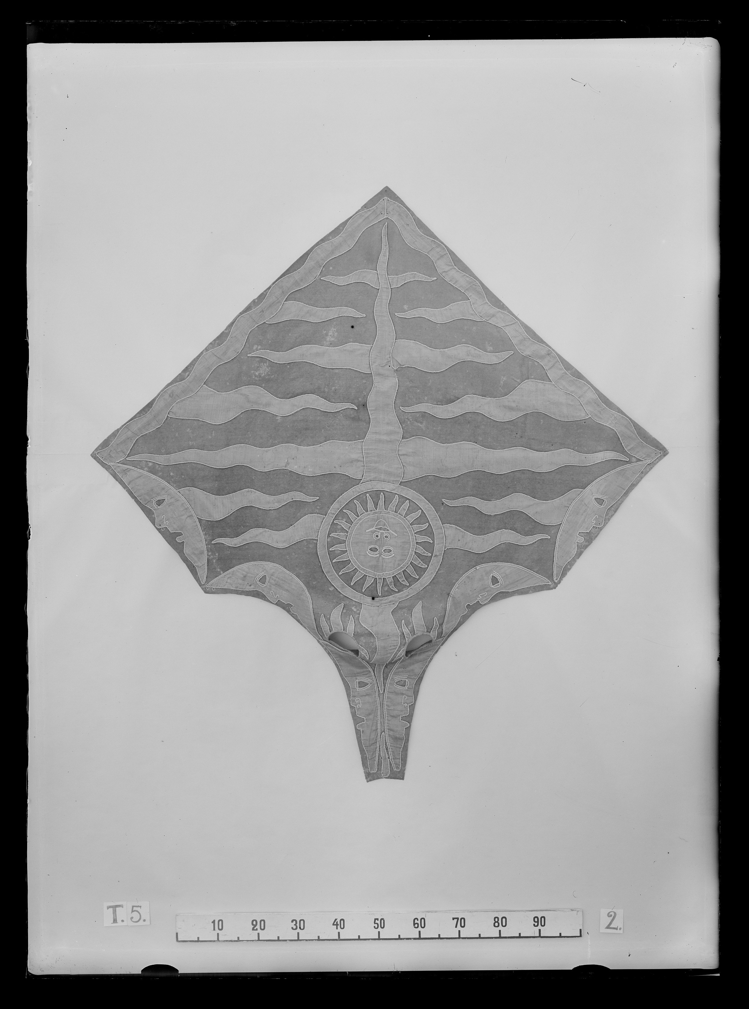 Bottentyget är rombiskt med 1000 mm långa sidor och de två övre har upptill konkava urklipp i 550 mm och med ett största djup på 150 mm. Rött kläde med applikationer av ljusblå taft med ljus 2 mm breda silkessnoddar i kanterna, och som konturer av ansiktsdetaljer. En bildad sol, med diameter på ca 300 mm, 750 mm från nedre hörnet, alldeles ovanför de två bredaste strålarnas korsmitt. Längs nedre sidorna ett 50 mm brett vågformatband. Längs övre sidorna sex bildade månar, tre på var sida med ansiktena vända utåt. Strålar utgående varannan från vågbandet och de nedersta månarna, varannan från på nedre halvan den lodräta strålen och på övre halvan från solen. Mindre strålar utgående från öronöppningarna, som är kantade med taft. I ytterkanterna längs de nedersta månarna genom bottentyget och fodret, sex parvis stigande hål ca 4 mm i diameter. Fyra likadana hål i övre och nedre hörnet. Foder av blått linne i tuskaft, skarvat längs mitten. Omnämns första gången i en inventarieförteckning 1651, då de uppges vara skänkta till drottning Kristina från hertigdömet Oldenburg.