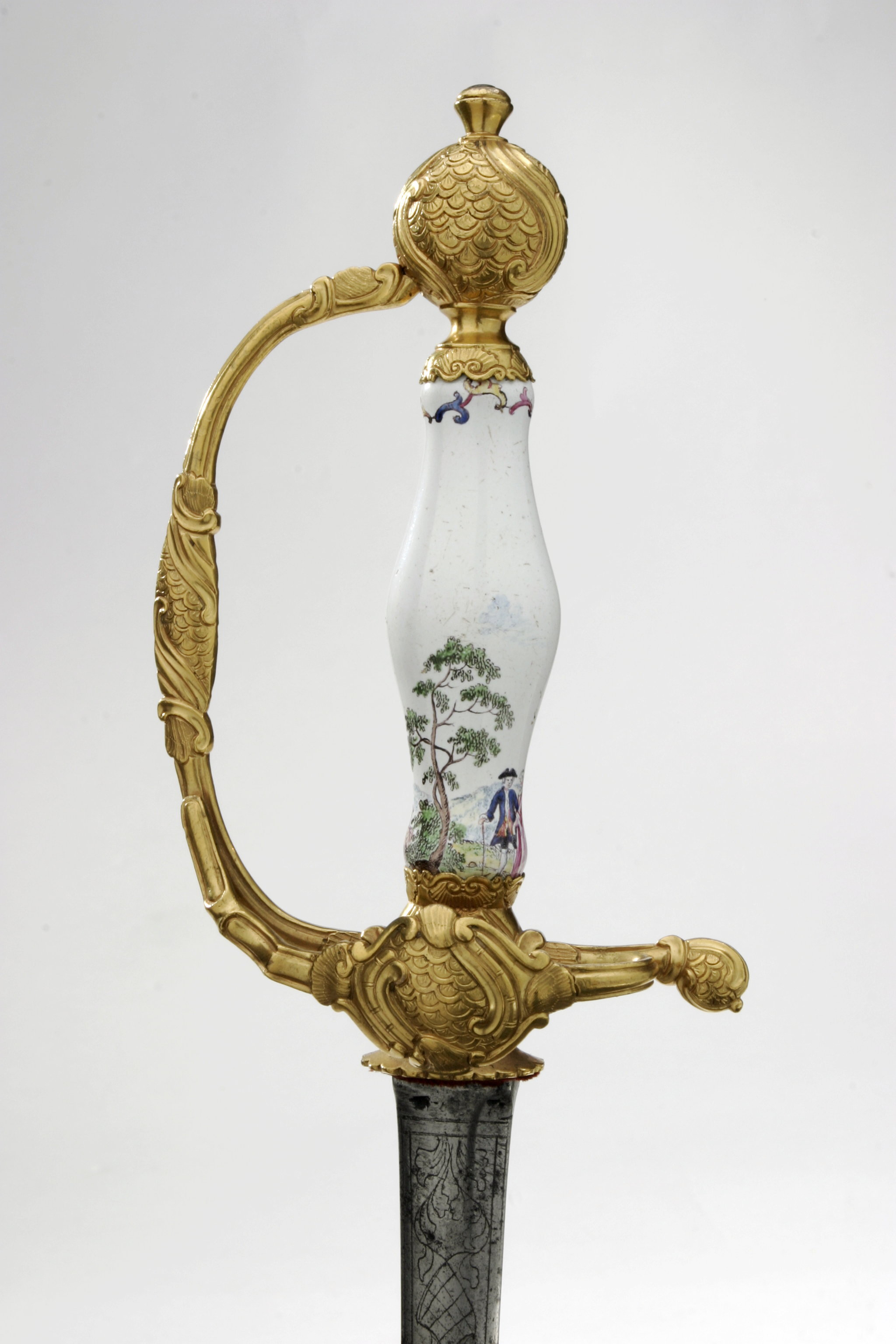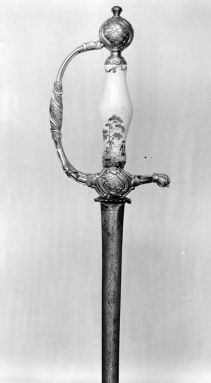 Fäste av förgyllt silver. Knapp rundad, något tilltryckt från in- och utsidan. Reliefdekor i rokoko av enkla voluter, c-formade bågar och punsat fjälliknande mönster. Kort bakre parerstång vidgad i ytteränden med fjälliknande mönstret samt påhandbygelns mitt. Denna intappad i knappen. Från utsidan av handbygelns nederdel utgår bakåt en kryssbygel som löper samman med bakre parerstången. Kryssbygeln vidgad på mitten med samma ornering som på krysset och knappen. Balusterformd kavel, vitemaljerad med flerfärgad målad dekor nedtill i form av en mansfigur och en kvinnofigur i landskap. Upptill på kaveln en enkel ranka. Klinga rak, tvåeggad, starka delen flackslipad med etsad dekor på båda sidor lika, i form av tunna linjeornament i enkla rankor, rutmönster och blad allt inom slät bård. Klingan i övrigt sexsidigt slipad.