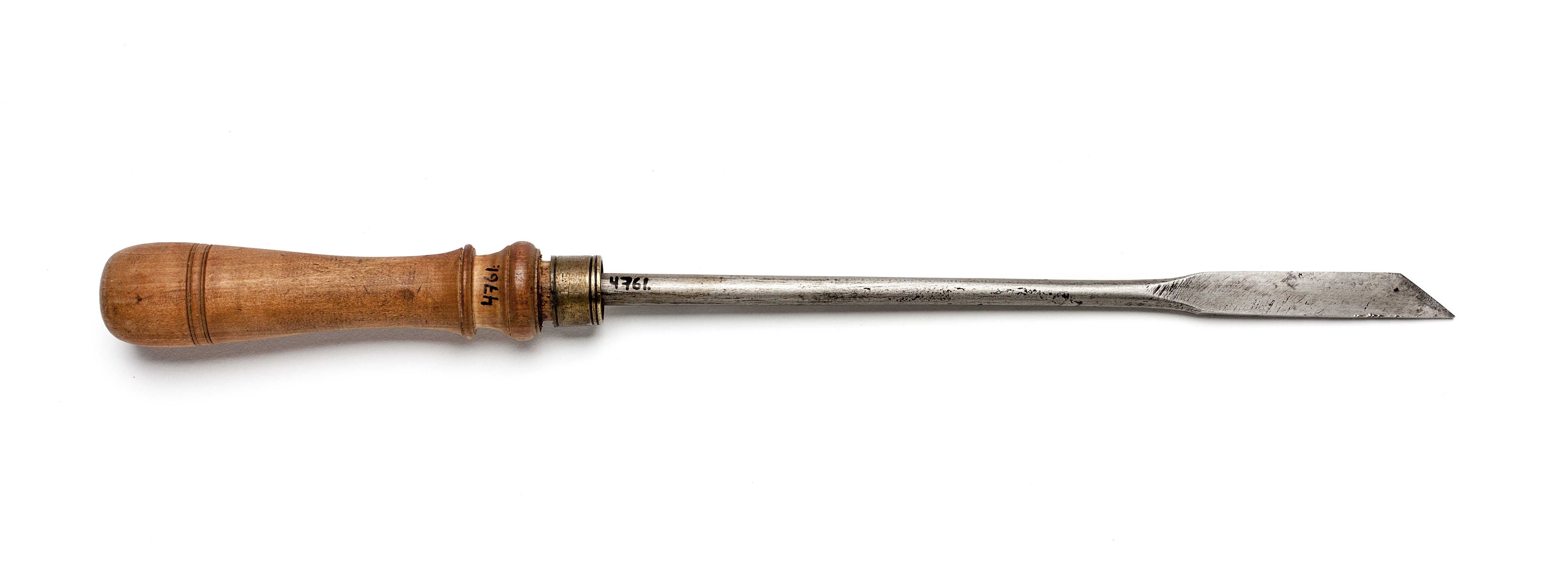 Rund klinga, i änden med rektangulär genomskärning. Svarvat skaft av päronträ med två vulster nedtill ("rydboholmstyp"). Mässingsring.