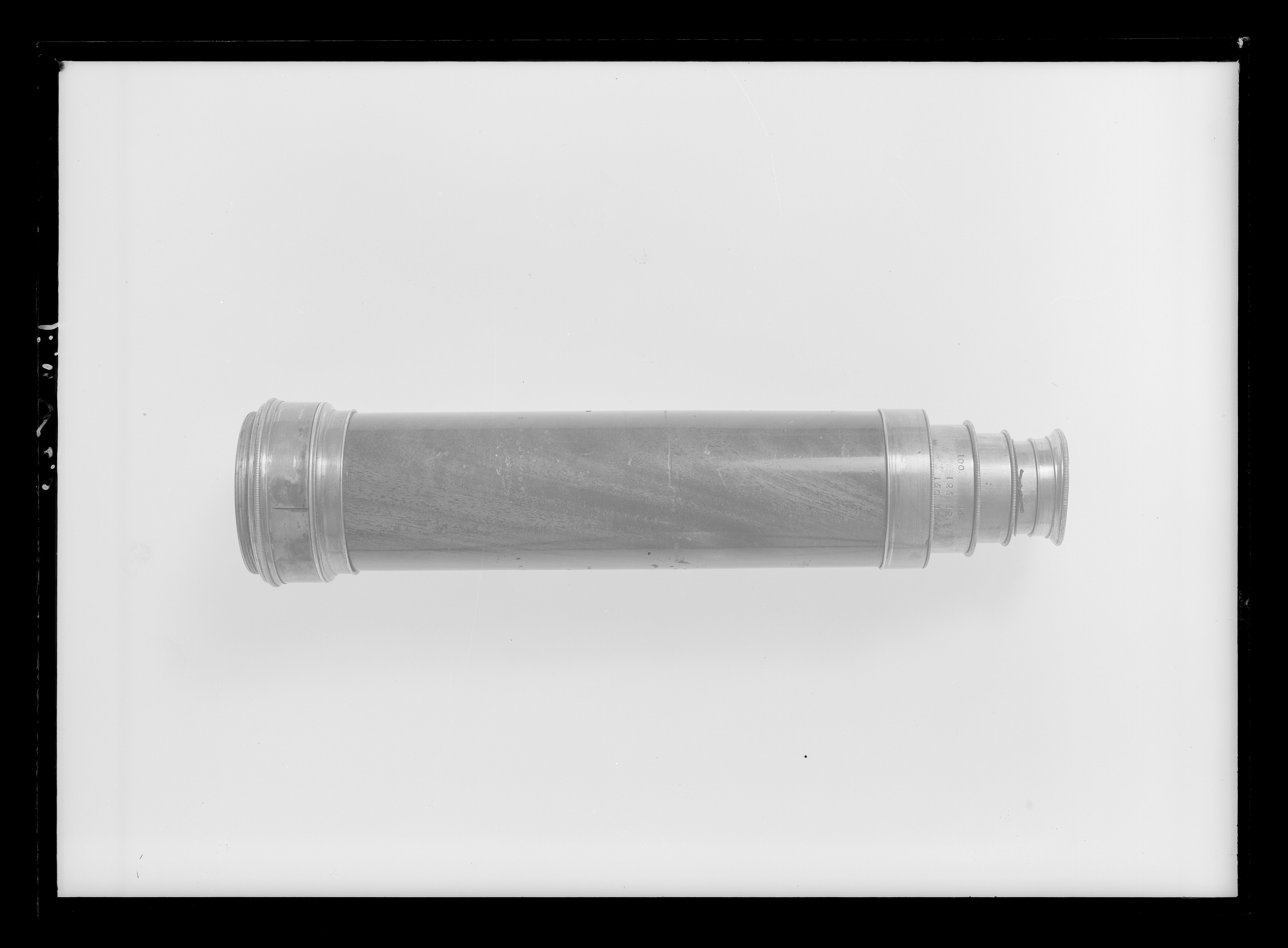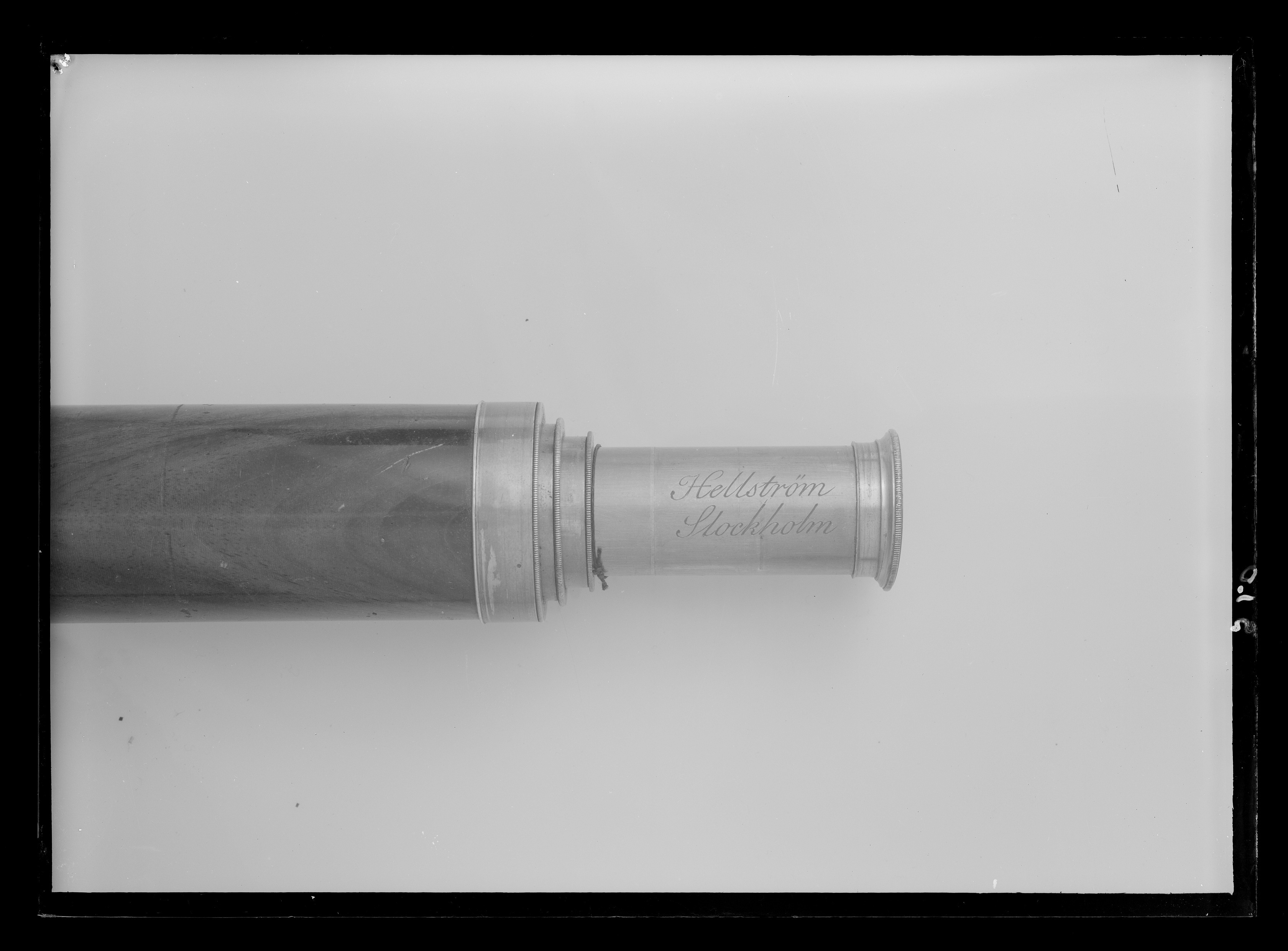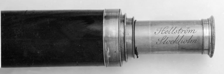 Kikare med tre utdragbara rör av mässing. Tuben klädd med mahogny med ringformiga mässingsbeslag. På röret närmast tuben två graverade skalor, graderade från 100-3200 respektive 16. - 0,5. På det smalare röret graverat: "Hellström Stockholm".