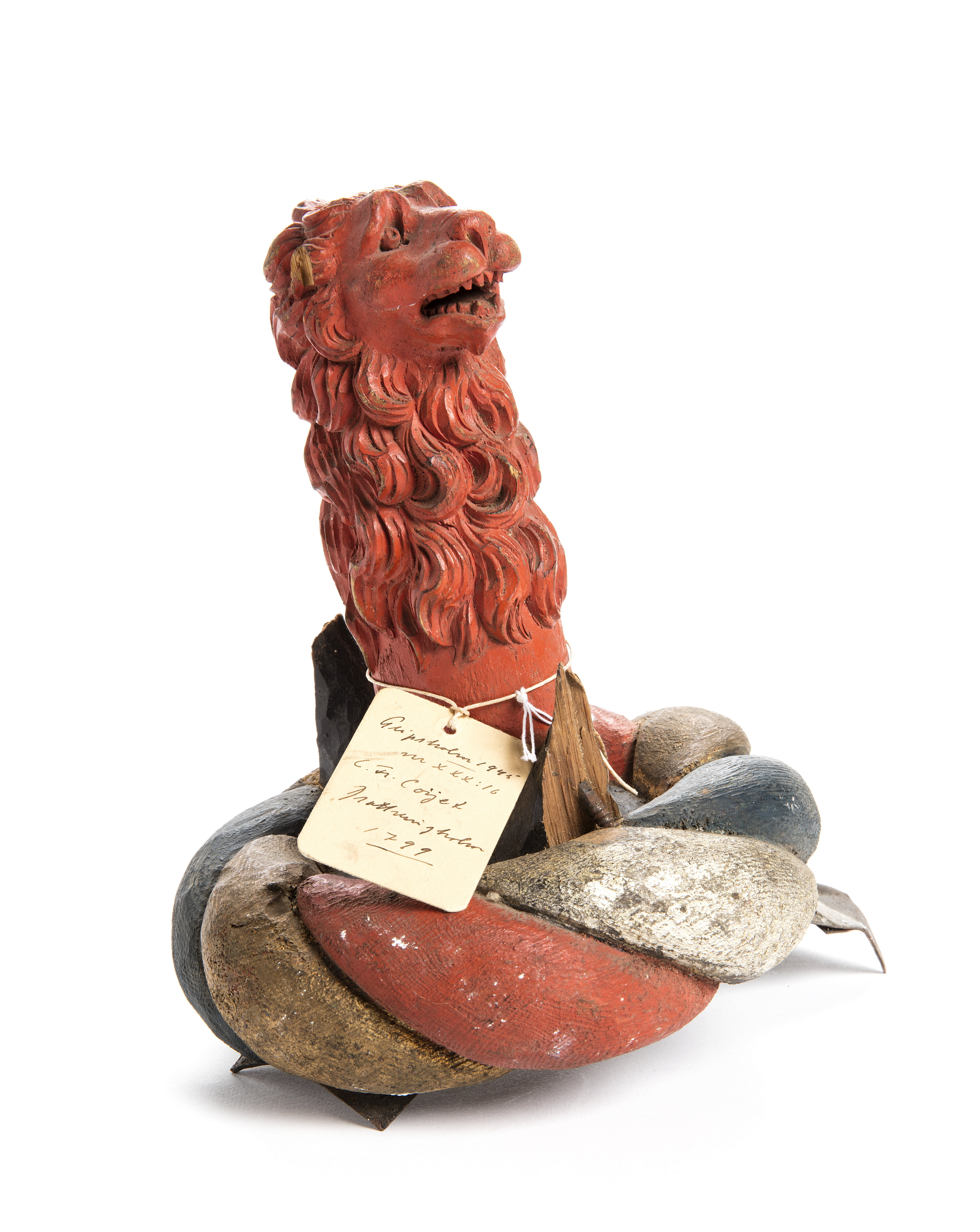Hjälmprydnad av målat trä, tillverkad av professor Jean Baptist Masreliez 1799, bestående av en hjälmbindel i guld, rött, silver och blått ur vilken ett snidat rött lejonhuvud uppstiger. Lejonet ursrungligen flankerat av två svarta vingar samt med en liggande halvmåne i silver placerad på huvudet. Undersidan urgröpt och omålad vari fäst med fyra skruvan en tunn 185 mm lång plåt som fungerat som fästanordning till hjälmen.