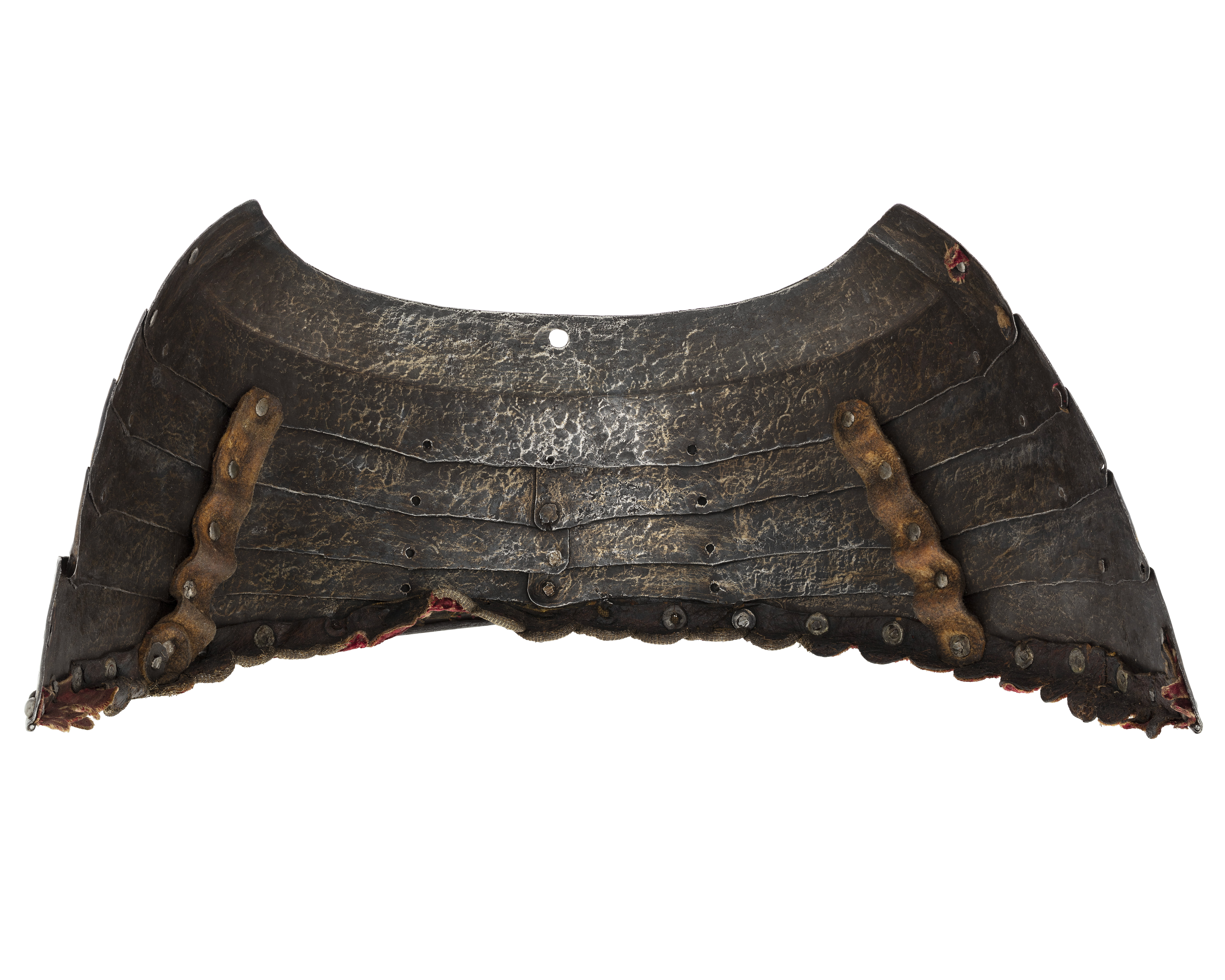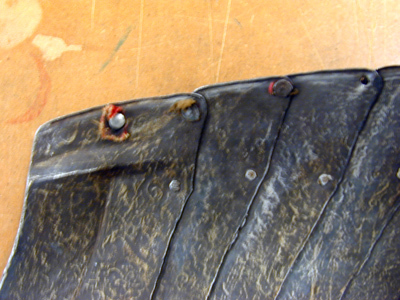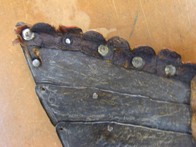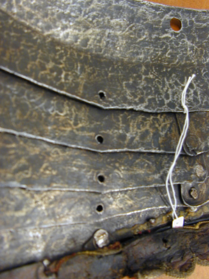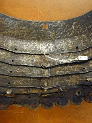 bröstharnesk med 2:ne axelsleifer af läder, klädda med rödt sammet och fastsatta med rosettformiga nitar - för lårskenornas fästande finnas 2:ne sleifer med skrifvar och muttrar af jern,