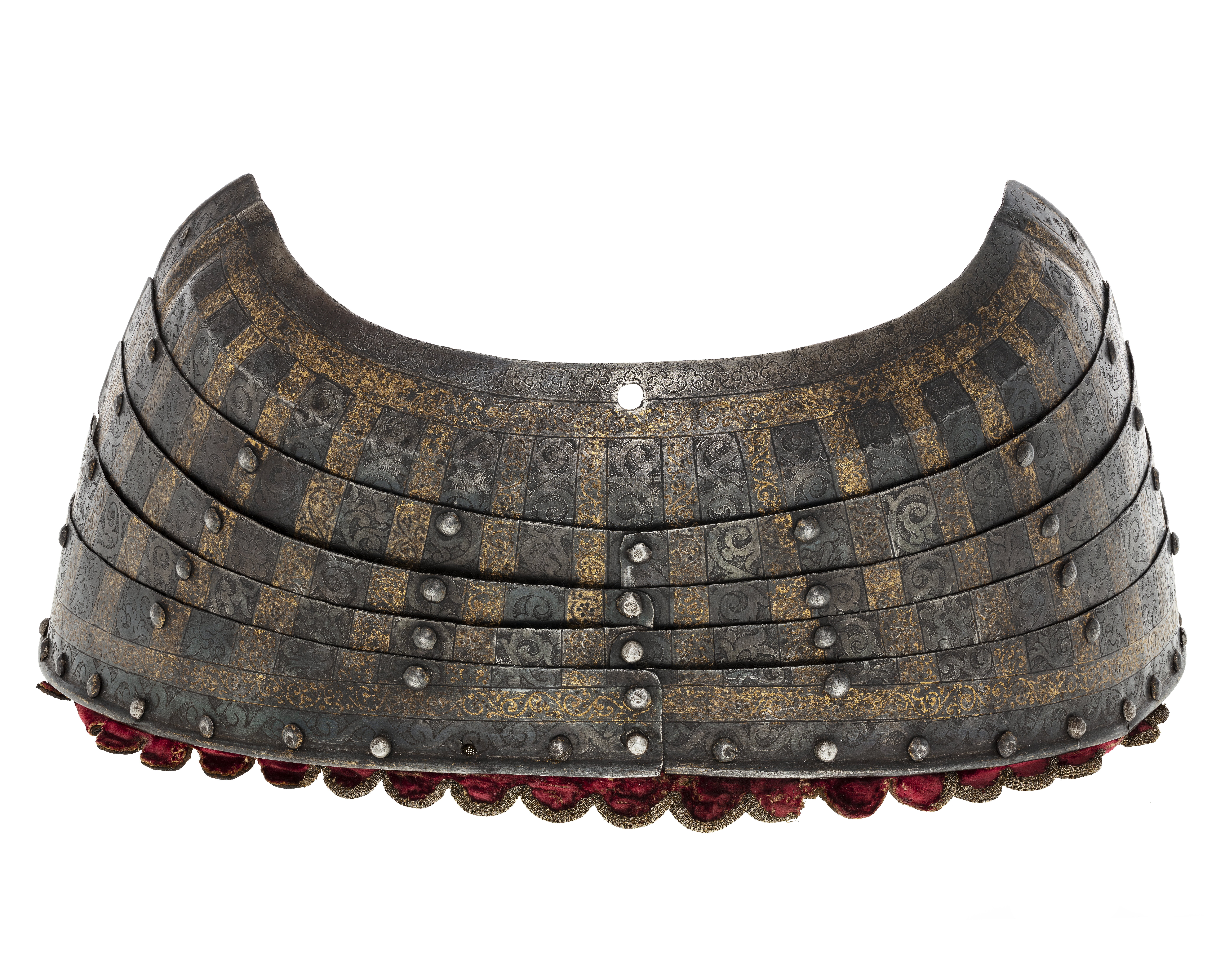 Obs rustningen har varit garnerad med udda af rödt sammet, kantade med silfvergalon, hvilken garnering likväl är bristfällig och till en del borta.