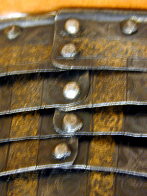 Höftbetäckning sammansatt av 5 lameller, de 4 nedre nitade på mitten. Möjligen tidigare (urspr:) styvt nitad. Fästning med nitrad till h och v, 4 nitar genom lamellerna, därinnanför en rad med nitar som fäster läderband på baksidan. Därinnanför rad med nitar på utsidan (hål även i den täckta lamellen). I mitten rad med nitar, överlappande omväxlande h och v. Möjligen tillverkad i Milano 1605.