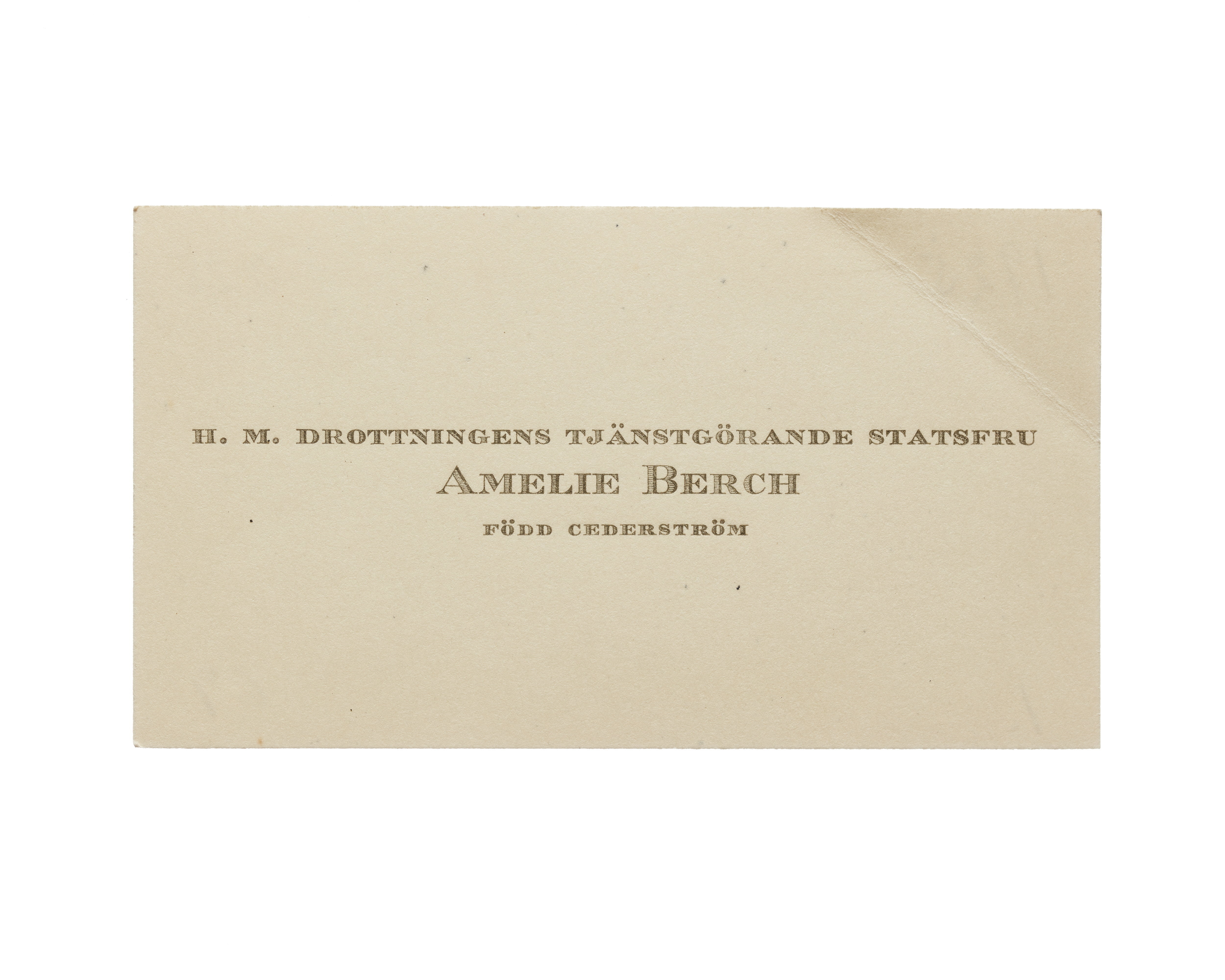 Två visitkort från H. M. Drottningen tjänstgörande statsfru, Amelie Berch f. Cederström. Första kortet daterat 1925, vikt i övre högra hörnet. Andra kortet daterat 1927, vikt i övre högra hörnet.