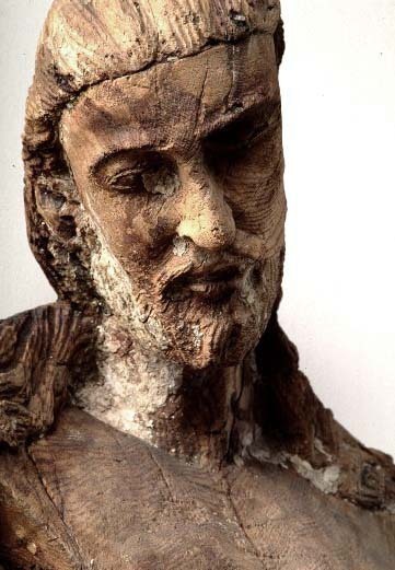 ek, armarna av lövträ. Kondition: händer och underben bortbrutna, korset och eventuell törnekrona förlorade. Färg: smärre fragment av kredering.