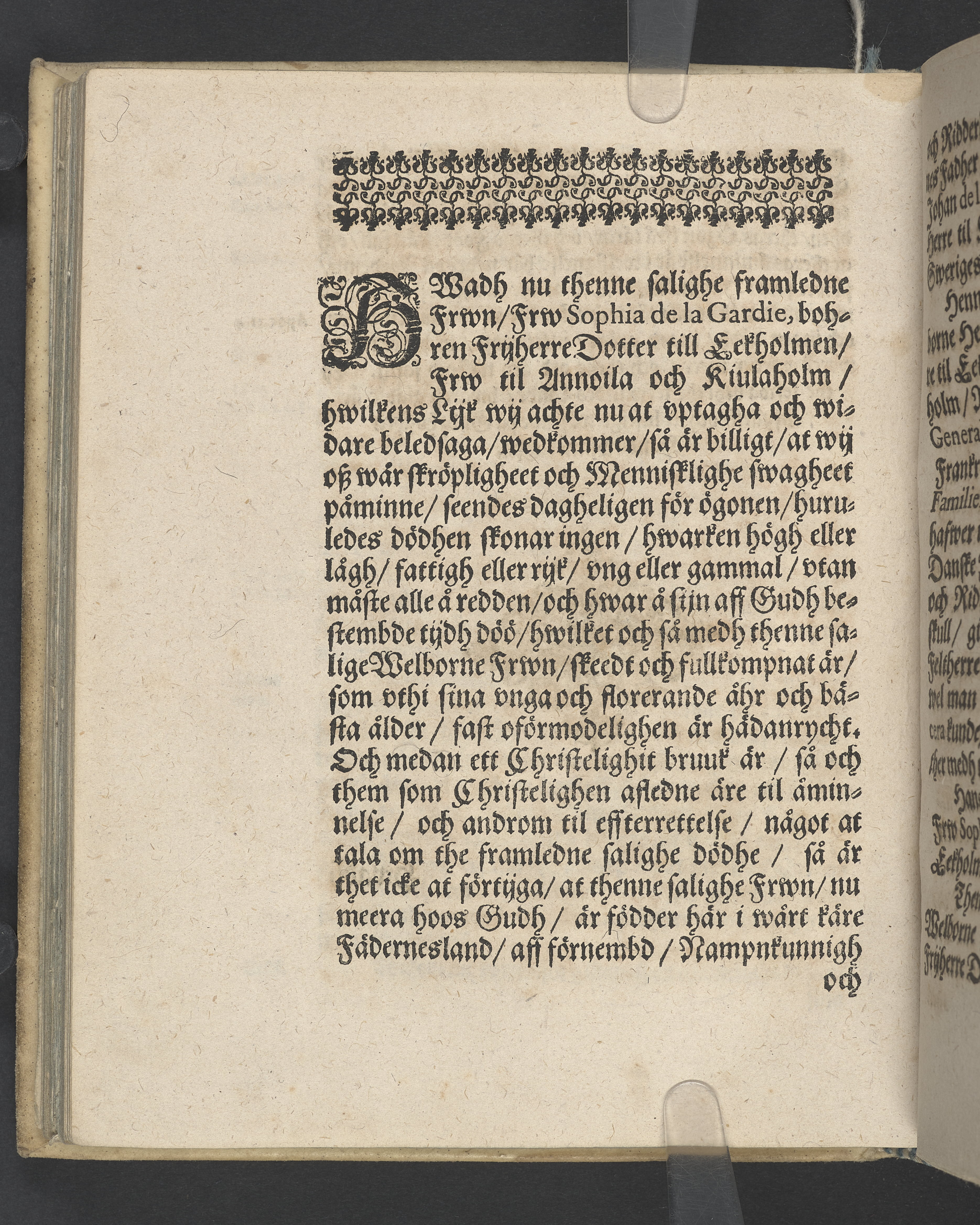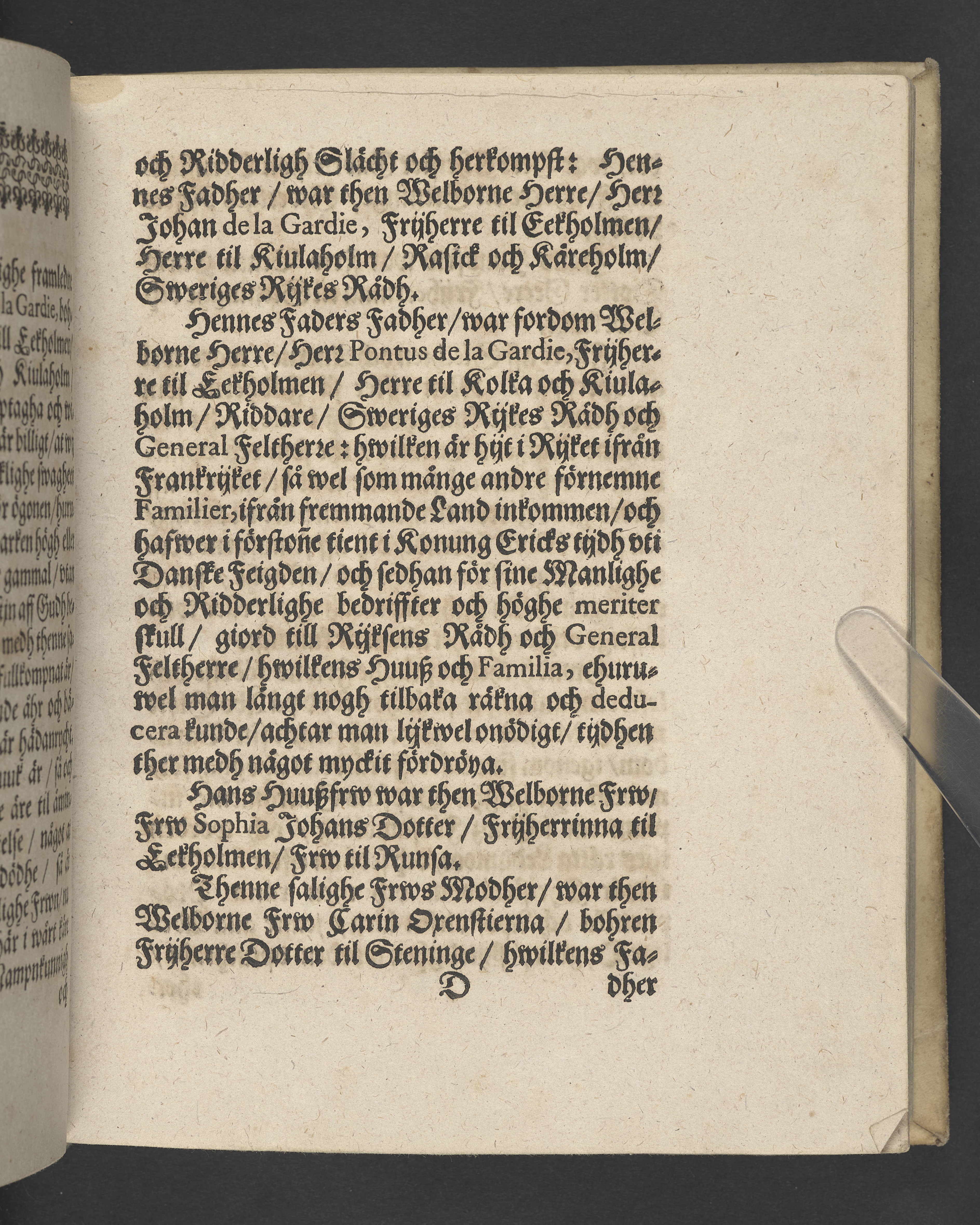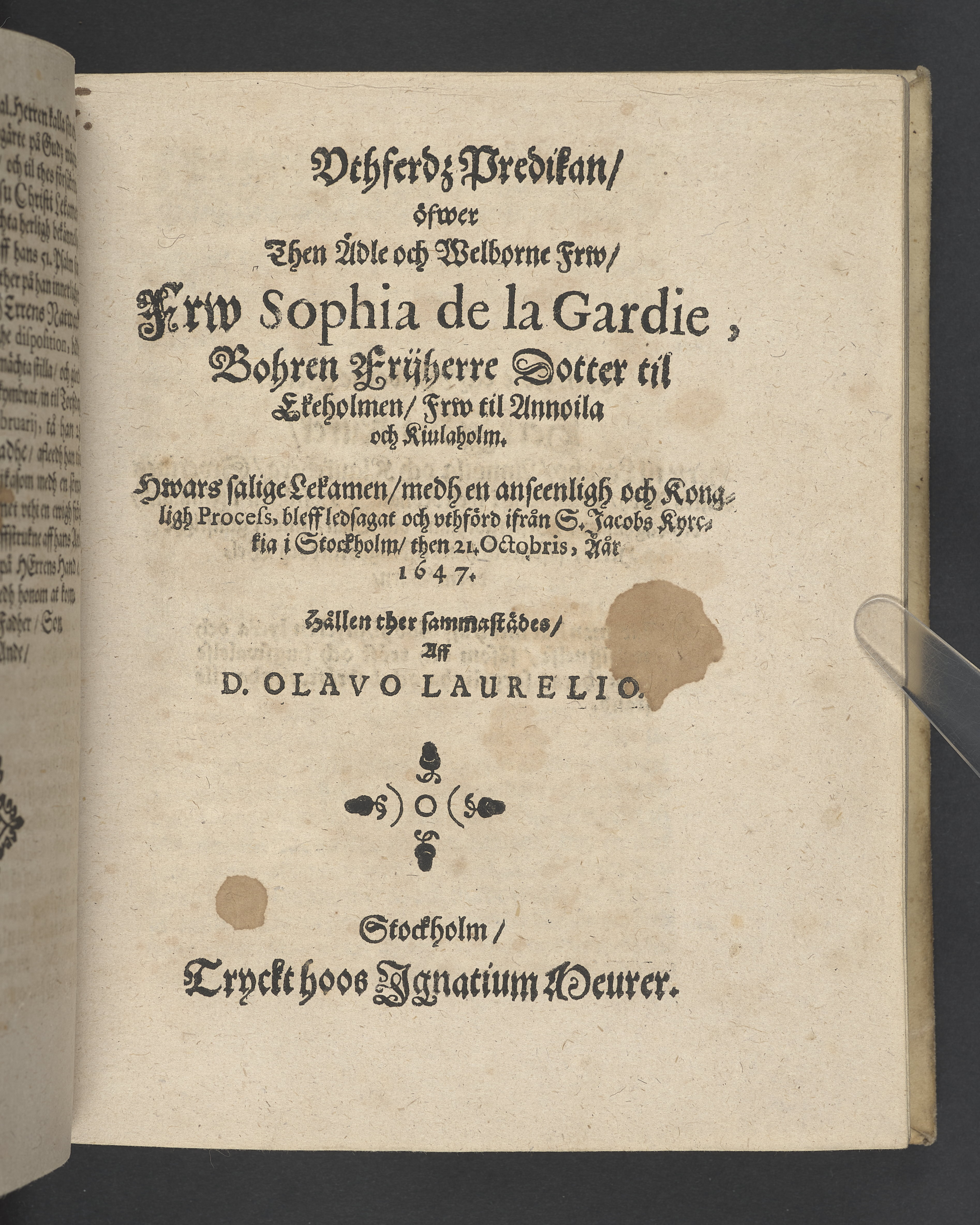 Uthferds Predikan, öfwer... fru Sophia de la Gardie... til Annoila och Kiulaholm... St. Jacobs kyrckia i Stockholm, then 21. octobris åår 1647... Stockholm, tryckt hoos Ignatium Meurer.