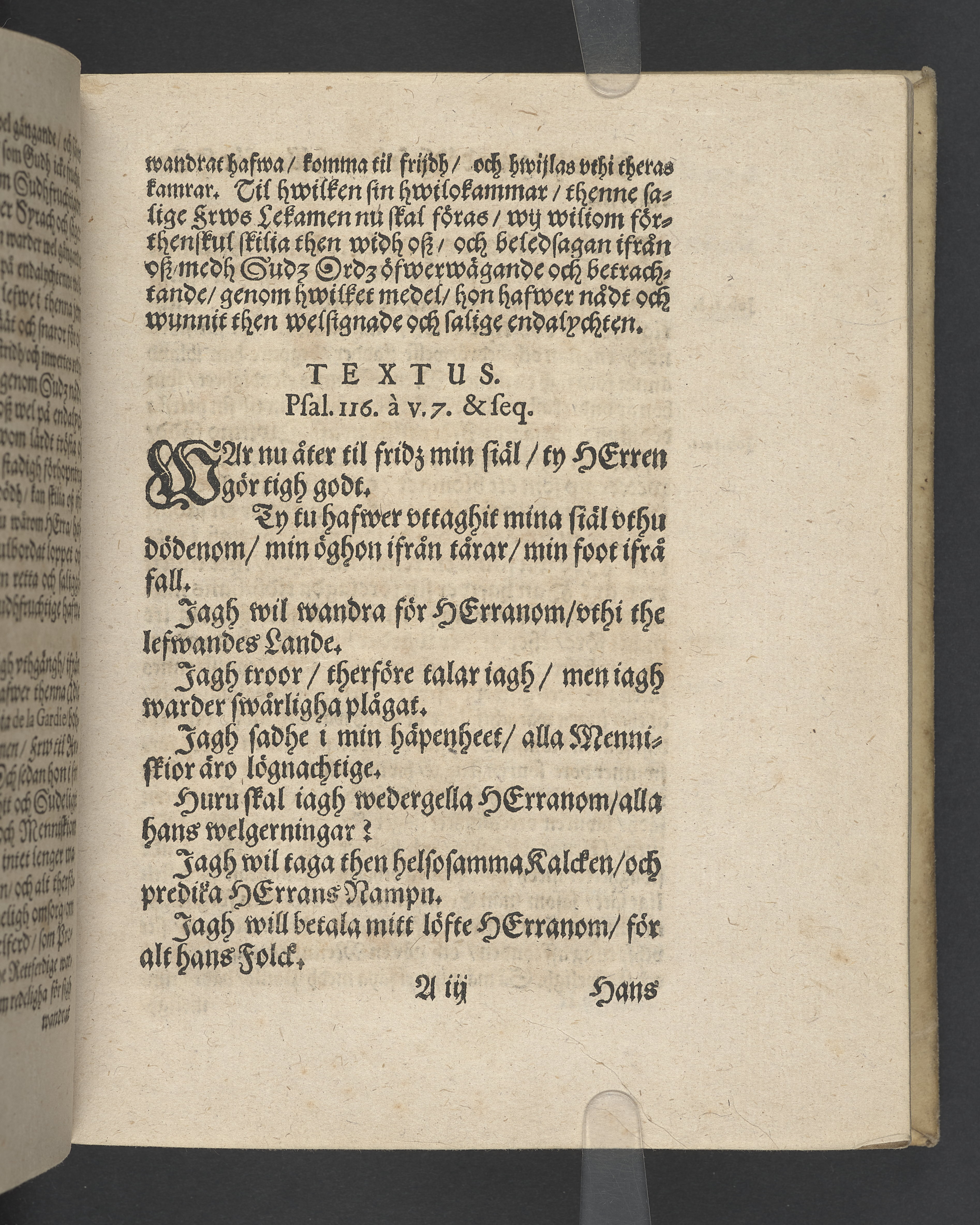 Pergamentband. Pärmfyllnad: papp. Blått snitt.