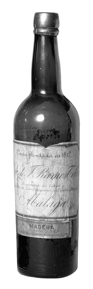 MADERA 1861, Hijo de F. Ramos Tellez, Málaga, en helbutelj Av mörkgrönt glas. Cylindrisk, med kupigt indragen skuldra och svagt spolformig hals med en bred och en smal stärkring; bottnen konisk, högt uppskjutande. Etiketter två, en större, vit, och en mindre, grå, på den förstnämnda firmanamn m. m. i numera mörknat guld, på den sistnämnda text i svart. Kapsylfragment av förtent bly, rödfärgat. Höjd: 30,5 cm.; diameter: 7,9 cm.