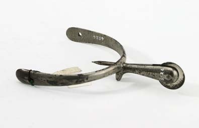 Sporre av förnicklat stål. U-formade skänklar, vidgade med hål i ändarna. Baktill på insidan, mitt för halsen 21 mm lång spets, avsedd att stickas in i klacken. Rak hals 39 mm lång, rund, med trissa (rund slät klinga).