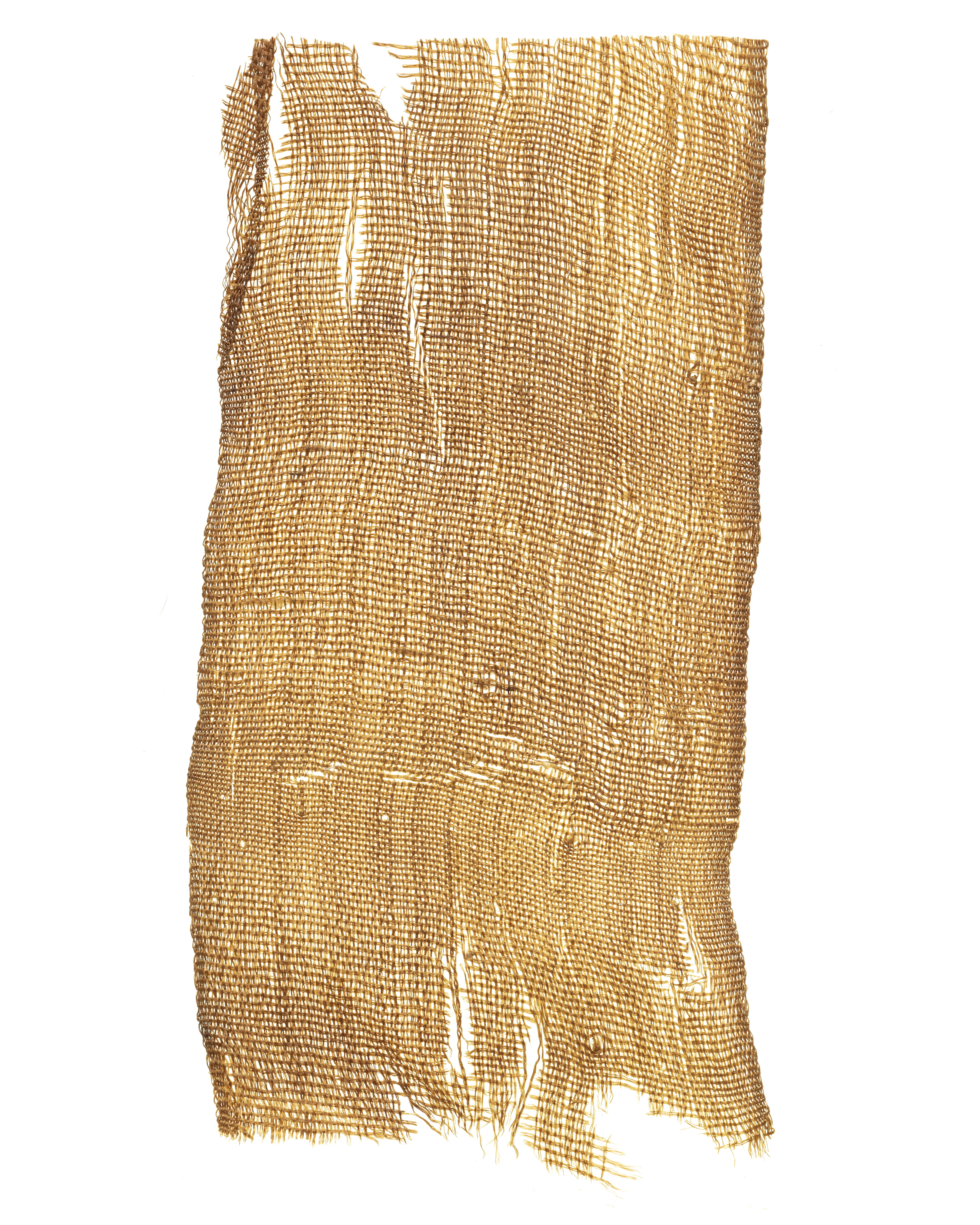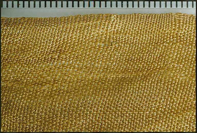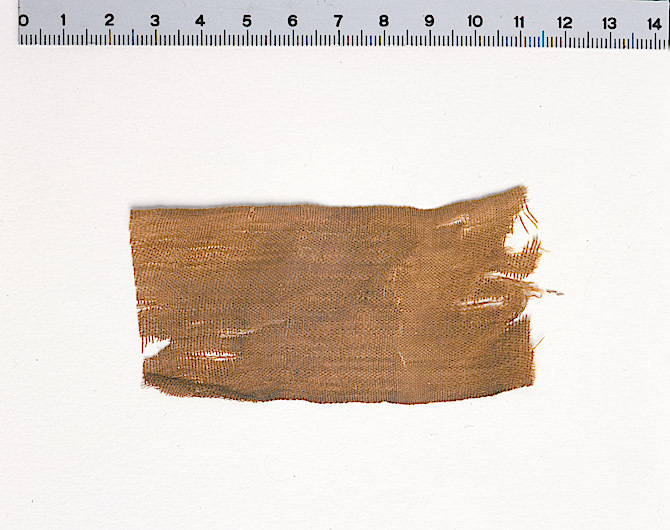 Fragment av sidenband i tuskaft, funnet nära huvudets vänstra sida. Fragmentet ingår i en samling fragment tagna som prov ur drottning Kristinas kista vid gravöppningen den 13-14 december 1965. Varp: 2-trådigt silke löst spunnet i z-snodd, tvinnat i s-snodd. Trådtäthet: 30-34 trådar/cm. Inslag: 2-trådigt silke löst spunnet i z-snodd, tvinnat i s-snodd. Trådtäthet: 18 - 24 trådar/cm. Material: Silke. Teknik: Tuskaft. Kommentar: Två grövre varptrådar med 3 mm mellanrum finns mitt på väven och återkommer på samma ställe på fragment nr 32994, 32995, 32996, 32998 och 33001, eventuellt också 32999. Nuvarande färg är brun
