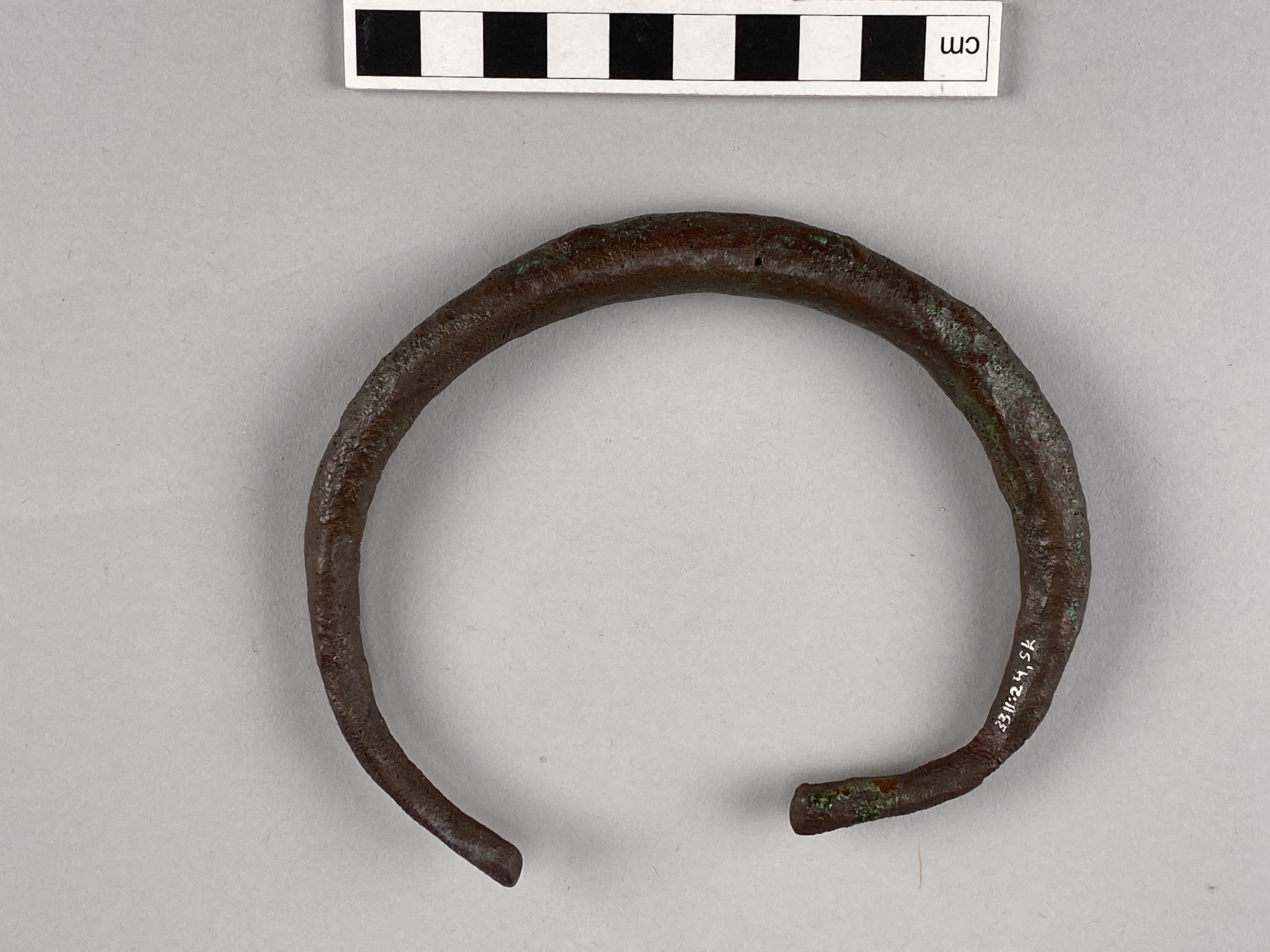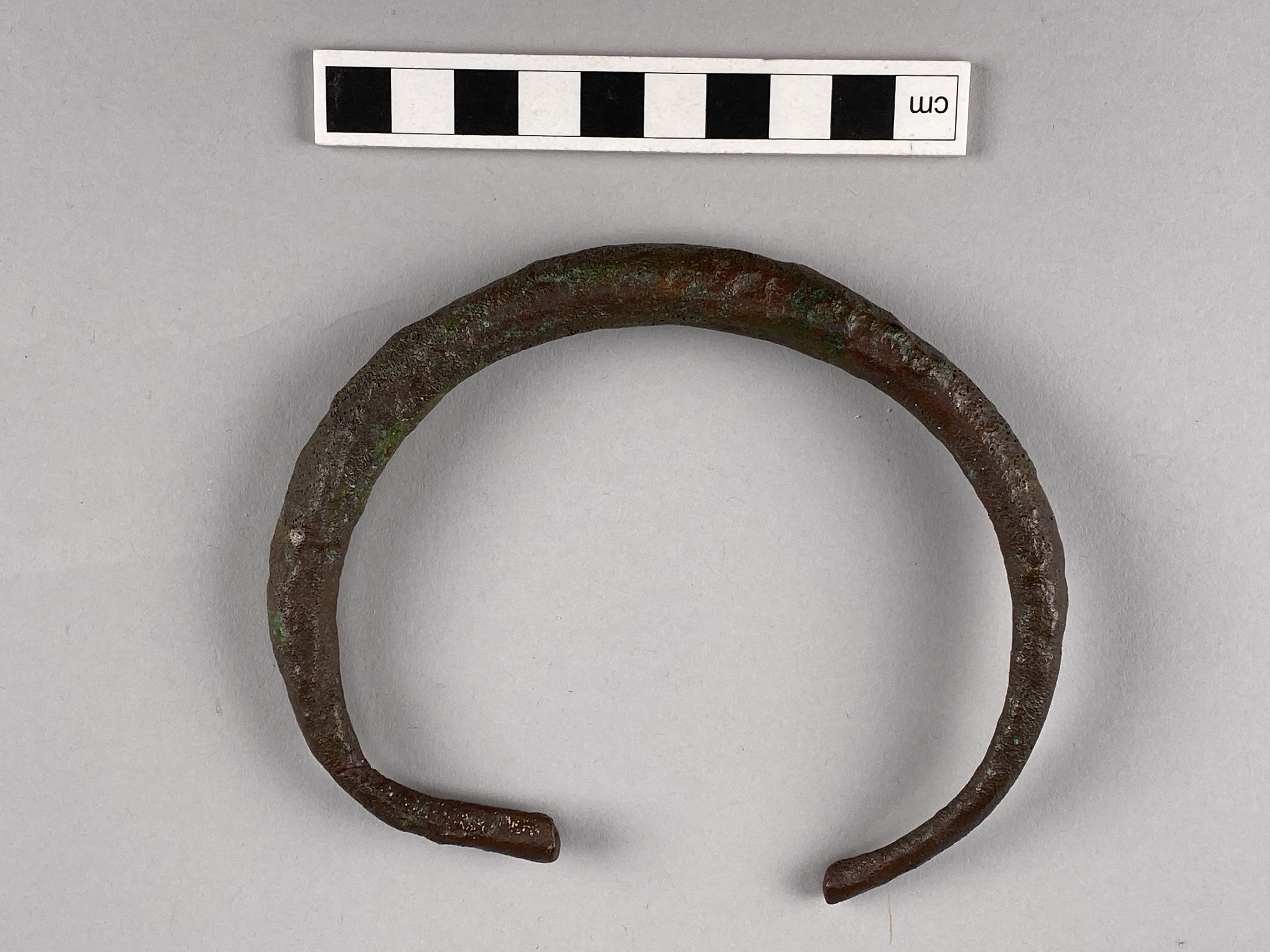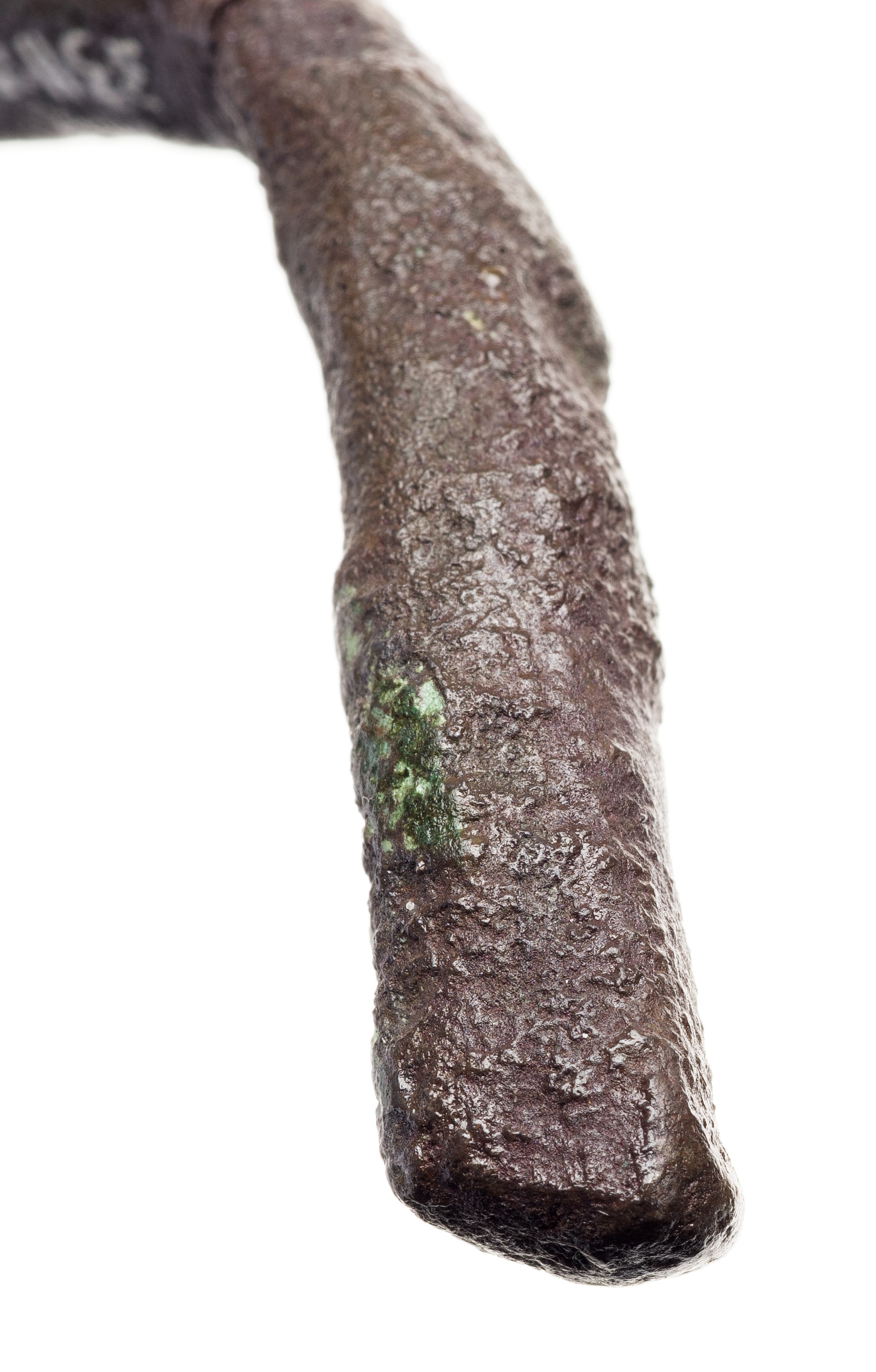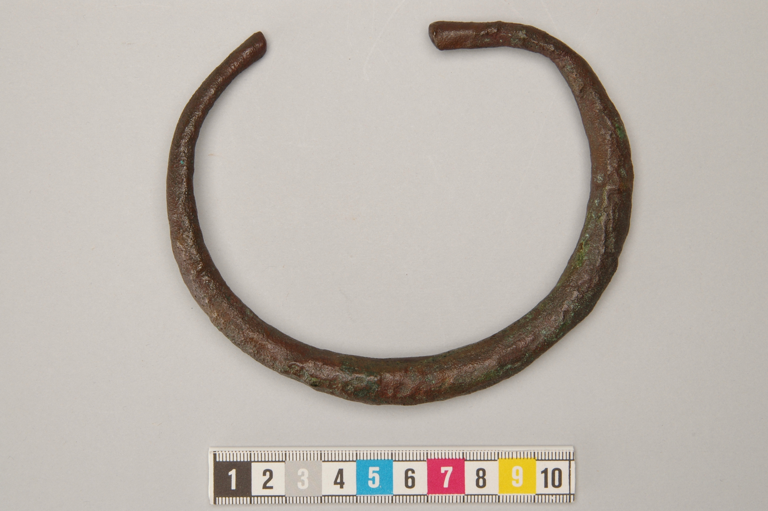 Ring av brons, öppen, tjockast på mitten och avsmalande mot ändarna. Den ena änden är med tvärt böjd än den andra.