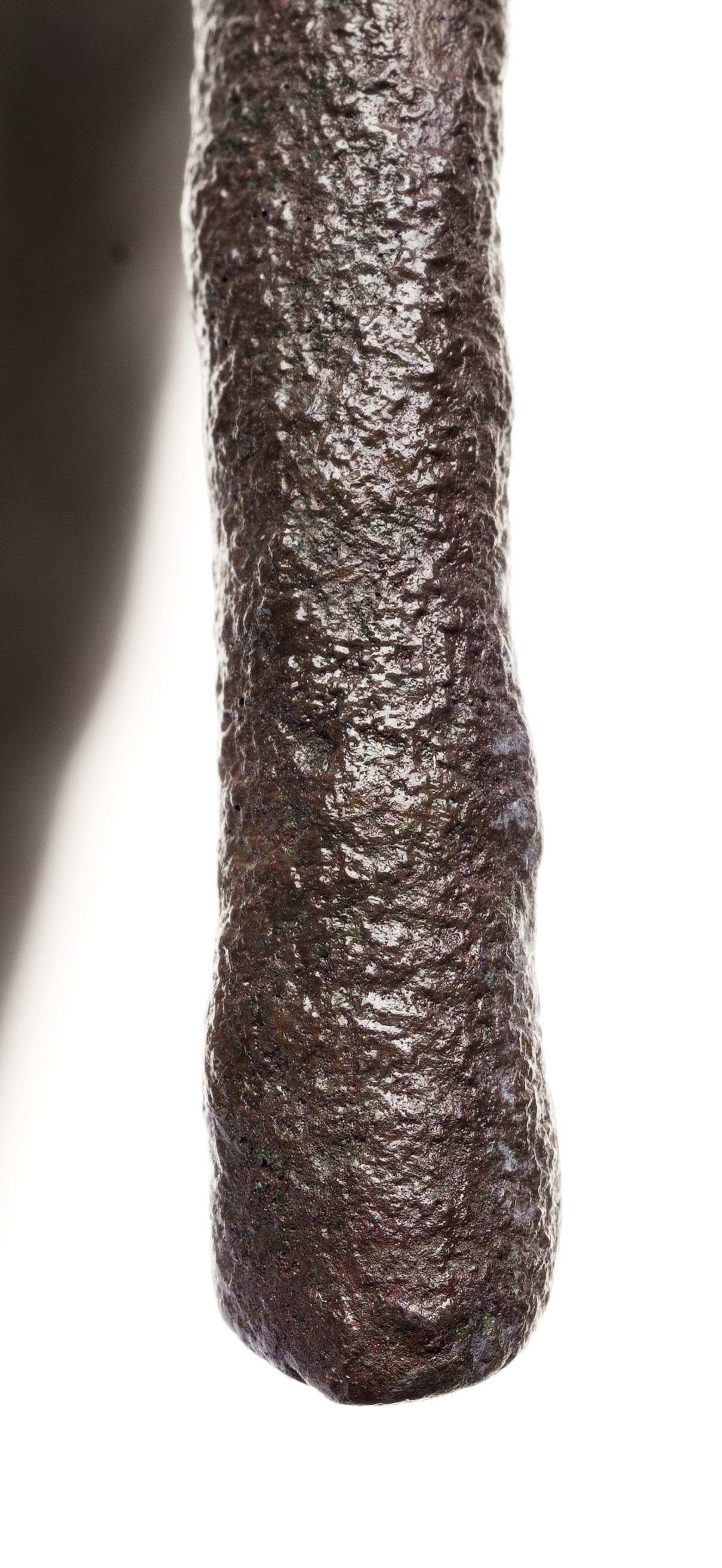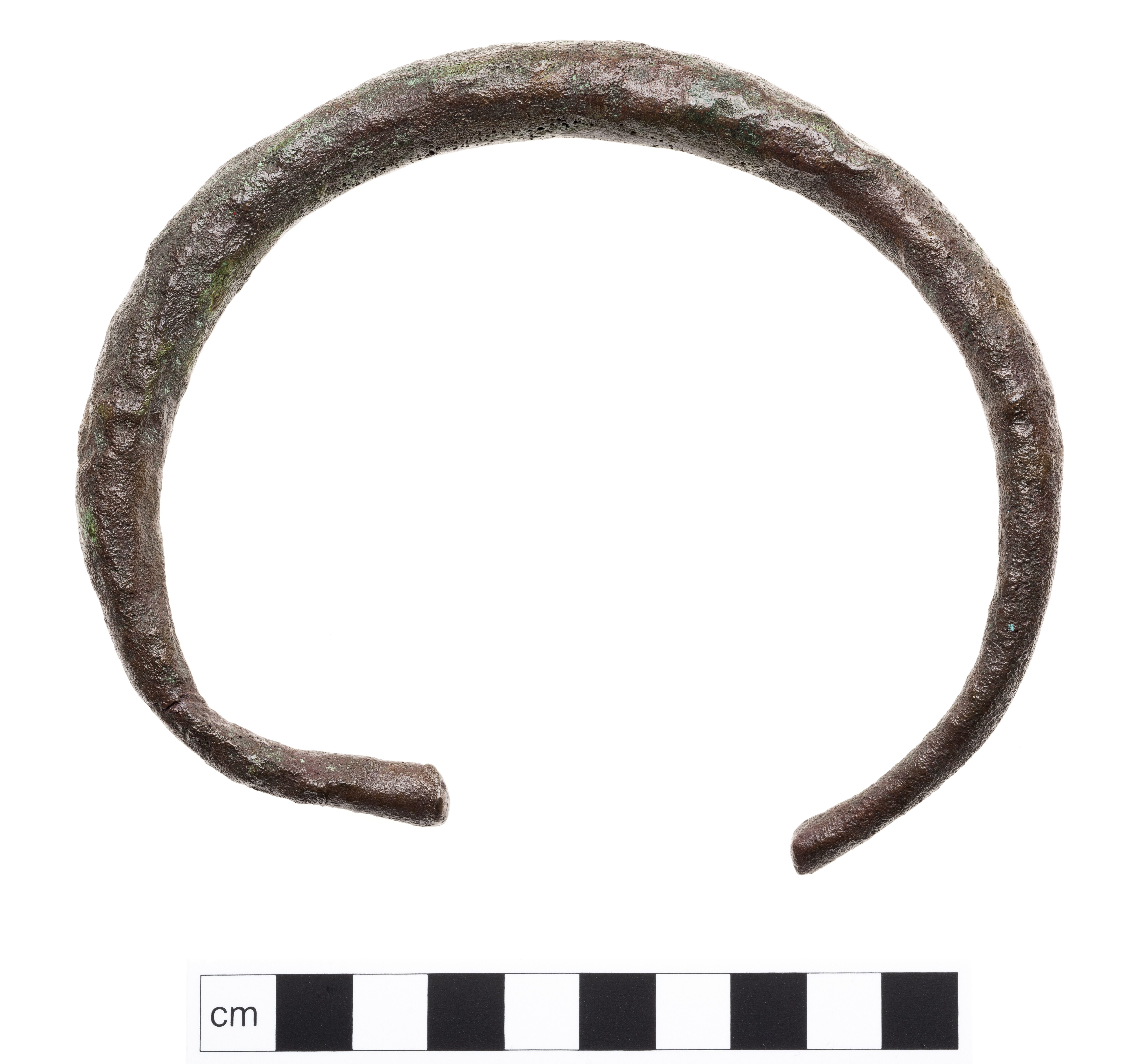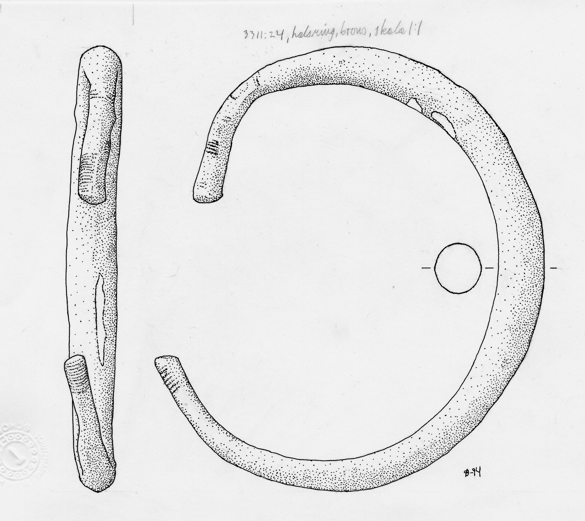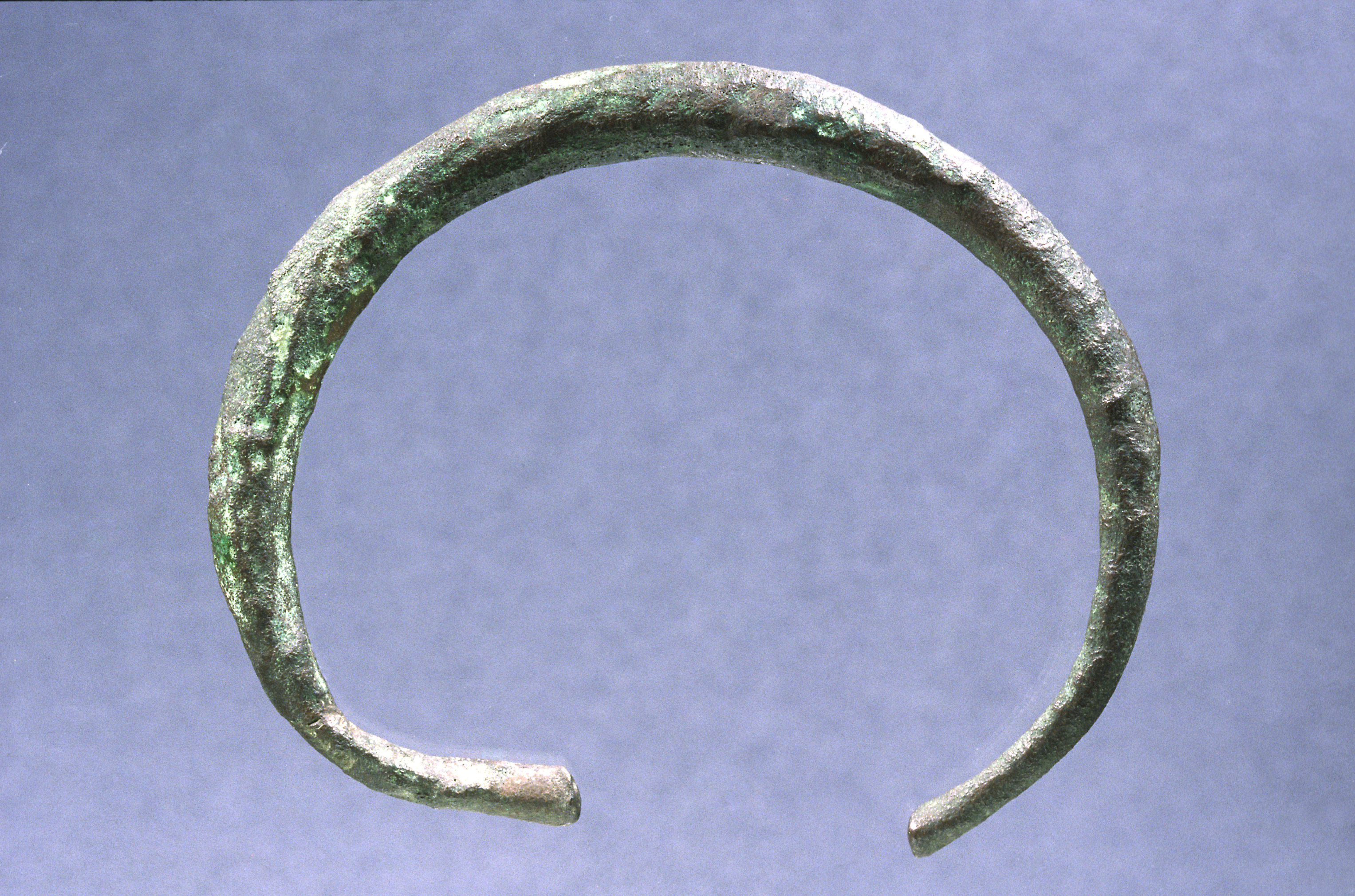 Ring av brons, öppen, tjockast på mitten och avsmalande mot ändarna. Den ena änden är med tvärt böjd än den andra.