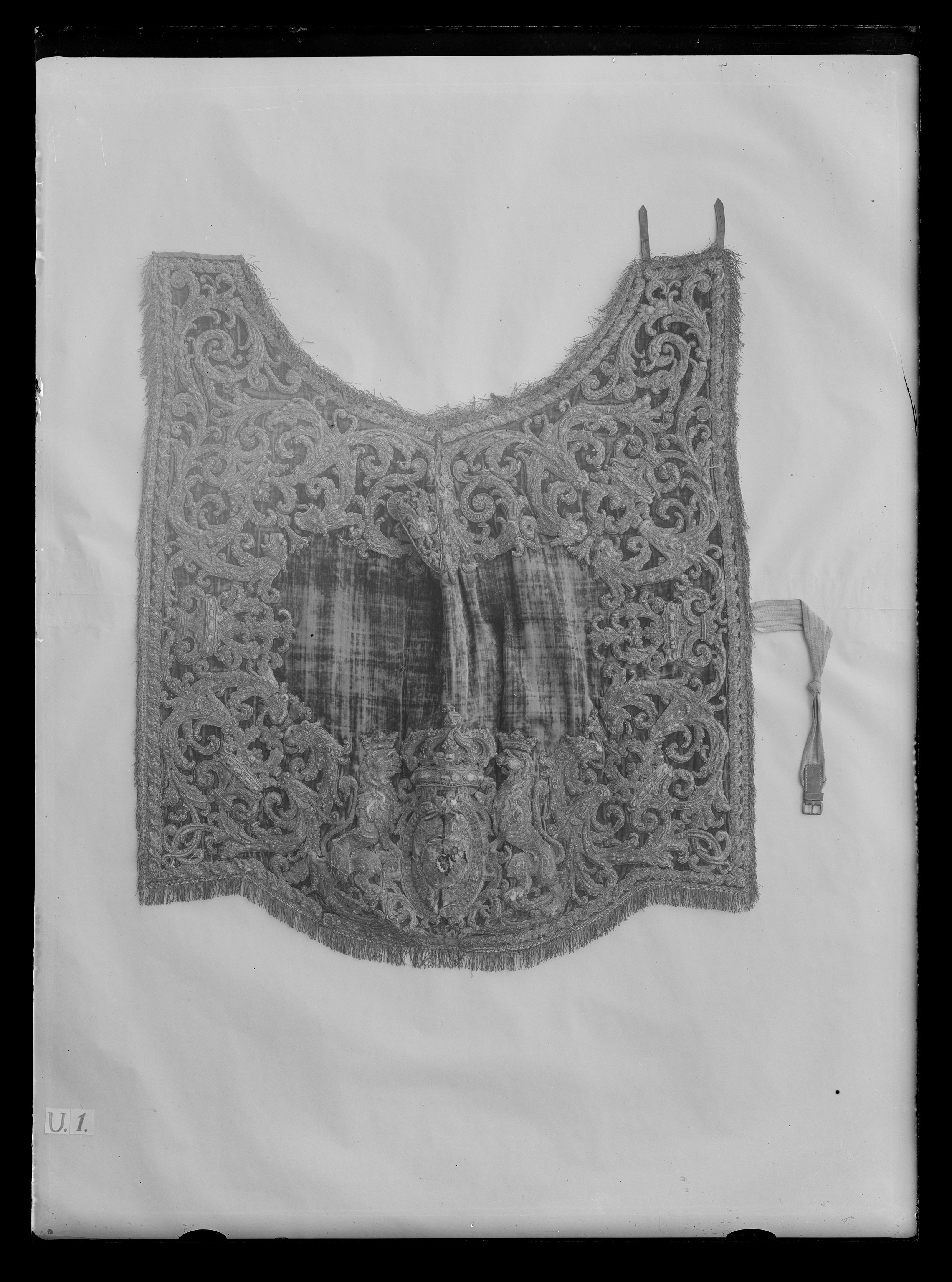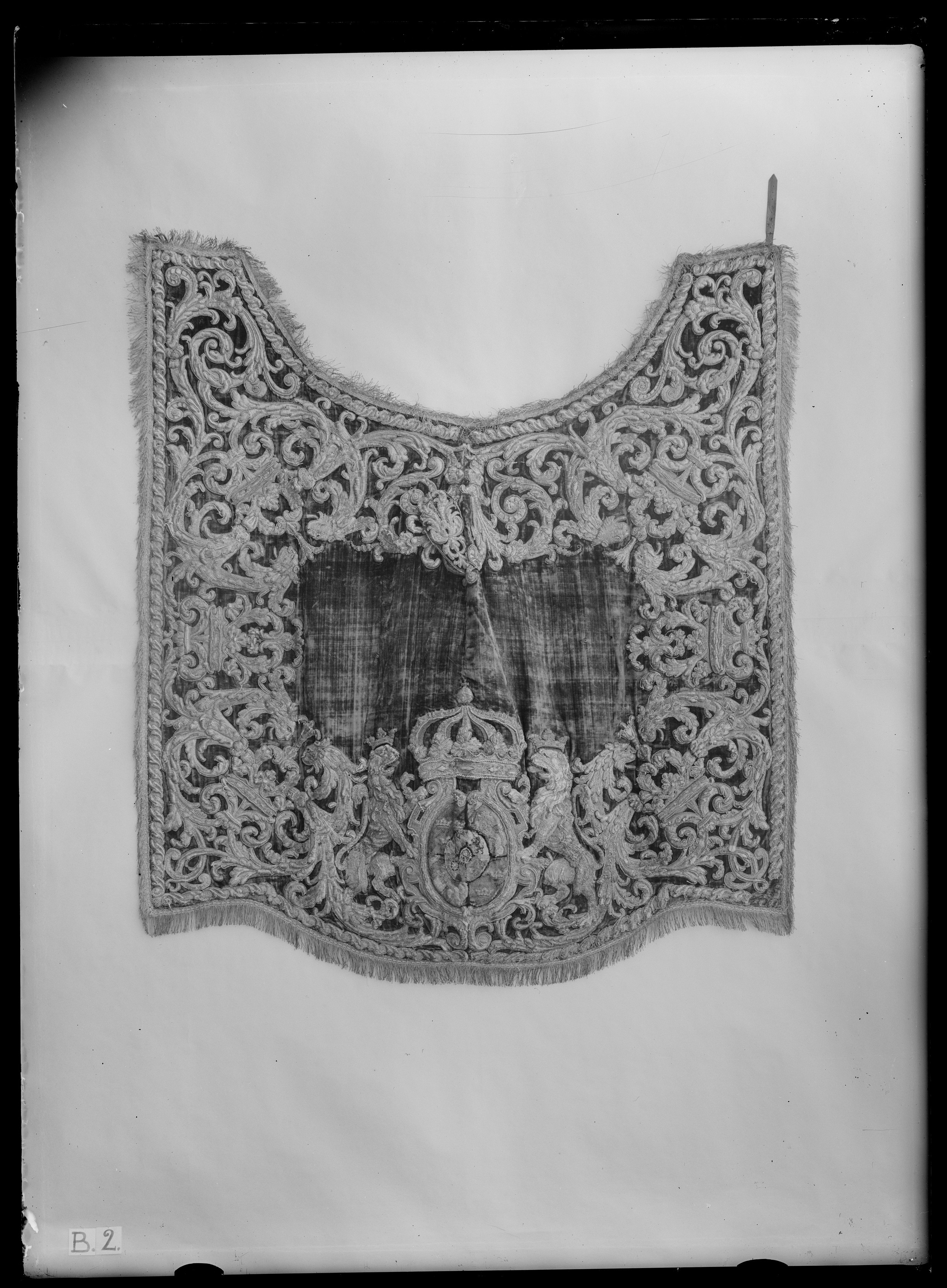 Av samma typ som nr 4036. Frans, b: 55-60 mm, med "stad" av guld, silver och vitt linne, den drejade fransen är av guld- och silvertråd. Vänster framstycke samt översta delen av anslutande parti av inskärningen framtill kantas av en frans av samma typ, i denna frans ingår dessutom vita linnesnodder, fransen l: 250 mm. Kåpa för sadelknappen, l: 215 mm, placerad nedanför inskärningen. Lejonens ögon markerade med knappar. På baksidans högra framstycke, nära framkanten, sitter en läderrem 200x18 mm. Remmen sitter nära täckets högra långsida. Ytterligare en rem har suttit nära inskärningen framtill. Innanför samma styckes framkant sitter också två tränsar av linne, ca 65x18 mm. På vänster framstycke, omedelbart innanför framkanten, sitter nära täckets långsida en träns av brunt läder, 50x25 mm, med ett spänne av vitmetall, 23x30 mm. Rester av en likadan träns sitter på styckets andra hörn nära inskärningen. Ca 50 mm nedanför inskärningen sitter sex tränsar av vitt skinn, 60x25 mm, med ring av gulmetall, d: 25 mm.