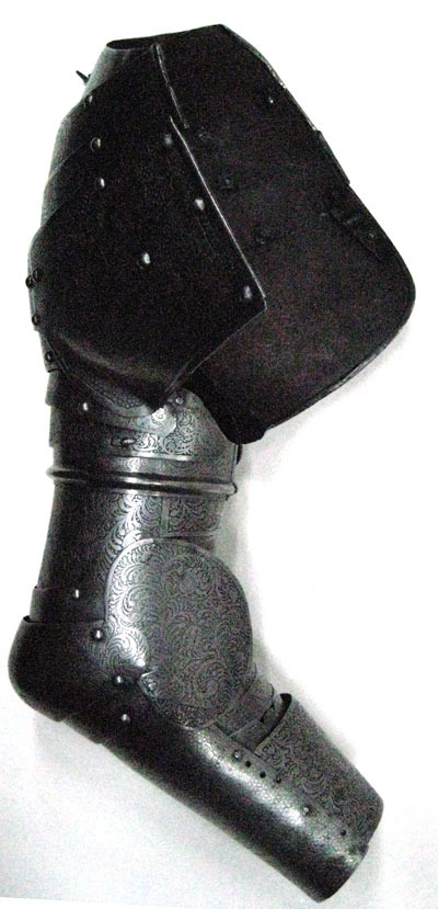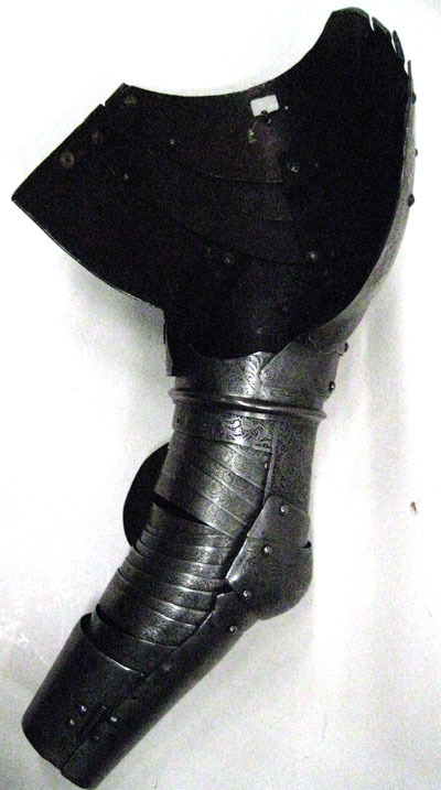 Del av helrustning använd 1660 vid Gustav Horn af Kankas begravning. Rustningen slagen 1658 och etsad av David Casparsson Kohl. Av stålplåt, större delen av utsidan med etsade figurscener. Insidan svart med mörkröd bemålning samt slagmärken. Axelstycket utdraget över bröst och skuldra. Av fyra skenor satta omlott och fästade med läderband på insidan. Nedersta skenan störst. Upptill över axeln remhål och hake fäst dirket i plåten. Nedre del för armen av tre skenor, löstagbar genom nyckelhåls-hål och utstående nit på baksidan och vridbar tapp på framsidan. Överarmsskenor rörformiga, sammanlänkade via driven och i sidled rörlig led. Buckla med två skenor. Bucklan slät, mot utsidan oval vinge något osymmetrisk. Över armvecket 14 mindre skenor satta från varsitt håll. Nertill utgör de övre delen av underarmsskenan. Denna rörformig av två halvor, den yttre betydligt större den inre endast 102 mm lång. Nedre kant snett avtagen. Öppningsbar med gångjärn på insidan och tapp genom hål på utsidan.
