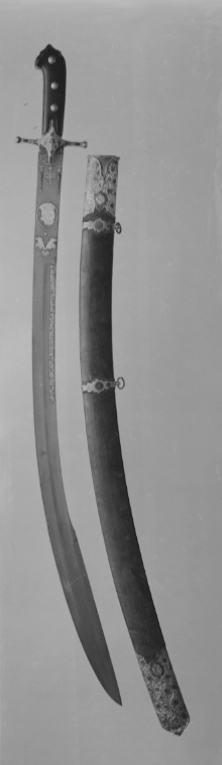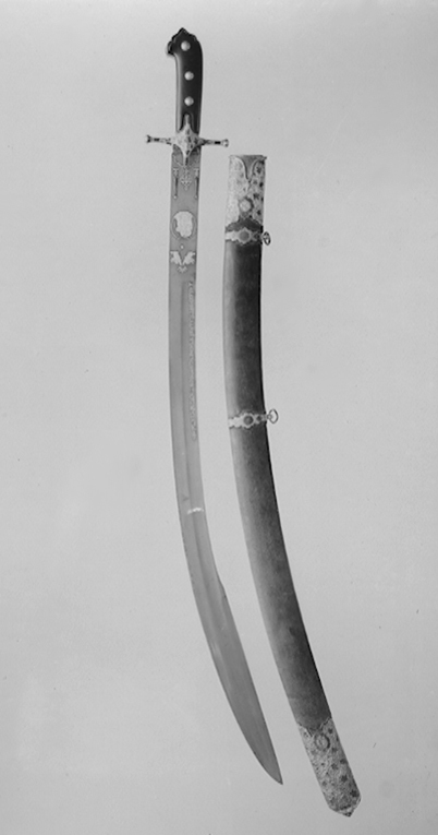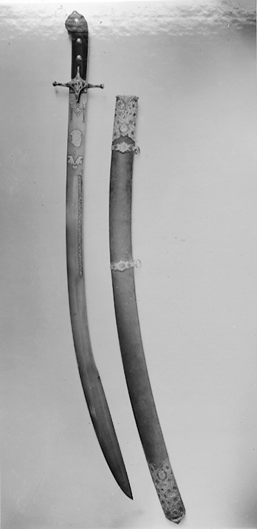 Balja klädd med svart skinn (ryssläder). Beslag av silver med graverad blomdekor, delvis i niello. Munbleck med konturerad nederkant, upphöjd styrkant för styrskenen. Två konturerade mellanband med ringar för sabelkopplet, den övre vid munblecket. Den nedre mitt på baljan. Doppsko med konturerad överkant, rundad nederända, därpå fäst stötspets av silver i form av v-formig platta med räfflad utsida.