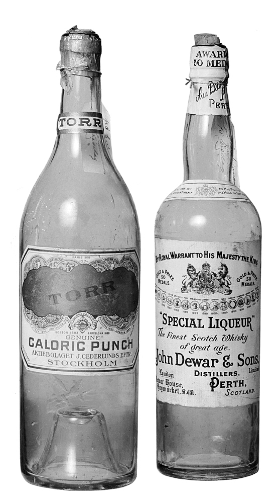 TOMBUTELJER, tre stycken. Bestående av en punschbutelj och två whiskybuteljer. Punschbutelj (en liter): Caloric Punsch, Aktiebolaget J. Cederlunds Eftr., Stockholm. Av färglöst glas. Cylindrisk, med sluttande skuldra, och smal cylindrisk hals med stärkring; bottnen konisk, högt uppskjutande. Etikett vit, på denna text och prismedaljer i guld och gredelint, på etikettens baksida med skrivstil text i svart; på halsen en liten etikett, varpå ordet TORR i mörkgredelint mot vit botten; kring kanterna en guldbård. Kapsylfragment av förtent bly, ofärgat, under detta fragment av banderoll i brunt med Svenska Statens skattemärke på 60 öre. Höjd: 32,8 cm.; diameter: 8,9 cm. Whiskybuteljer (helbuteljer), två stycken: "Special Liquerur", The Finest Scotch Whisky of great age, John Dewar & Sons, Limited, Distillers, Perth, Scotland. Av färglöst glas. Cylindriska, med kupigt indragen skuldra och spolformig hals med en bred och en smal stärkring; bottnen insänkt. Etikett vit, på denna text, Storbritanniens riksvapen samt prismedaljer i svart; på skuldran en liten etikett, varpå text i svart och svenska riksvapnet i rött (firman leverantör åt dåvarande konungen av Sverige). Kapsylfragment av förtent bly, ljust gråfärgat, på detsamma i svart relief text samt vapen som på stora etiketten. Höjd: 31 cm.; diameter: 7,8 cm. Gåva till Wilhelmina von Hallwyl Julaftonen 1918 från hennes svärson förste kammarherren Carl Wilhelm Thure von Eckermann. Gåvan åtföljd av ett poem, se III: N. d. 01. Bevarade i huset n:r 4 Hamngatan, Stockholm, från åren 1898-1929.