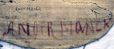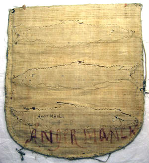 Vapensköld av blå sidenatlas med tre bjälvis ställda laxar, den mellersta vänstervänd. Laxarna är broderade med silvertråd med spår av förgyllning samt med brun silkestråd. Beväringen är av röd och svart silkestråd. Ögonen utgörs av en svart pärla runtom kantad av silvertråd. Vapnet kantas av en tjockare och en smalare snodd av silvertråd med spår av förgyllning samt av vit silkestråd samt ett smalt silverlan, omvirat av en silvertråd utdragen i små öglor. Vapnet är fodrat med linnelärft. I nederkanten på baksidan av skölden står en påskrift: "ÅngerMANnLn" och därunder står märkt med blyerts: "No 28". I nederkanten av skölden står en påskrift med stora rödmålade bokstäver: "ÅNgeRMANLAN".