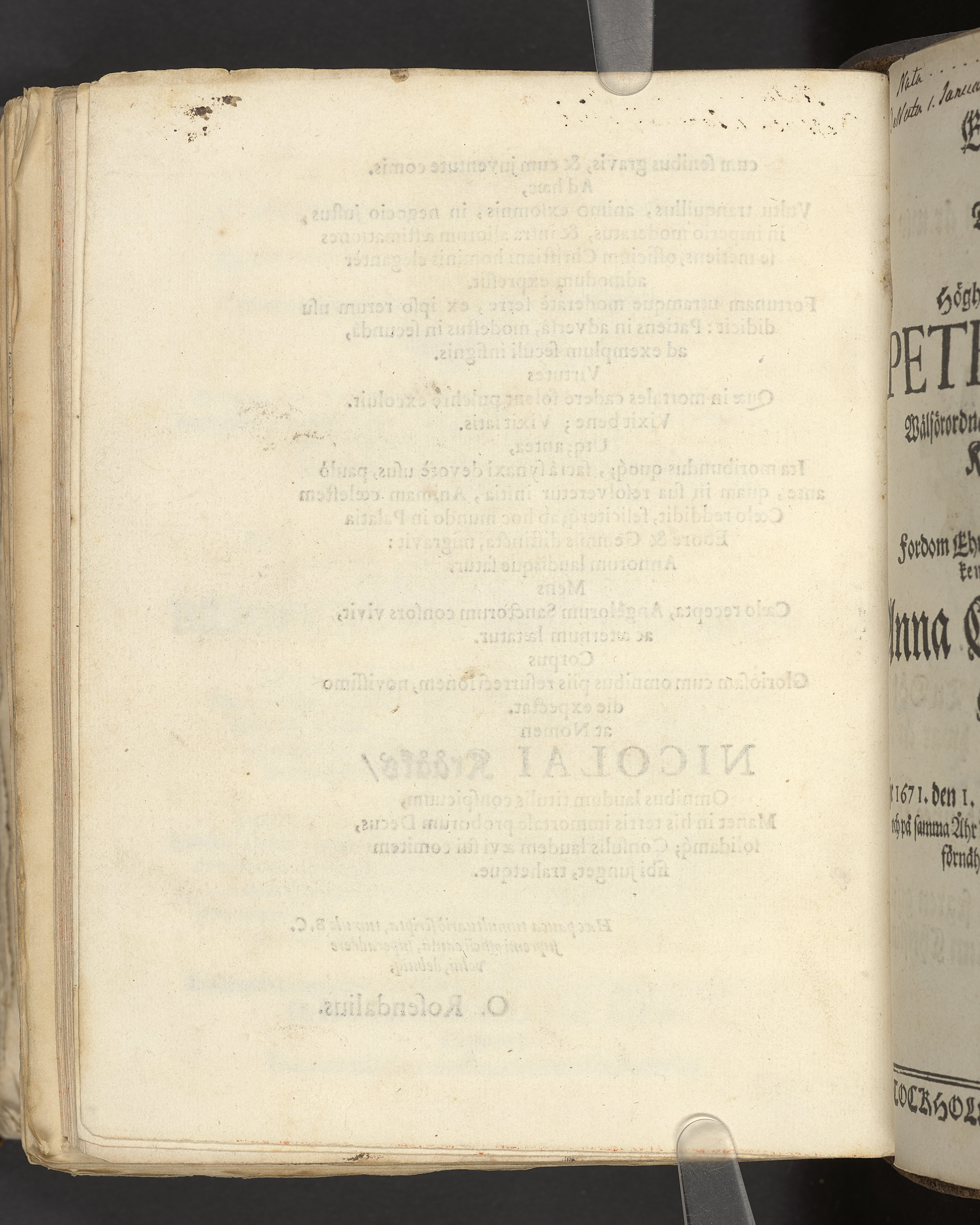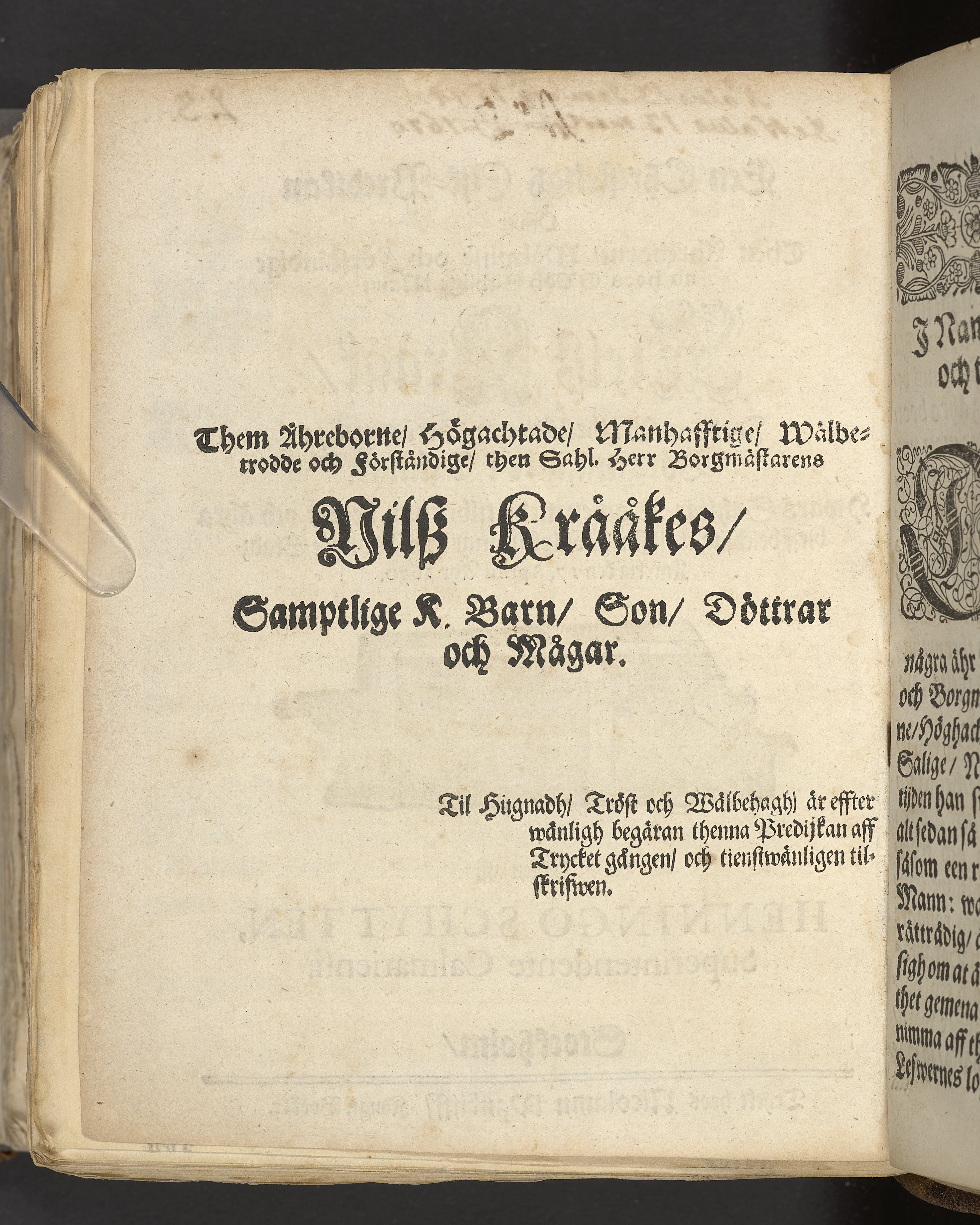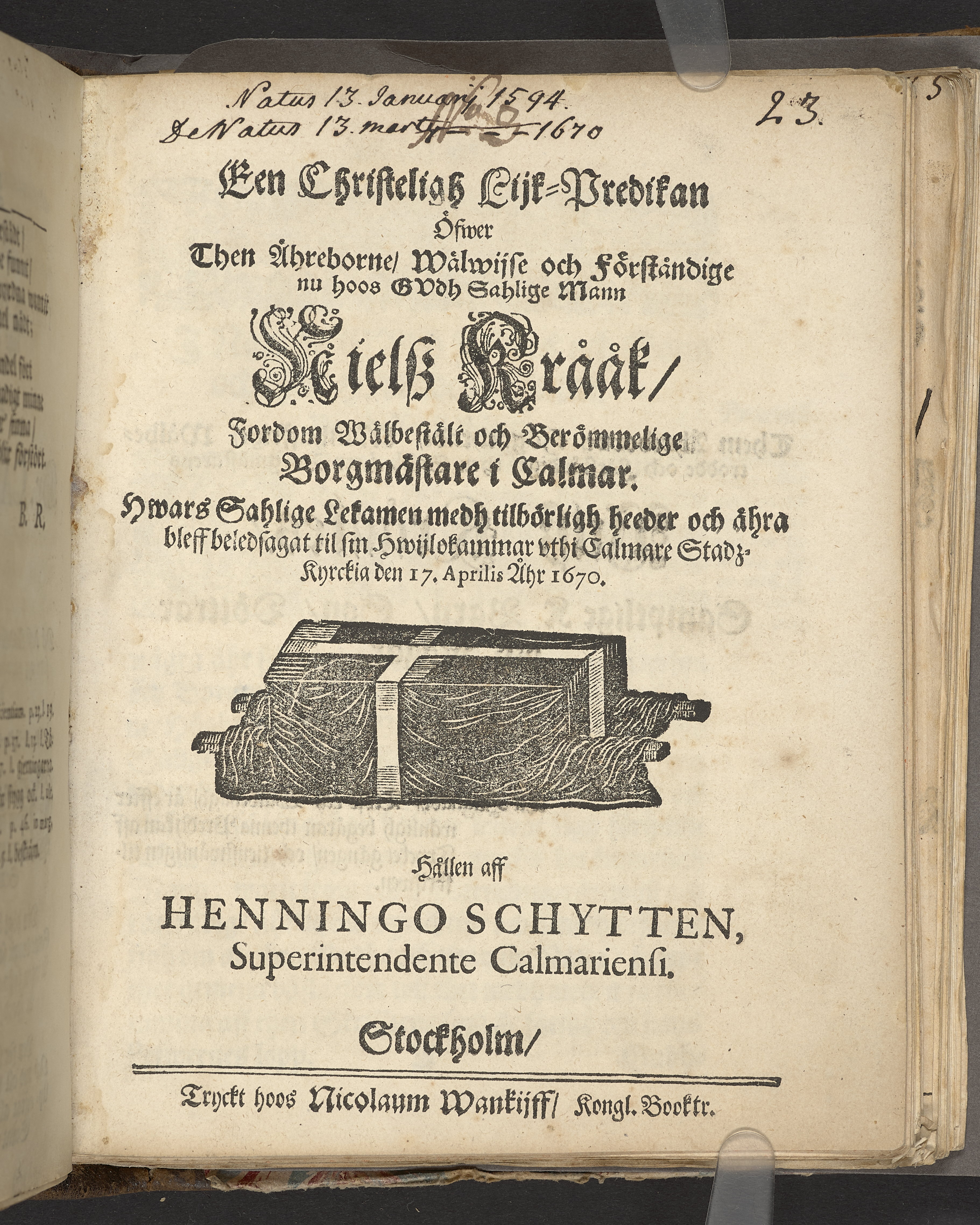 Een christeligh lijk-predikan öfwer ... Nielsz Krååk, fordom wälbestält och berömmelige borgmästare i Calmar ... vthi Calmare stadz-kyrckia den 17. aprilis åhr 1670. Hållen aff Henningo Schytten, superintendente Calmariensi. Stockholm, tryckt hoos Nicolaum Wankijff, kongl. booktr.