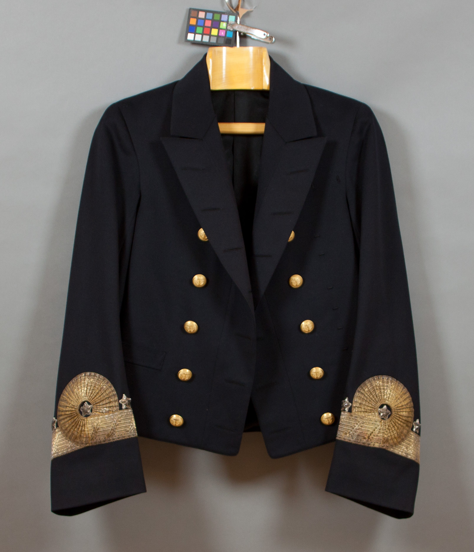 Mässjacka, midjekort, dubbelknäppt, av mörkblått kläde med fällkrage, svagt välvda knappar av förgylldmässing, dekorerade med ankare och tre kronor, d: 23 mm. På insidan av knapparna firmamärke: "M.PETTERSSON STOCKHOLM". Gradbeteckningar på ärmarna, en 45 mm bred guldgalon lagd i en ögla, i öglans mittohc på dess båda sidor en femuddig stjärna av silver. Jackan har två raka fickor utan lock utvändigt samttvå innerfickor. Foder av svart siden, i ärmarna vitt siden. Hängare med firmamärke: "FR.KAEDINGS EFTR. Kongl.Hofleverantörer STOCKHOLM".