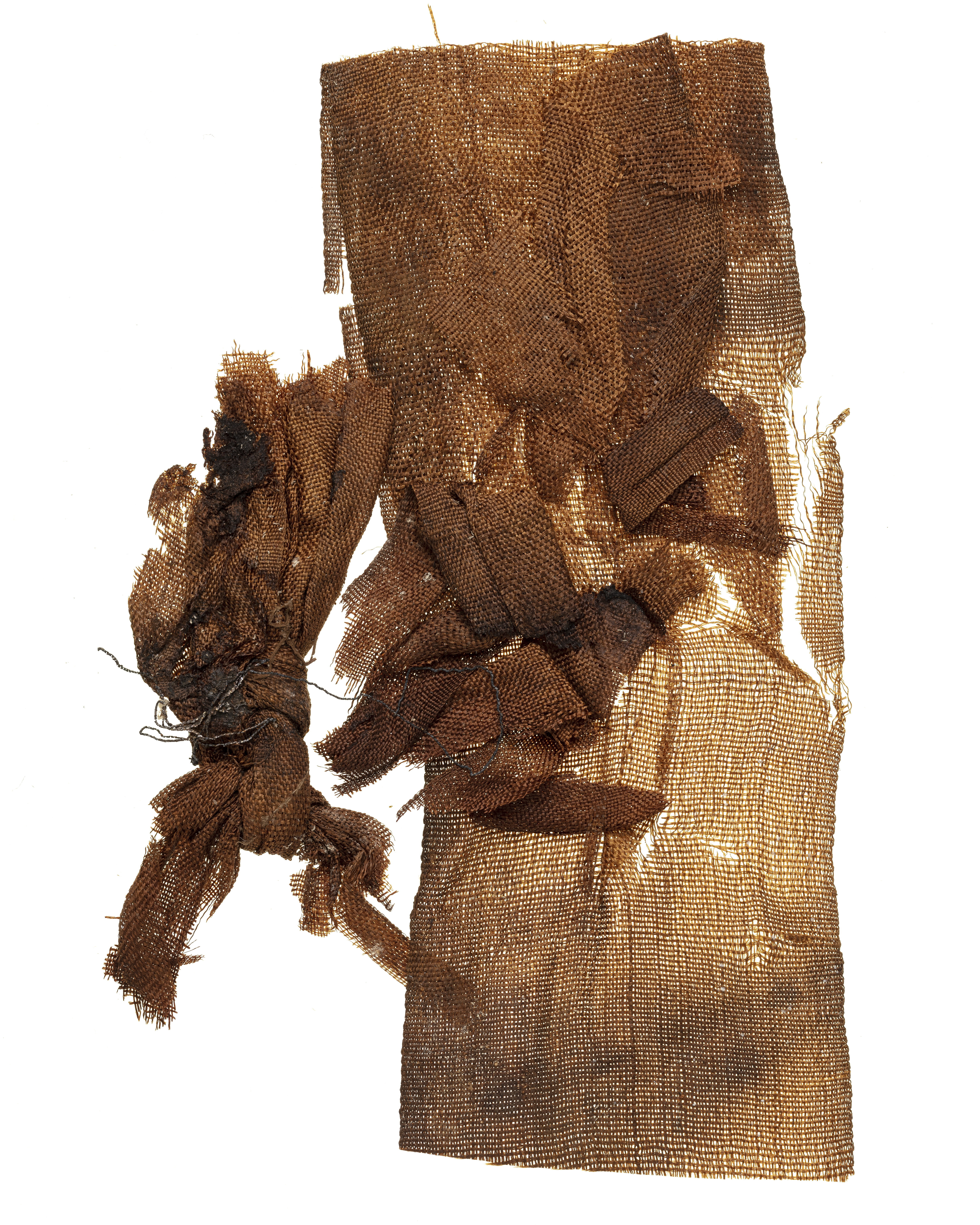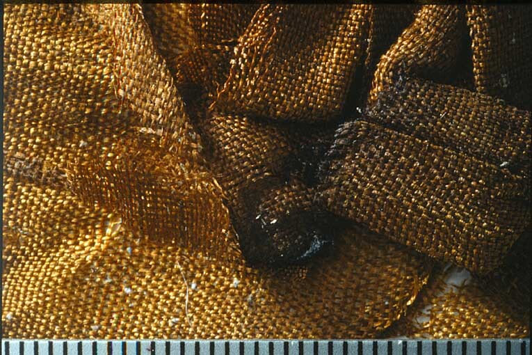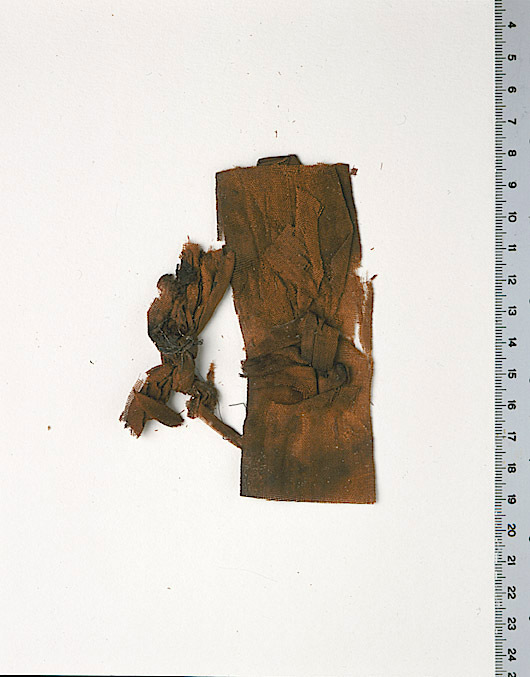 Fragment av band med löst liggande knut med metalltråd löst liggande ovanpå samt lösa fragmentbitar ovanpå. Påträffat invid huvudet. Fragmentet ingår i en samling fragment tagna som prov ur drottning Kristinas kista vid gravöppningen den 13-14 december 1965. Varp: 2-trådigt silke löst spunnet i z-snodd, tvinnat i s-snodd. Trådtäthet: 26 trådar/cm Inslag: 2-trådigt silke löst spunnet i z-snodd, tvinnat i s-snodd. Trådtäthet: 18-24 trådar/cm Material: Silke. Teknik: Tuskaft. Kommentar: Två grövre varptrådar med 3 mm mellanrum finns mitt på väven och återkommer på samma ställe på fragment 32994, 32996, 32997, 32998 och 33001, eventuellt också 32999. Nuvarande färg är brun. Bandet är invikt i ena änden. Metalltråden: Lan förgyllt på båda sidor, virat runt silkekärna, guldskiktet <0,1 um. Tjocklek ca 0,02 mm. Metalltråden ligger som ett löst "trassel" ovanpå knuten, osäkert om de hör ihop.