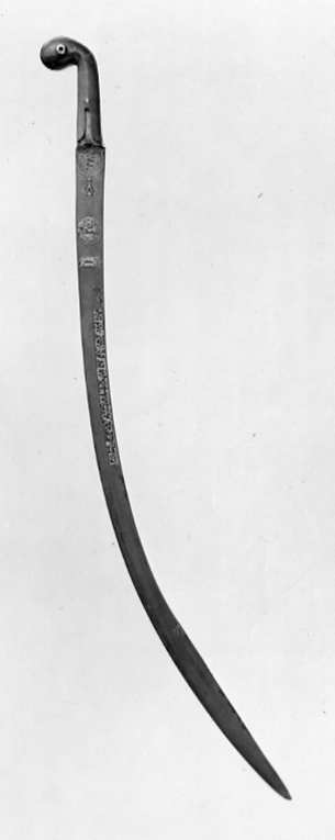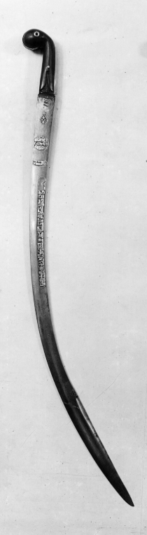 Fäste av polerat trä med rundad böjd ytterände och skenor av försilvrat stål med fräcklad dekor. Genom ytteränden en bössning av silver. Eneggad, damaskerad klinga av stål med plan rygg, böjd med jelman och skålad rand intill ryggen. Klingans utsida har påslagen dekor av guld i form av cirkel med orientaliska skrivtecken och en rad med skrivtecken längs ryggen.