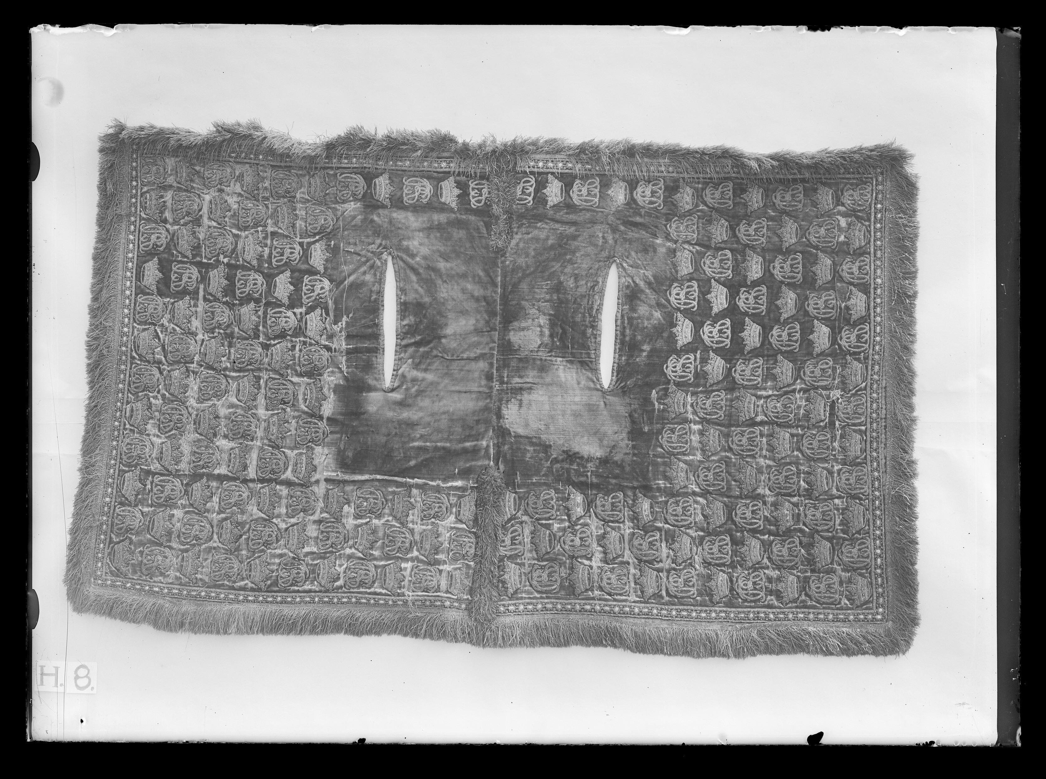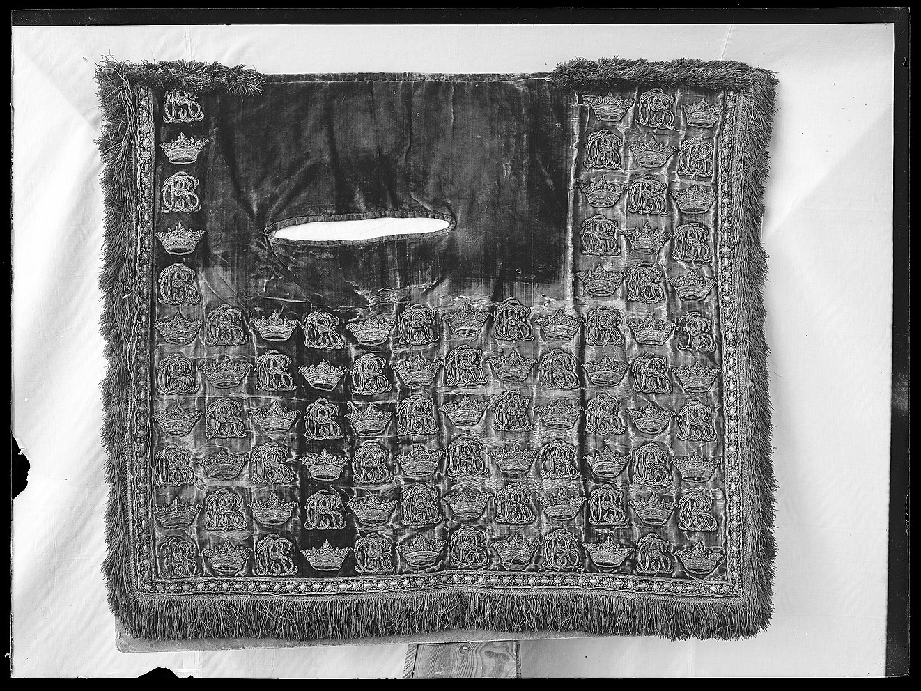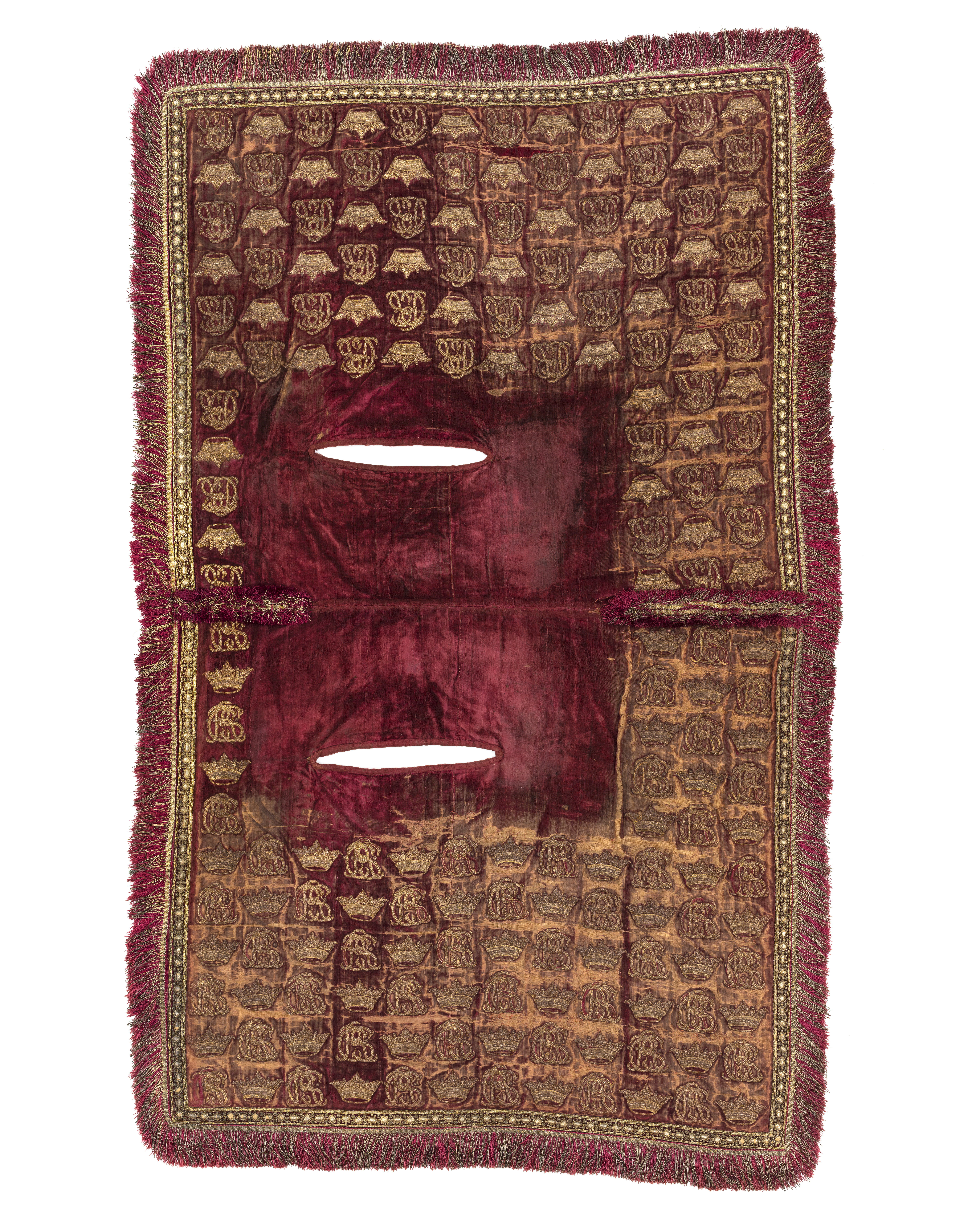 Ett Sadel Täcke eller Wallrapp af Carmoisei Sammet, med rödt Lärft underfodrat och nederomkring med stora Guld i Silke Fransar. Täcket med en bord, broderat med Guld, Pärlstickare arbete; och öfver hela Täcket Hans Kongl. Majsts Namn och Kronor, sammaledes af Guld broderade.