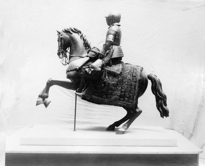- Konung Carl XI:s häst af papp på fotställning af träd med en vid 1672 års carousell nyttjad tornersadel under nr 76 af carmoiseirödt sammet, sätet med guldlister och snören scharnerade, kåporne och karmarne med messingsplåtar, på huardera en förgl.messingsknapp.