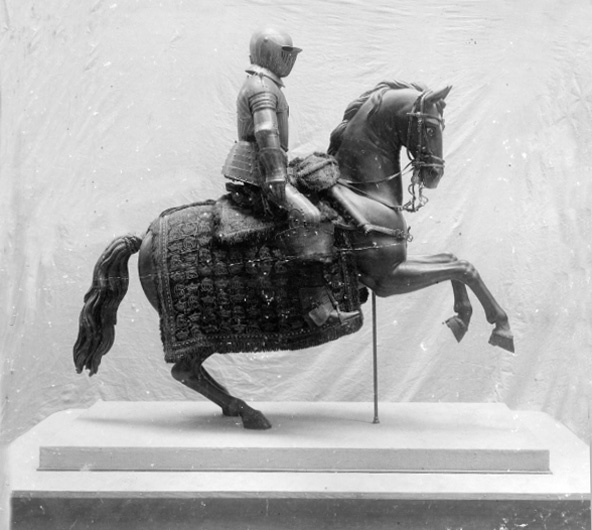 derpå sittande en karlfigur med bröst och ryggharnesk af drifvet förgyuld messing, svärd med förgyllt messingsfäste, sköld, romerskt skärp af sämsk med förgylda messingsornamenter, vapenkjortel af rödt sammet med bred guld- och silfvergraman nedan omkring och broderade skinnkängor samt casquette eller hjelm af förgyld messing under No 514