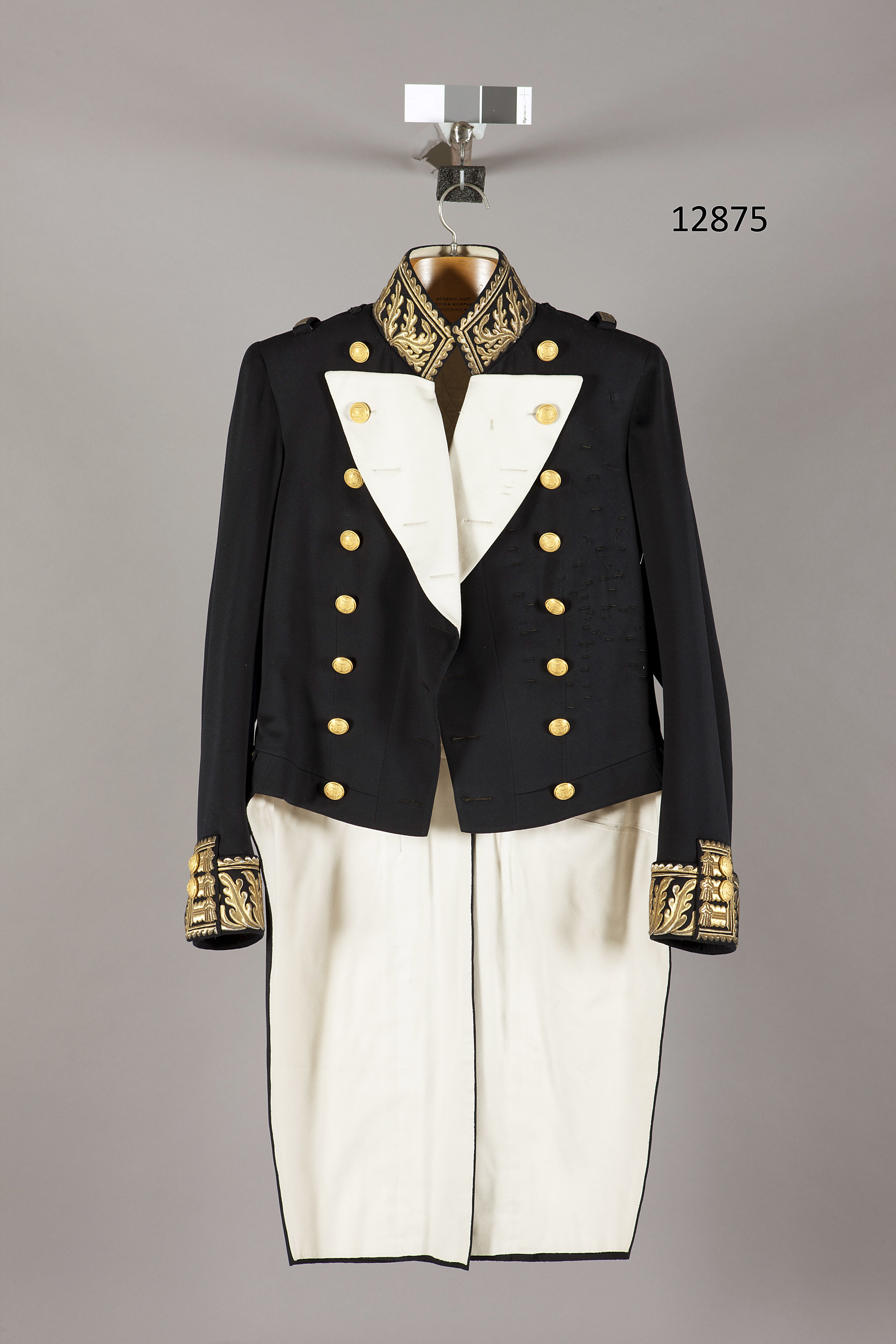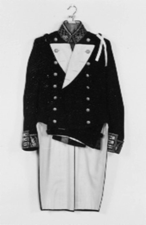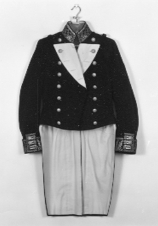 Frack av mörkblått kläde, ståndkrage, vita slag. Två knapprader om åtta knappar, dubbelknäppt. Knapparna förgyllda, välvda med i hög relief ett ankare och tre kronor, d: 23 mm, på undersidan firmamärke: " C.C.SPORRONG et C:o // STOCKHOLM ". Ståndkragen är broderad med eklöv och vågbård i guldtråd. På slagens insida, som normalt är synlig vitt kläde med det översta knapphålet knäppt med den näst översta knappen. På v. slag och sida tränsar. På var axel en kort tyghälla och en styv hälla med guldbroderi för amiralitet. Nedtill på ärmarna slag, h: 85 mm med eklöv och vågbård i guldbroderi, klaff med guldbroderi och tre knappar, som föregående allt i samma utförande som armens m: 1845 för generalitet. Ryggstycke i fyra delar, delade skört. I livsömmen två guldtrådsborderade, konturerade ficklock med vardera tre knappar på skörten under. Vid skörten tre knappar vid de spetsiga, släta skörtklaffarna. De översta knapparna i livsömmen fickor i båda skörtsömmarna. Foder av vitt kläde. Livstycket fodrad med matlasserad bomullssatäng. En stolpficka i var bröst och en i v. skört. Fickorna fodrade med diagonalvävd ylletyg. Ärmfoder av vit bomullssatäng. I h. bröstficka en vit vaxduksetikett: " F. KAEDINGS EFTERTRÄDARE // STOCKHOLM 2:1 1908 // Herr H. M. Konungen ". Tygögla i var ärm.