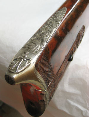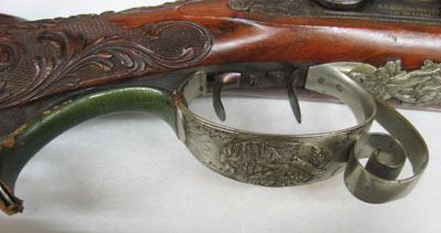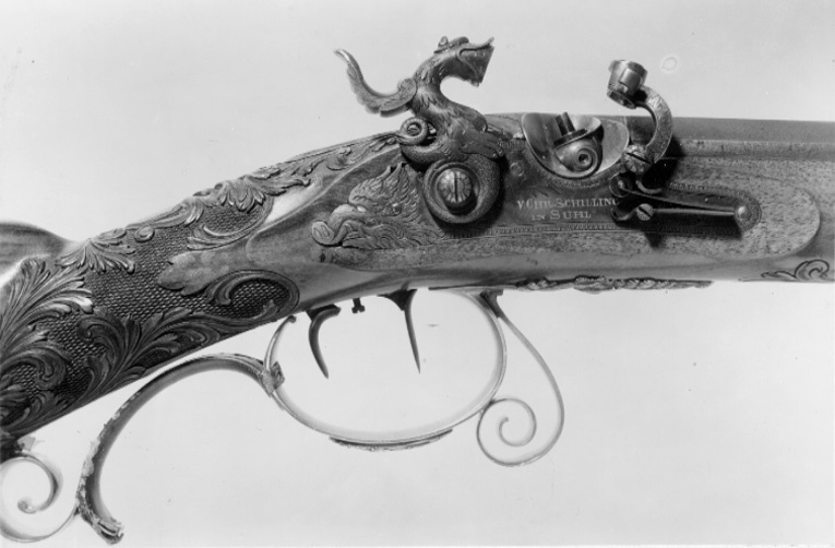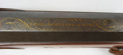 Åttsidig damaskerad pipa av stål, 8 räfflor med plana bommar. Pipan förlängd 33 mm med ett blåflammigt parti, graverade rankor, liksom på svansskruvbladet, dubbla guldlinjer. På h. sida urtagning för tändhattsnippel. På kammaren guldsignatur, omgiven av rankor "V.CHR. SCHILLING IN SUHL". Riktmedel: Inlaxat klaffsikte av flammigt stål med pilspetsformad gren riktad framåt. Inläggningar i guld i blixtform runt siktet. Inlaxat spolformigt stolpkorn av silver, omgivet av guldstrålar. På pipans undersida graverat "V S", "1", "S", "1096". Fästning: Två inlaxade häften för engelska stift, ett inlaxat häfte för fäste av remöglan. Pipan fäst med två krysskruvar, två engelska pipstift av blånerat (?) stål samt främre rembygelns skruv. Plant, blånerat låsbleck, l: 128 mm, sicksackkantbård, baktill ett graverat vildsvinshuvud, öga och näsborrar av guld. Framför hanen signatur i guldskrift: "V.CHR.SCHILLING IN SUHL". Hanen drakformad i delvid fri relief, ögon och örat på utsidan förgyllda. På bleckets främre del finns ett fjäderbelastat skydd för nippeln. fjäder med hjul, c-formigt fjäderlöv. Avtryckarstång, studel och nöt är blånerade. På låsbleckets insida stämplat "I.M.", "1096". Fästning: Två blånerade låsskruvar. Avtryckare med snälltryck, båda blånerade. Brun helstock av valnöt. Engelsk kolv med kindstöd och kolvlåda. Kraftig, snidad rankdekor vid kolvände, kindstöd på kolvlådelock, kolvhals och framstock samt vid svansskruvbladet. På kolvlådelocket maskaron, där tungan utgör tryckknappen. Nätmönstrad kolvhals och framstock, på kolvhalsen en rektangulär silverbricka. Bakplåt av silver, stämplad "1096", spetsig häl, på ryggfliken naturscen med jägare i relief. Låsbrickor av silver, bladformat reliefmönster. Spetsrörka av silver med bakåtriktad spets med en hund och en uggla i relief. Mellan- och överrörka av silver med pärlstavskanter. Näsband av ben. Varbygel av silver på oval reliefplatta med hjort. Vid framstolpen spiralformigt silverband. Bakre armen fri, klädd med grönt, något slitet skinn, baktill nedåtsvängd med spiralformig stolpe. Främre armen konturerad, dekor med en uggla och en orre i relief. Tillbehör: I kolvlådan fyra kulor, d: ca 14 mm, och ett papper med instruktion för bössa. Axelrem, l: 190 mm, av ljusbrunt läder.