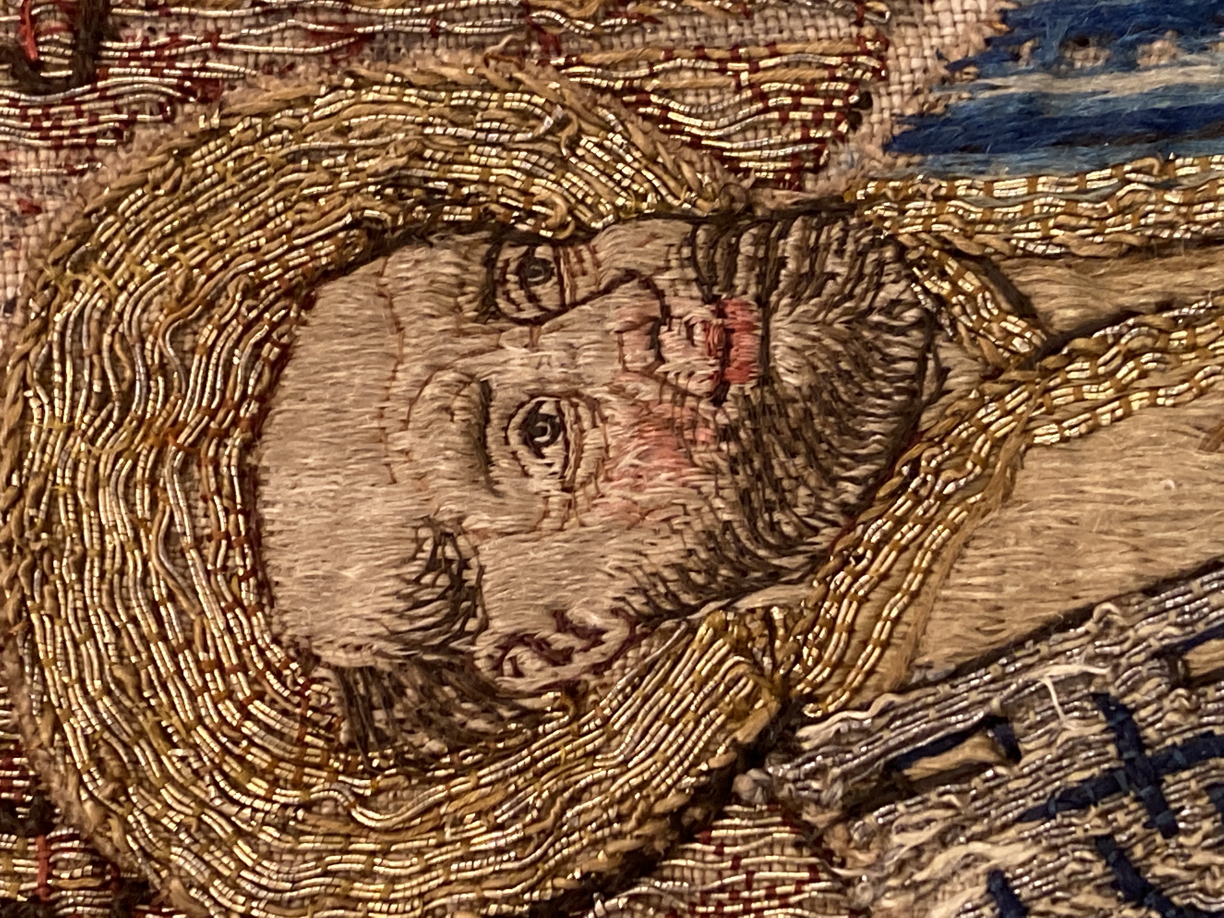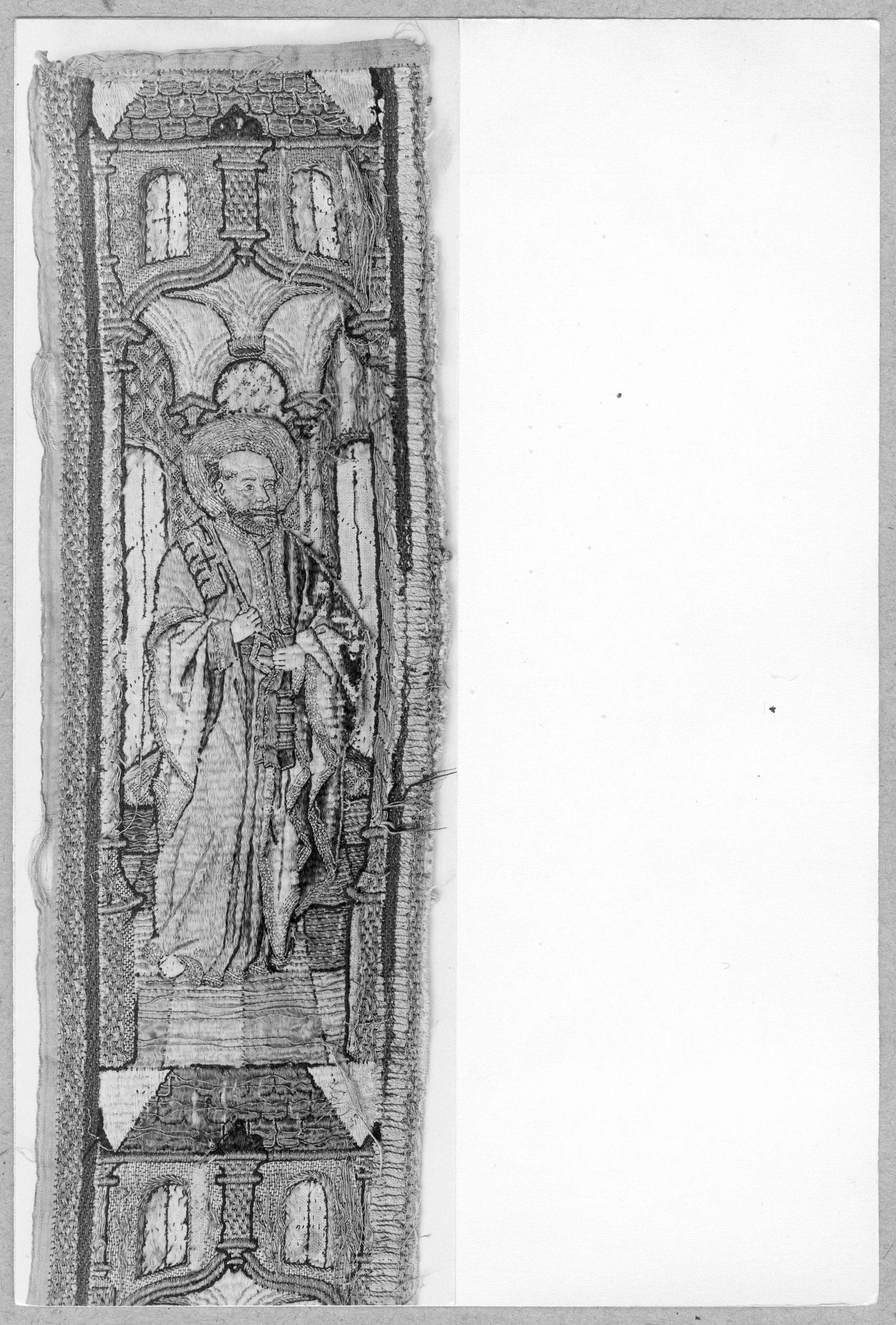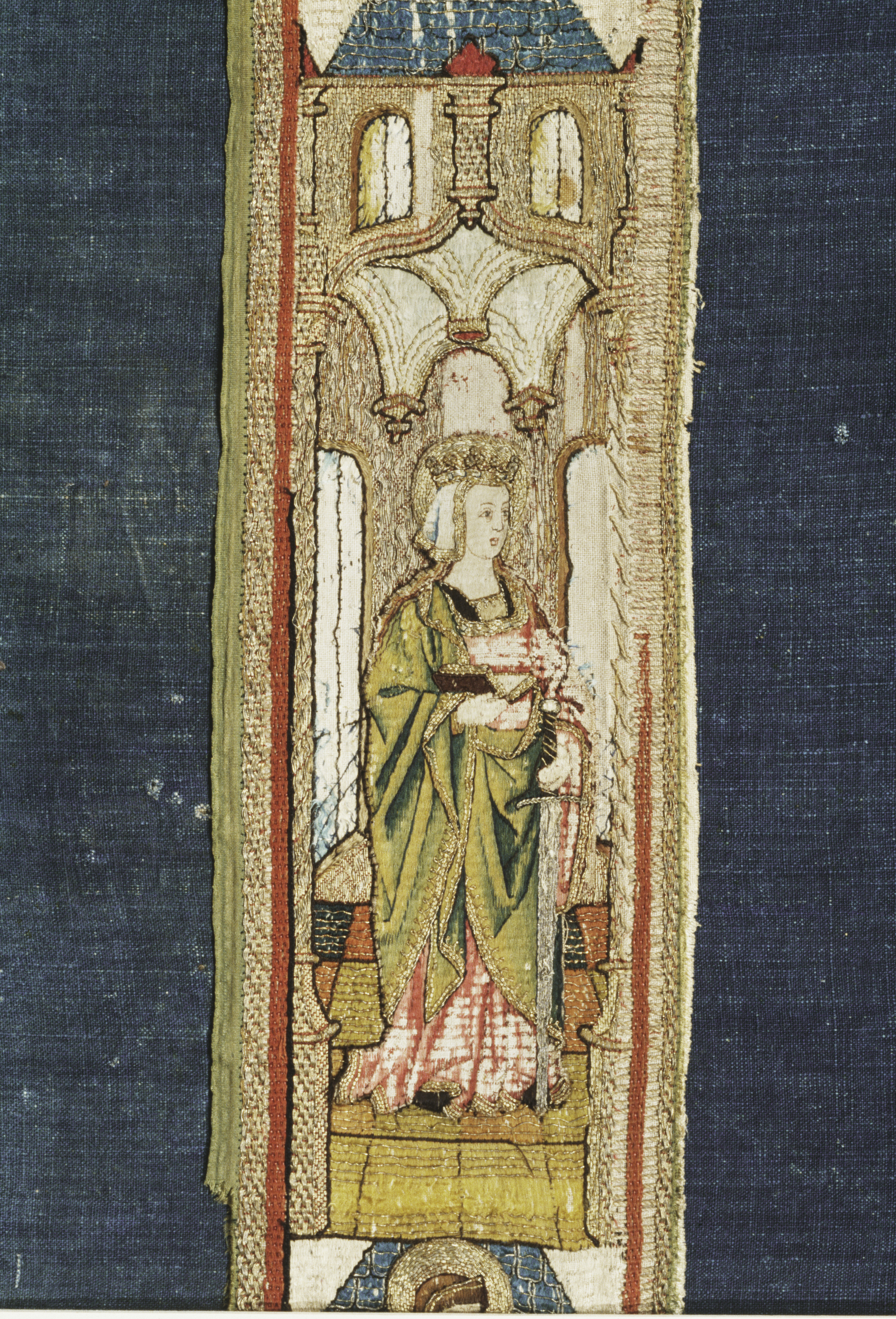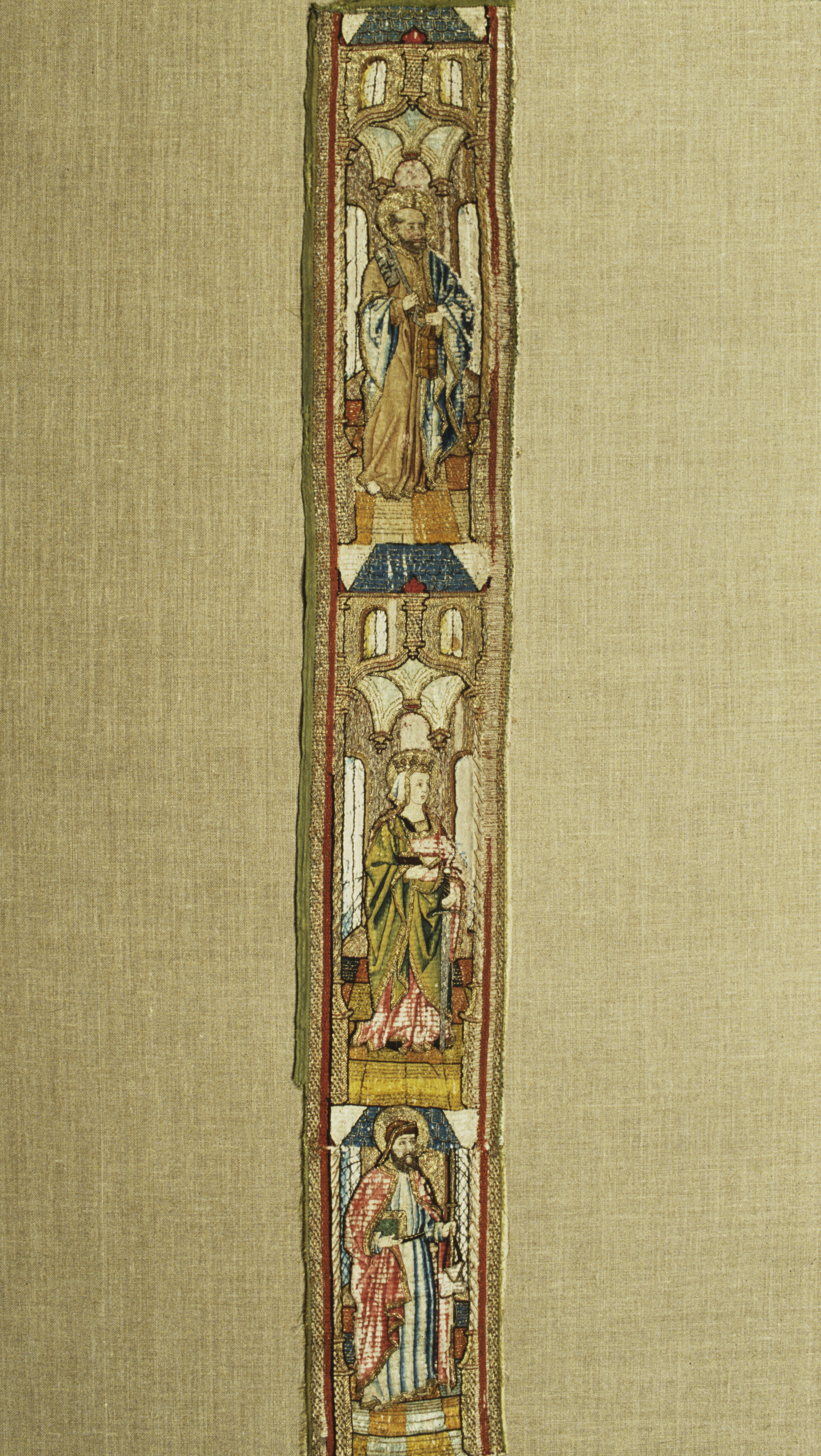 Figurbroderi, S. Petrus, S. Katarina och S. Jakob dä. Inköpt 1890.(Utställd 1997) Från en okänd kyrka kommer det nederländska brämet med St Petrus, St Katarina och St Jakob d.ä.
