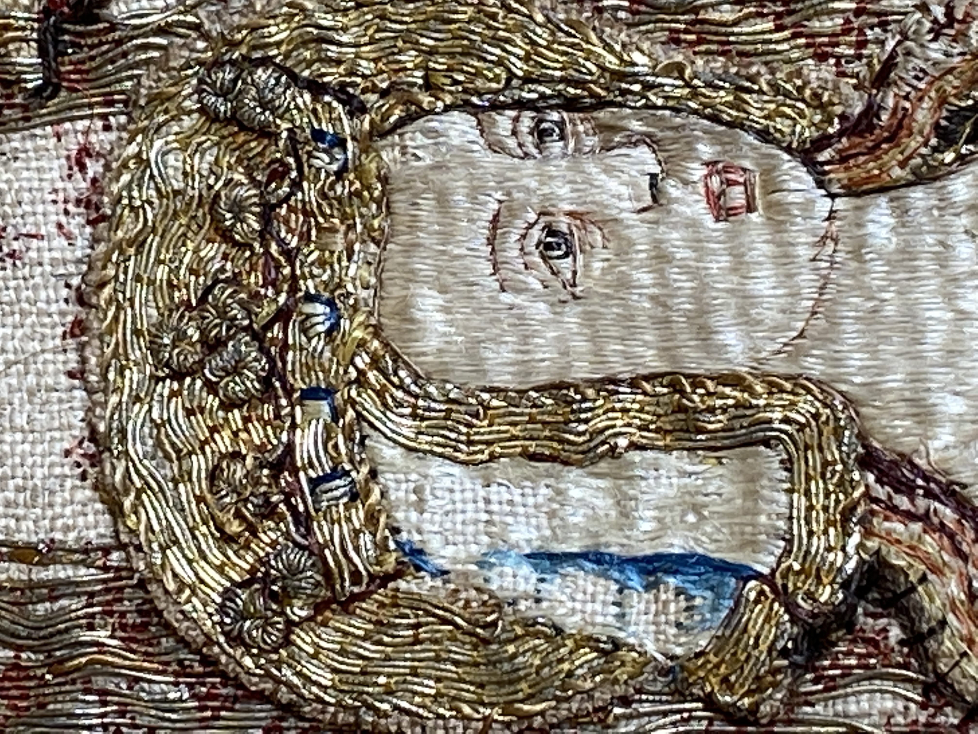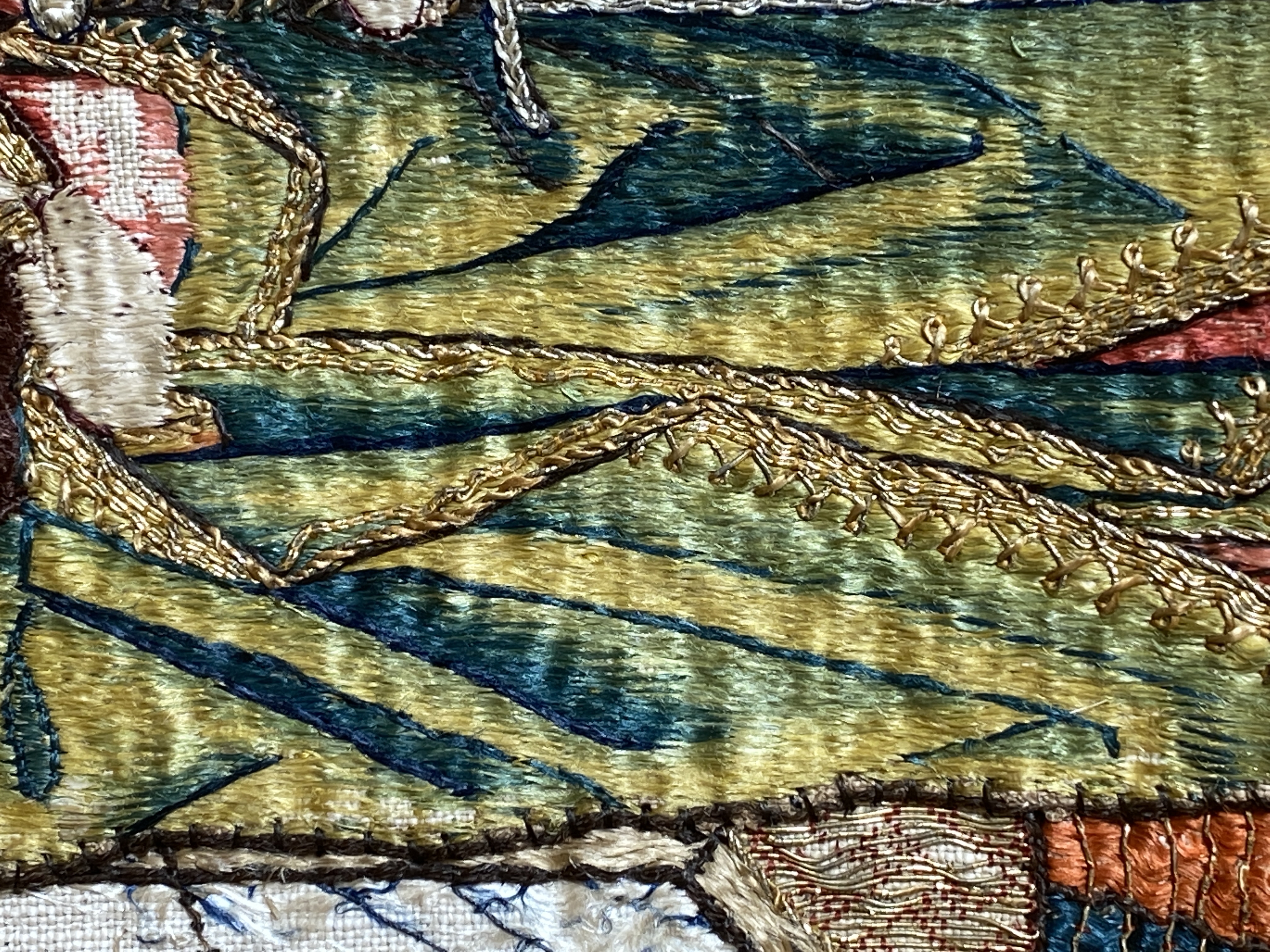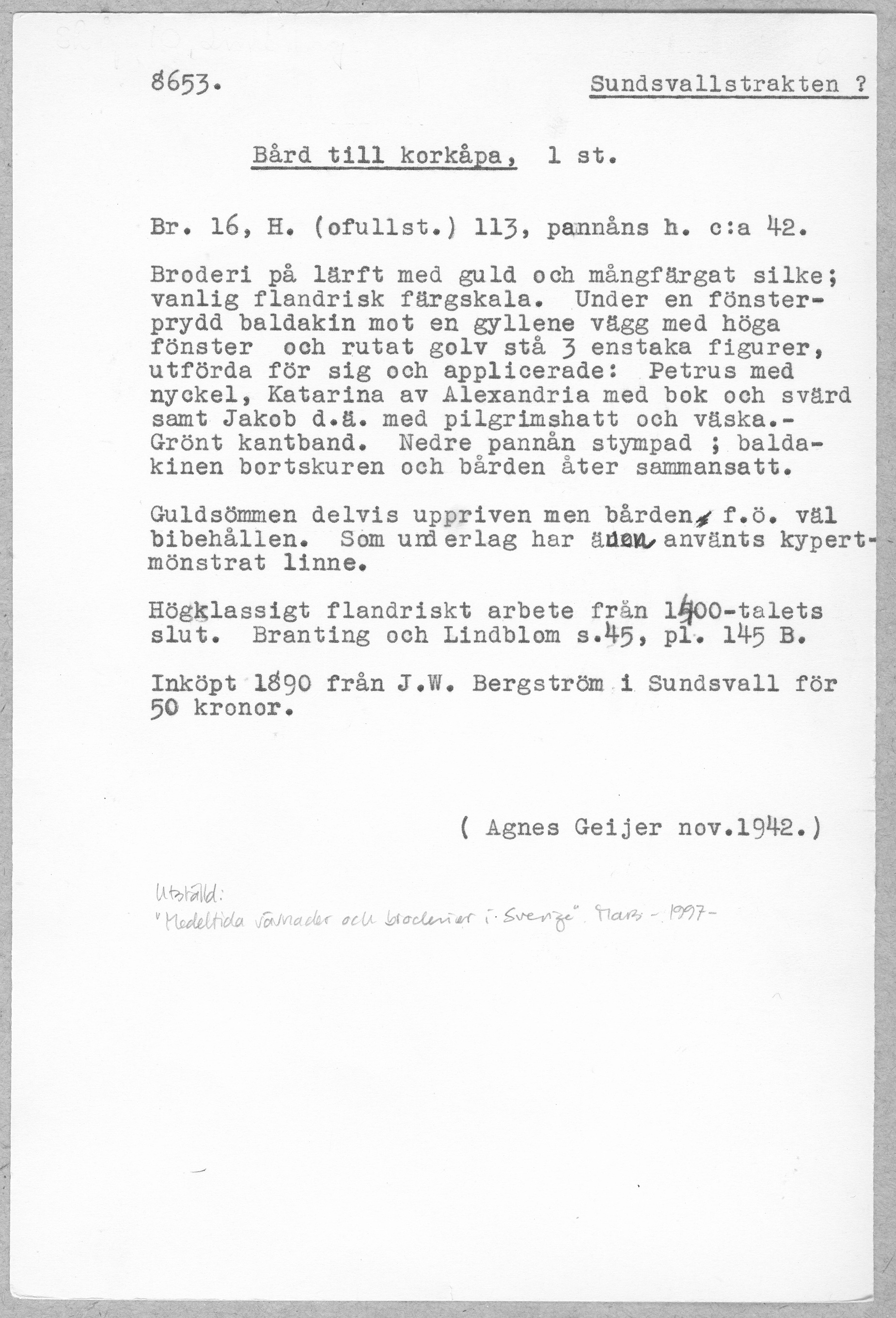 Figurbroderi, S. Petrus, S. Katarina och S. Jakob dä. Inköpt 1890.(Utställd 1997) Från en okänd kyrka kommer det nederländska brämet med St Petrus, St Katarina och St Jakob d.ä.