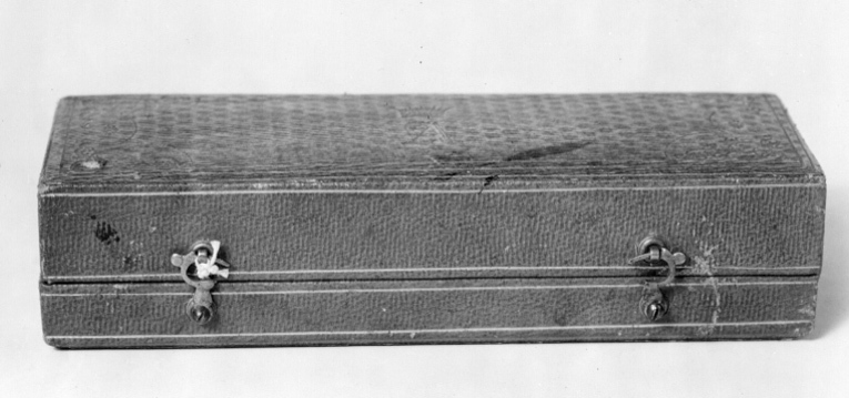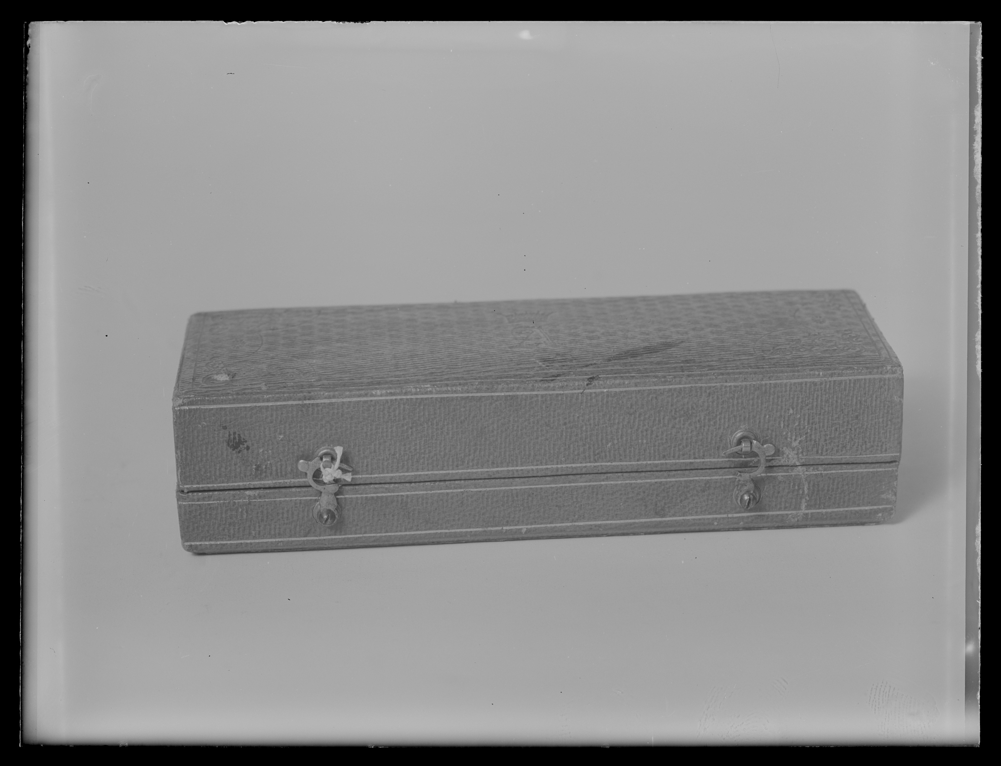 Rektangulärt etui av trä med svagt välvt lock. Utvändigt klädd med rött skinn, på undersidan med karminrött papper, pressat i blomsterrankor och banddekor. Dekor i guldpressning, på locket dubbel kantlinje samt därinnanför bladrankor i hörnen ,solformiga ornament på kortsidorna, därinnanför ram med raka långsidor och kortsidorna i tre bågar. Mittpå locket fraktur-A, krönt av svensk hertigkrona. På etuiets sidor kantlinjer i guldpressning. Stängning med två hakar av gulmetall. Locket invändigt klätt med vitt siden, i underdelen fast insats klädd med lila sammet, urtag förstampen.