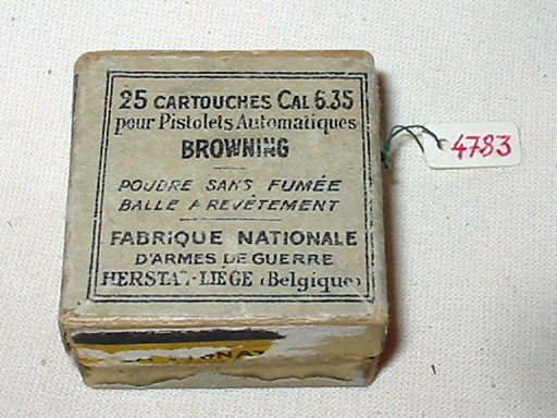 Ask för 25 kulpatroner (nr 4781) kal. 6,35, till pistol nr 4777 "ACP Pistolet Browning Cal. 6.35Triple surete", m: 1906, Vestpocket Browning, Fabrique National, Herstal.