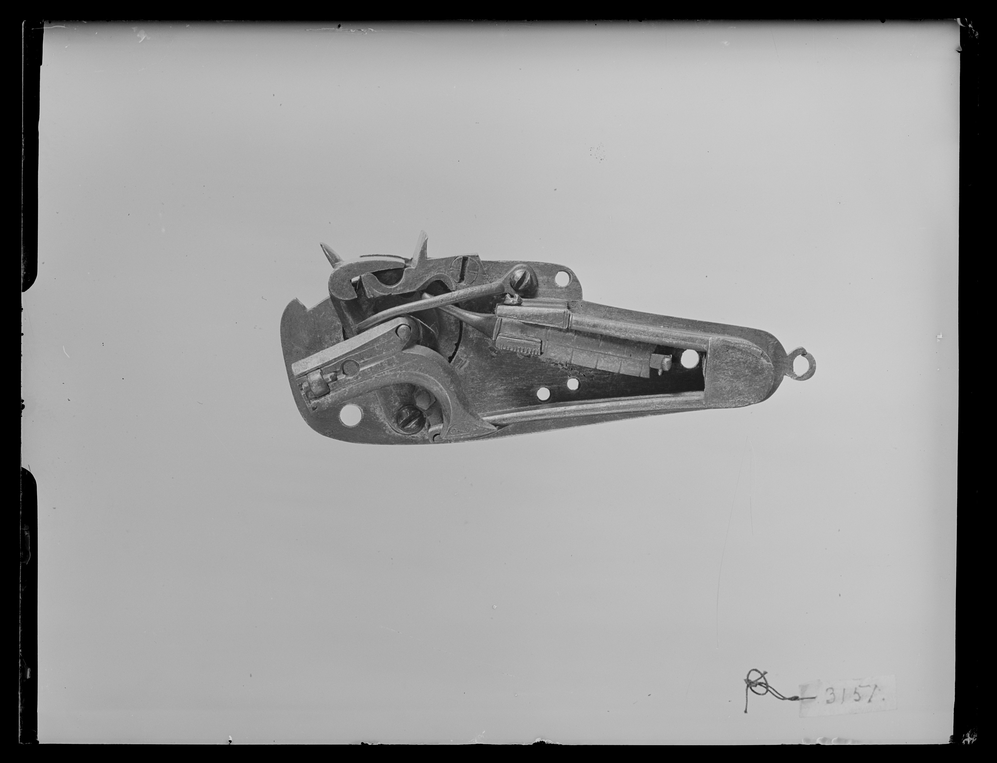Hjullås med plant låsbleck, rundad framände, ring vid bakänden. Etsad rankdekor, otydlig stämpel H K bakom hjulet, vid nederkanten Nürnbergs stadsstämpel. Hjul fäst med ring, etsad dekor av bladstavar, välvd, förgylld kapsel med etsad dubbelörn. Fängpanna med svängd ytterkant, låg krutskärm. Fängpannelock med styv arm. Övriga låsdelar saknas. Igenom låsblecket en utstickande ring från avtryckarstången.