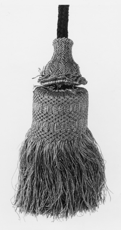 Sex Dito Hals Kappor på lika sätt broderade och med GuldFrnasar omkring infattade i hvardera Kappan äro 2ne stycken Gula Tafftsband; likmätigt förra Inventario, har varit in alles tillstädes på dessa Kappor Nitio Fyra stycken Guldtråds Toffsar, men är allenast Åttatio Njo och således Fem stycken i Rustmästaren Sjömans tid förkomne. /: Feltes 18 st Qvastar vid Inventeringen 1803:/