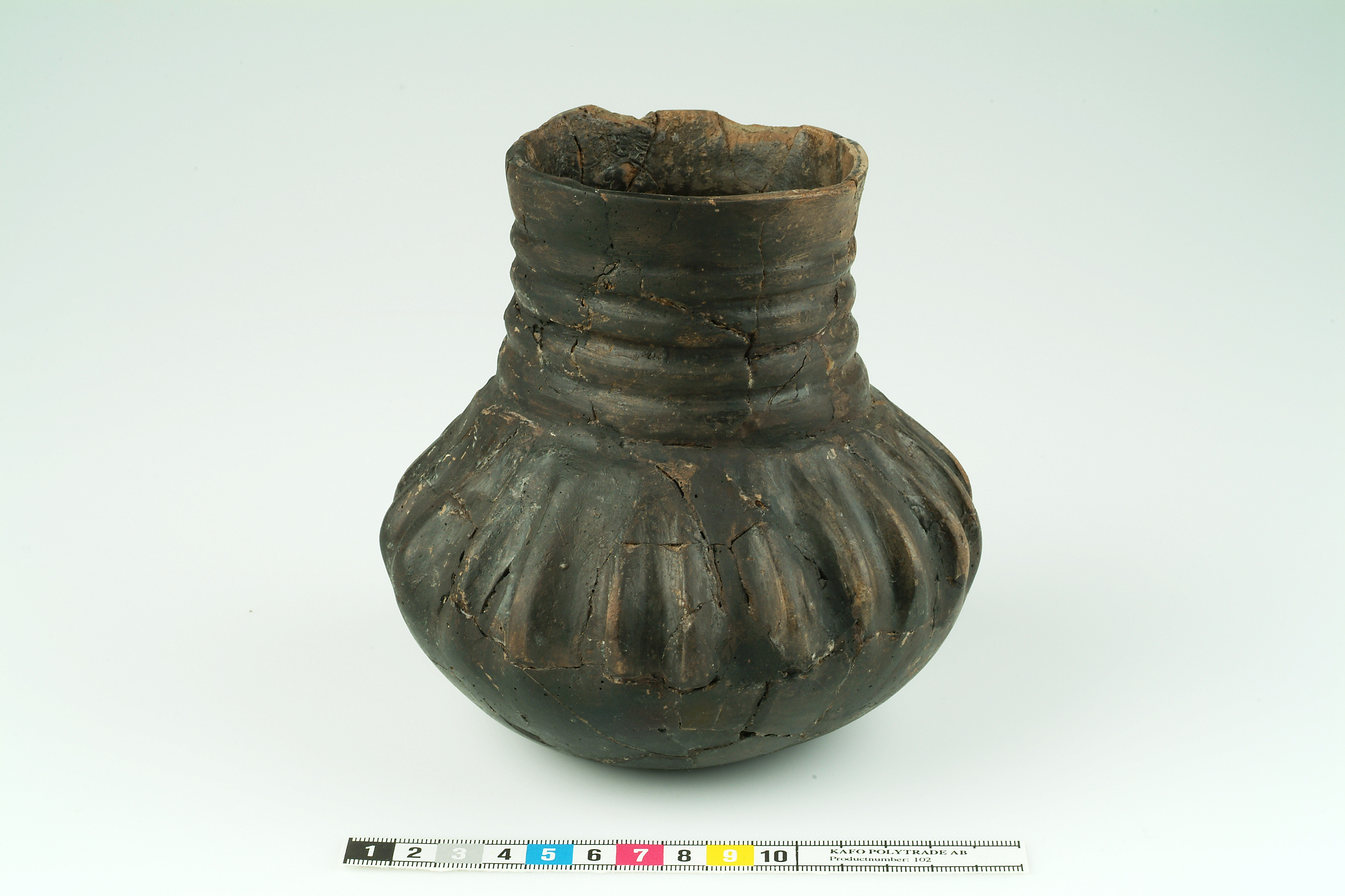 Lerkärl med hög, ganska vid hals. Halsen ornerad med fem djupa och breda räfflor, mellan vilka ses fyra uppstående valkar. Buken är ornerad med likande dekor med ribbor, fast vertikalt lagd.
