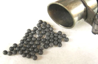 Runda hagel gjutna i mörkt bly, diam ca 2 mm.