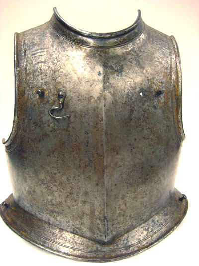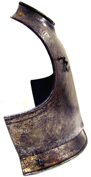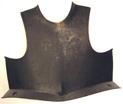 Drivet ur ett stycke stålplåt, utsidan slipad med rester av förgyllning. Driven svagt spesig mittås. Rundade urtagningar för hals och armar med omvikta, rundsmidda kanter. 10 mm in en ristad kantlinje. Nertill krage, utåt vinklad 45 grader, b 40 mm, med i var sida en utstående nit, för lårstycket. I var sida över bröstet en tapp, genomborrad från sidan och bredvid denna en hasp, för att fästa ryggharnesket.